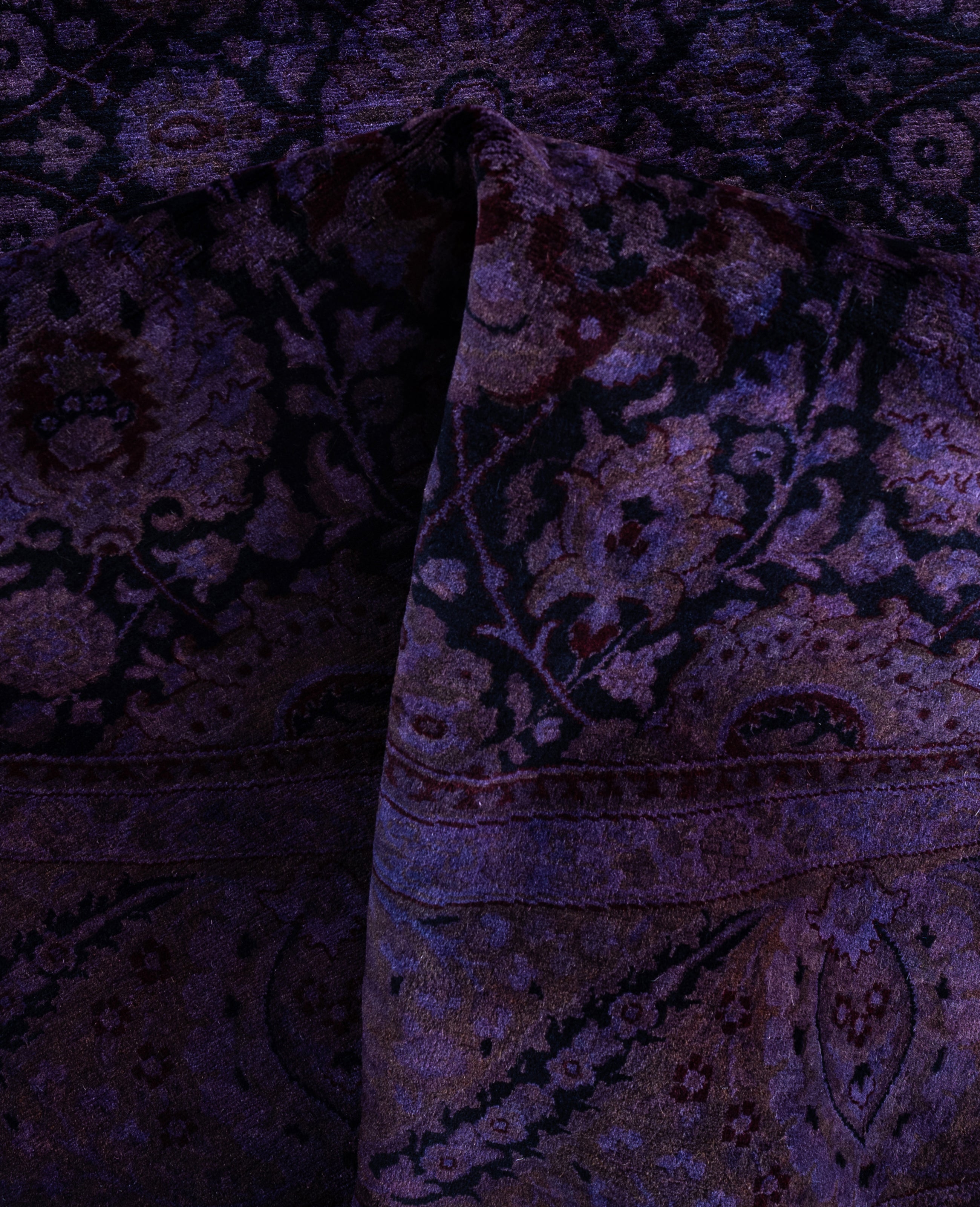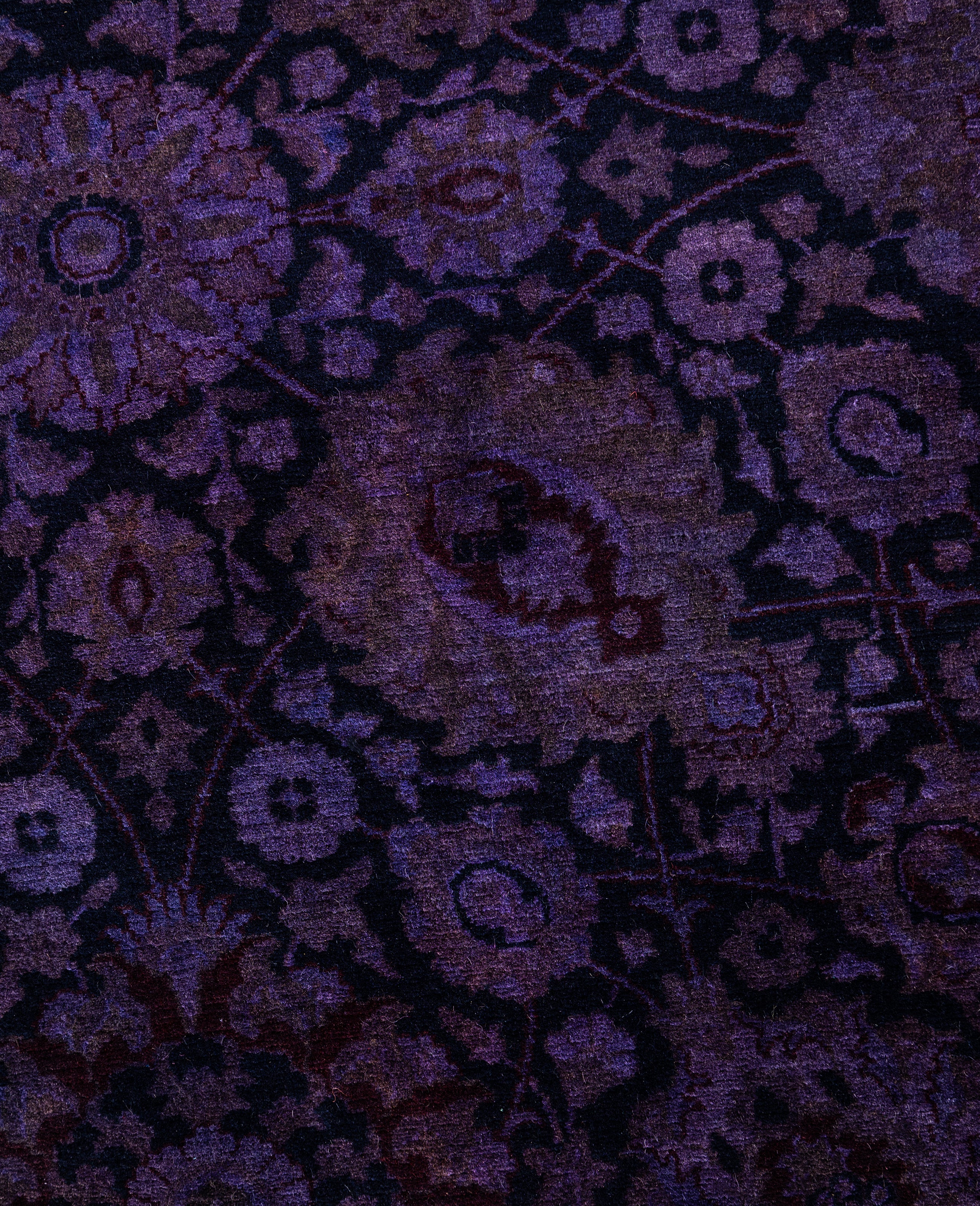 Over-dyed area rugs are created by taking vintage or traditional rugs and applying a vibrant, monochromatic dye over the existing patterns. This technique results in a bold, modern aesthetic while preserving the intricate designs beneath, blending the old with the new. The rugs are often faded and distressed before dyeing, which adds texture and depth to their appearance. The over-dye process breathes new life into worn or antique rugs, giving them a contemporary twist with rich, saturated colors like deep blues, purples, or bright reds. These rugs work well in both eclectic and modern spaces, offering a unique, artistic flair to any room. They provide a dynamic focal point, balancing between traditional craftsmanship and contemporary design trends. Over-dyed rugs are perfect for those looking to add a pop of color and character to their home decor.