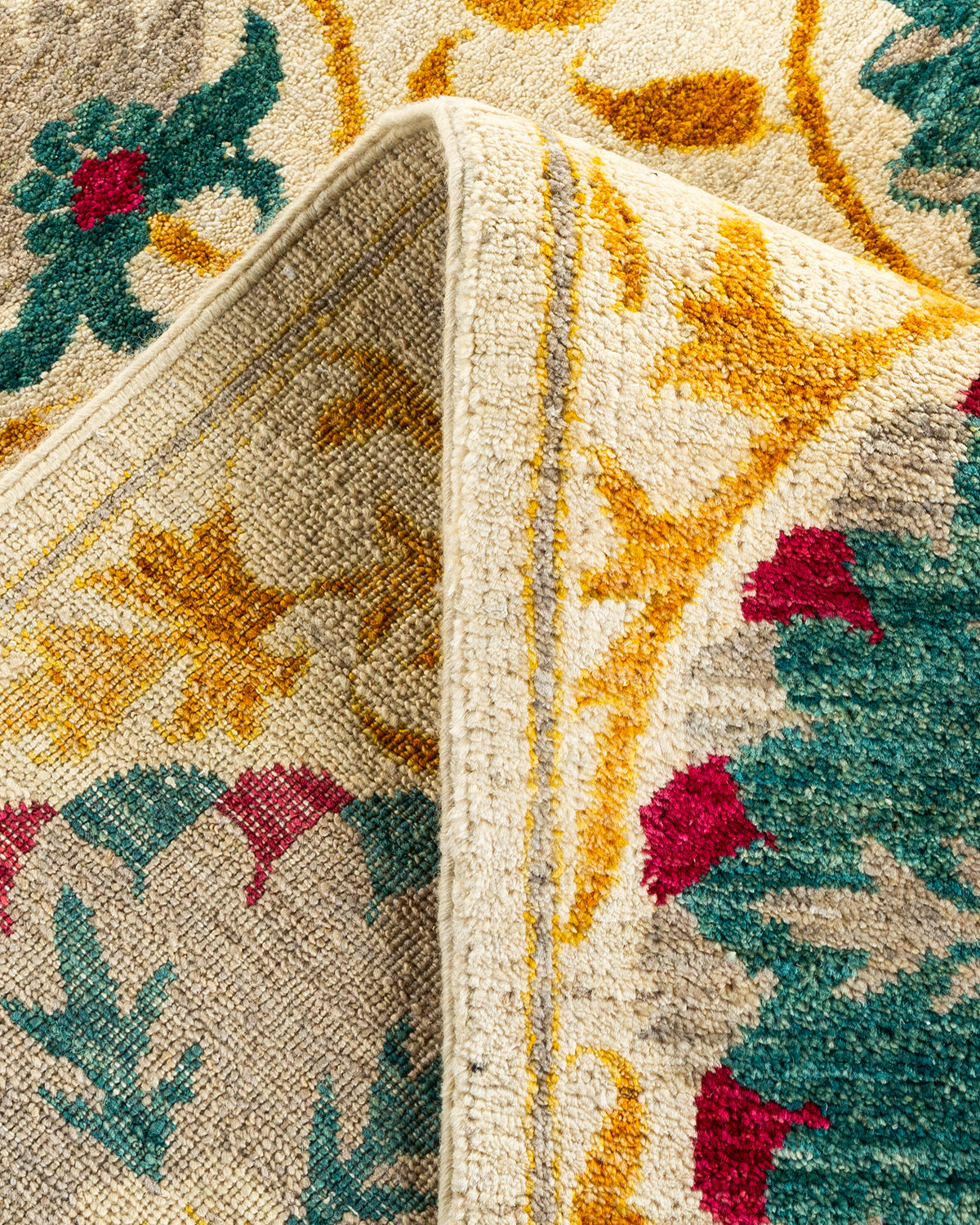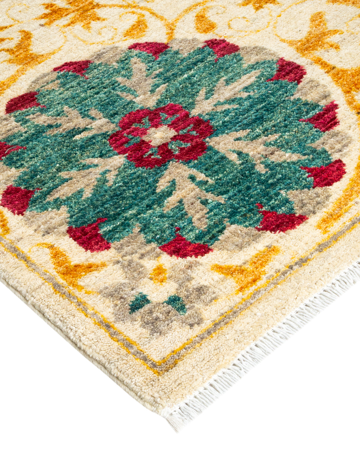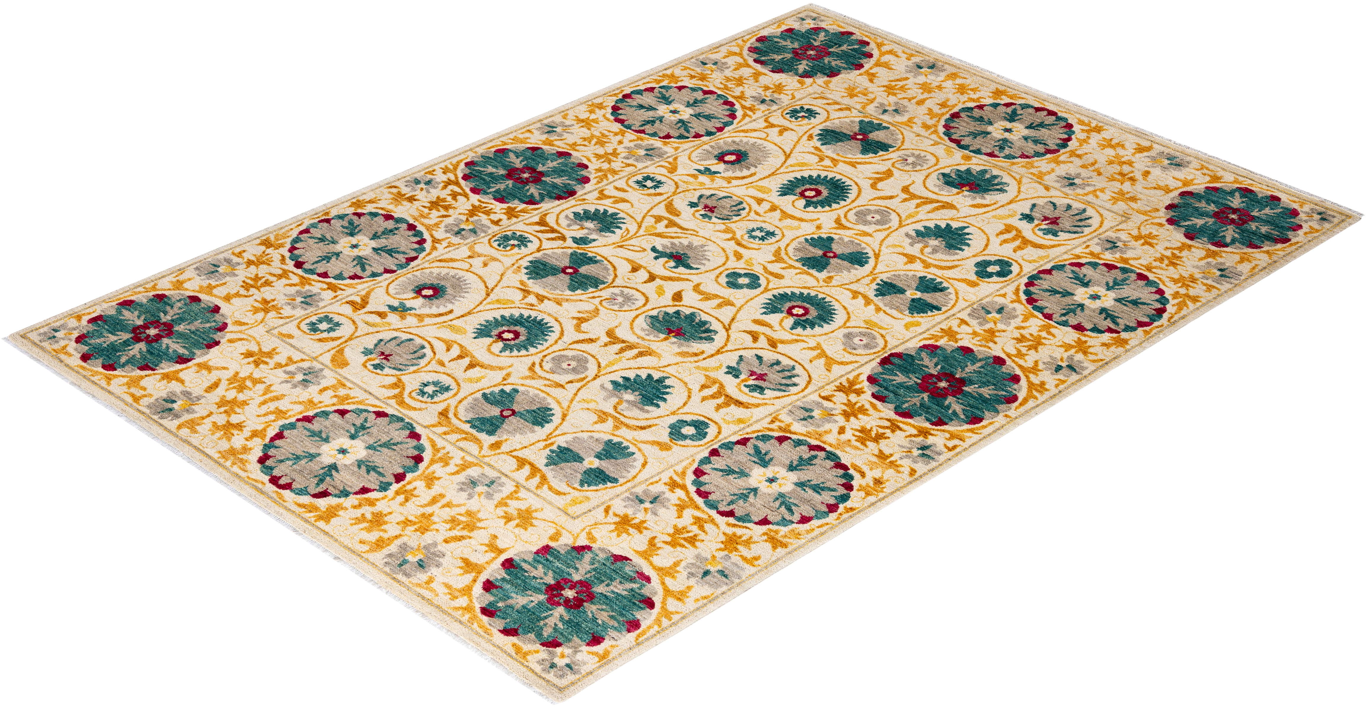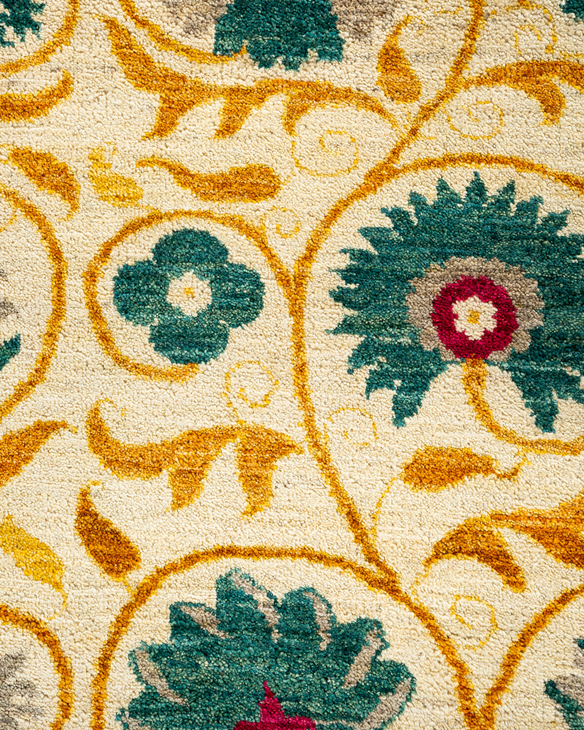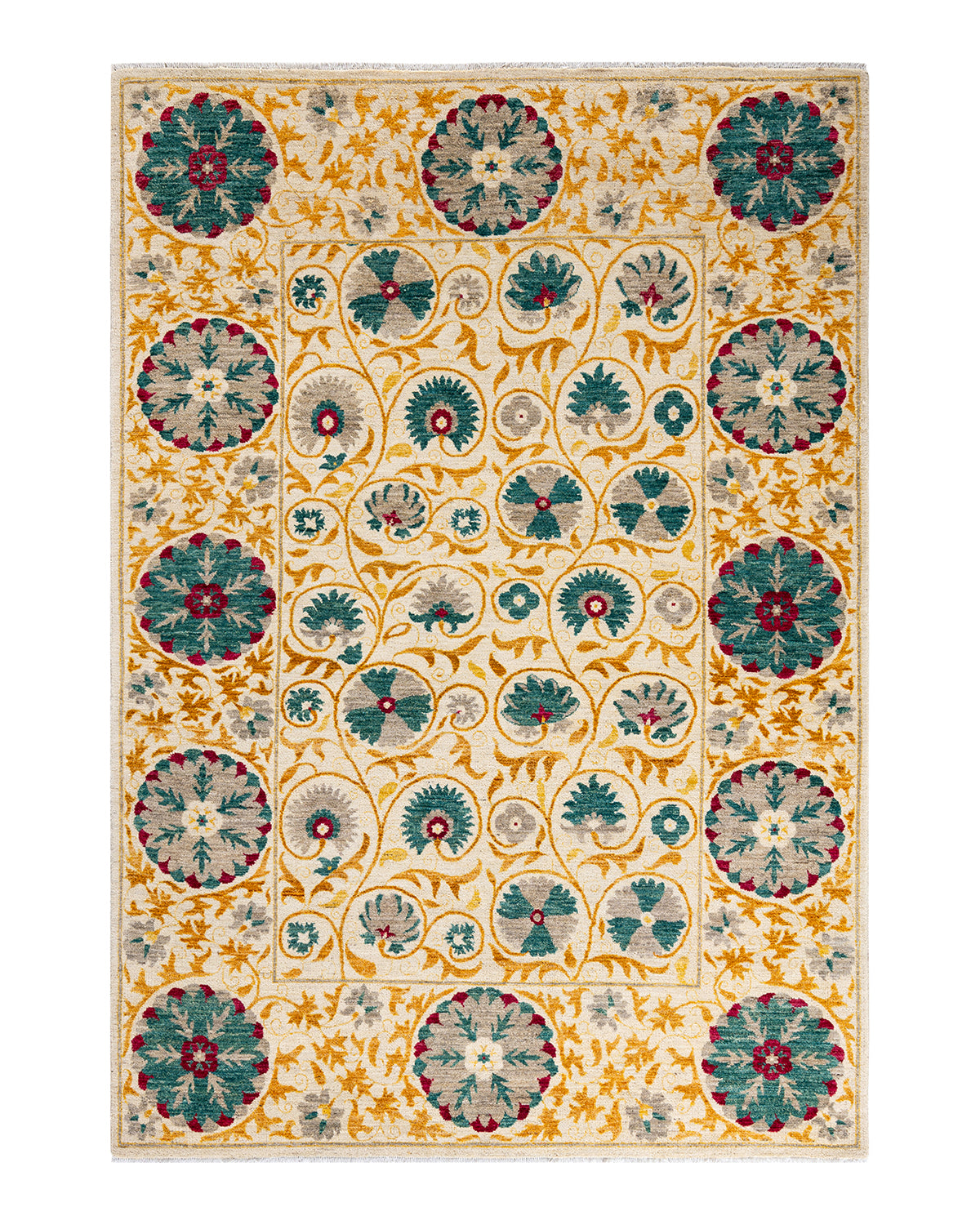 The meticulous art of hand-embroidered textiles from Uzbekistan tribes inspired the Suzani Collection of rugs. Bold motifs, particularly pomegranates, the sun, and the moon, are frequent elements, their simple yet compelling designs made even more spectacular in wool and silk. Once traditional pieces of a dowry, these rugs will easily become part of families for years to come.