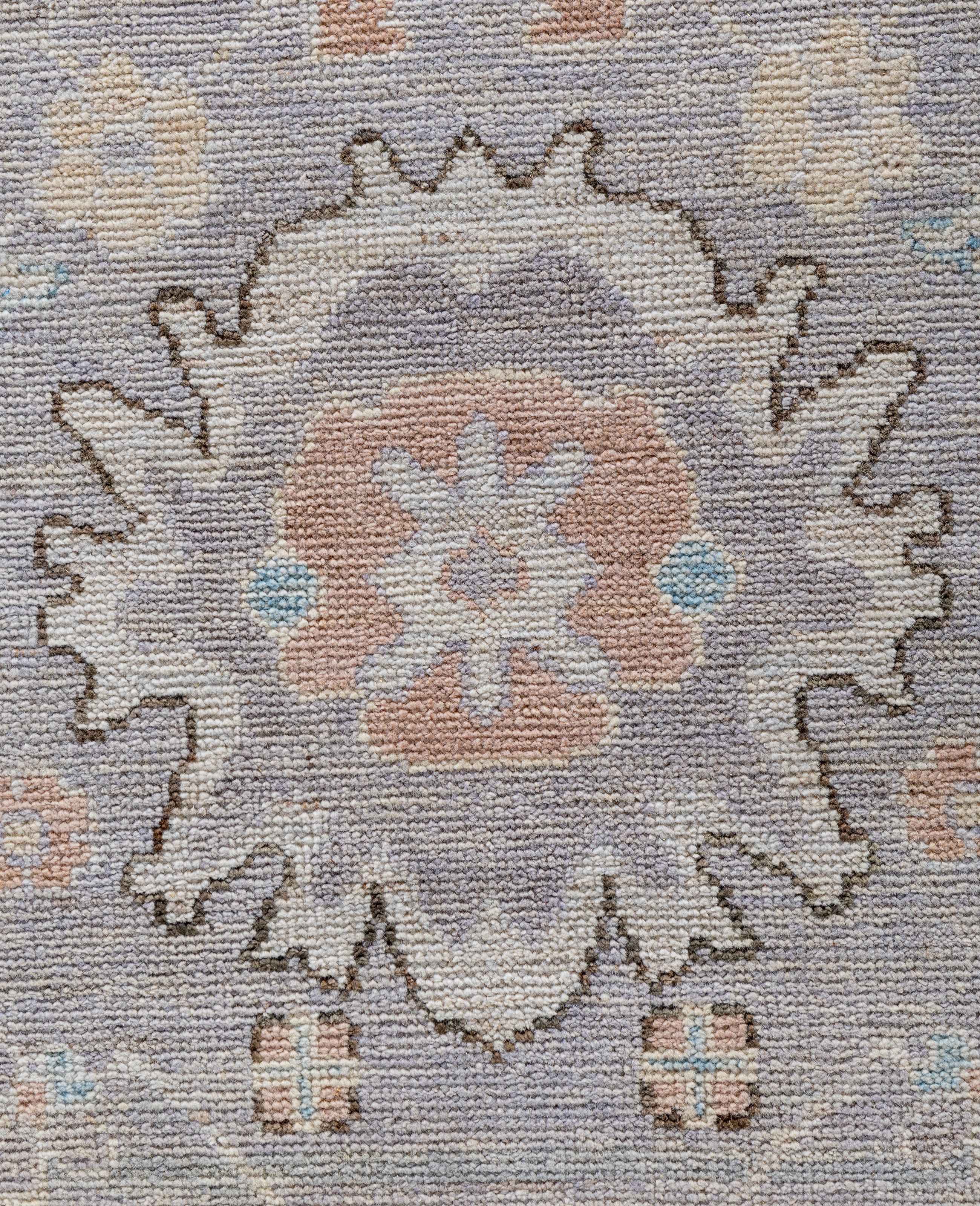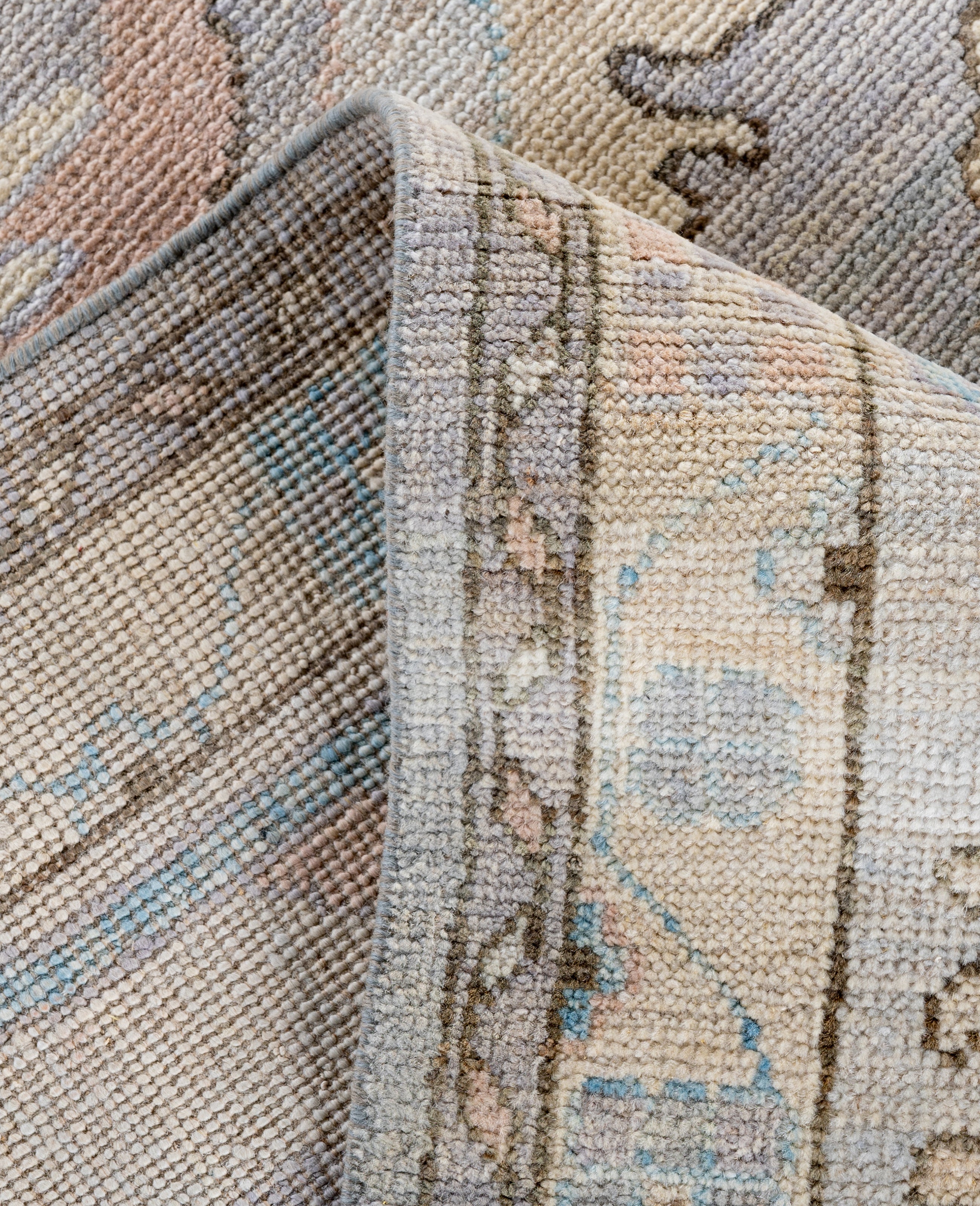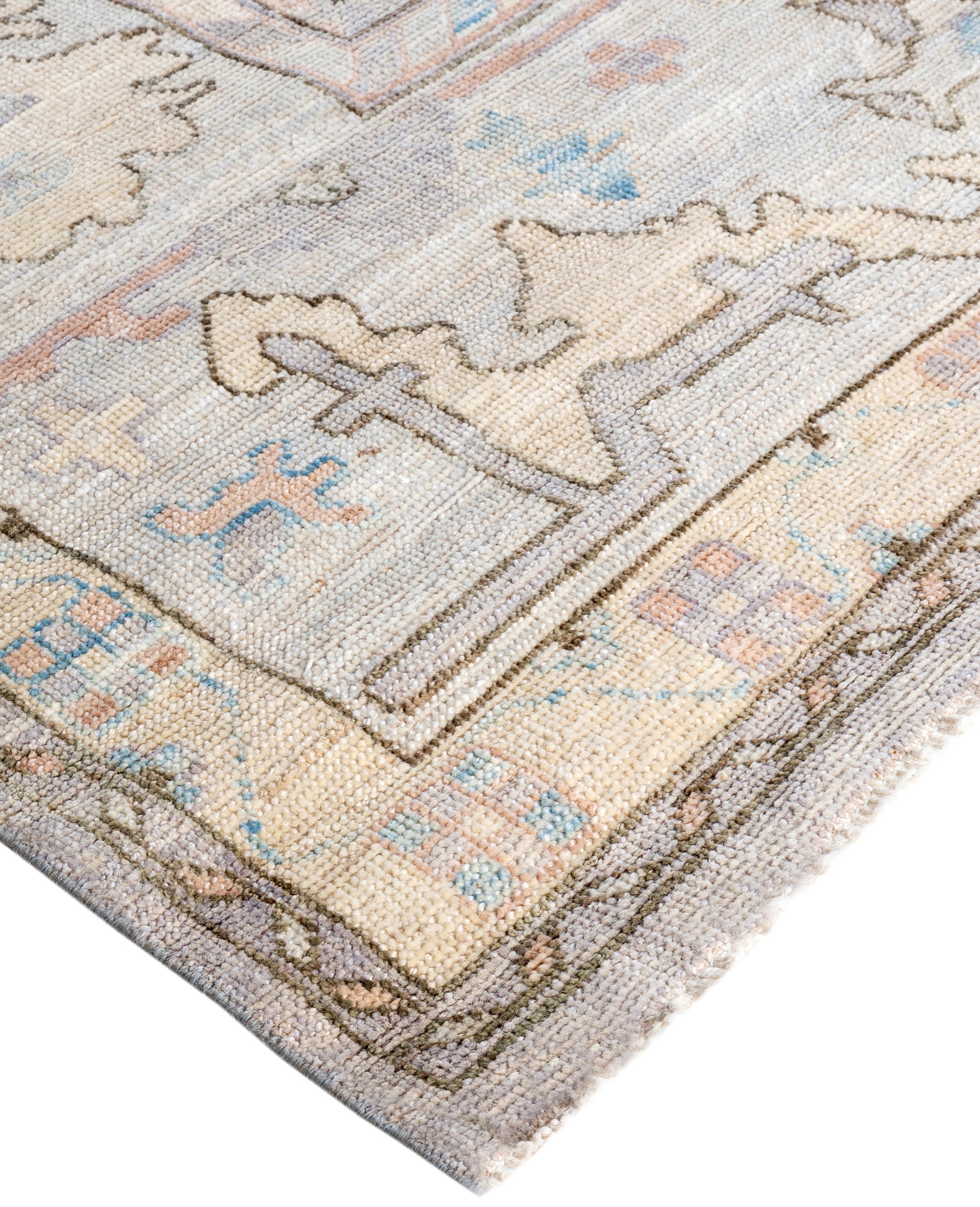 Oushak rugs are known for their soft, muted color palettes and large-scale, flowing designs. They often feature soft tones like beige, cream, gold, and light blue, with motifs that include palmettes, vines, and geometric shapes. These rugs are distinguished by their loose, open patterns, giving them an airy and elegant feel. Originating from the town of Oushak, they emphasize simplicity and a more relaxed aesthetic compared to other ornate designs. Hand-knotted using high-quality wool, Oushak rugs are celebrated for their luxurious texture and durability. Their timeless, understated beauty makes them popular in both traditional and contemporary interiors.