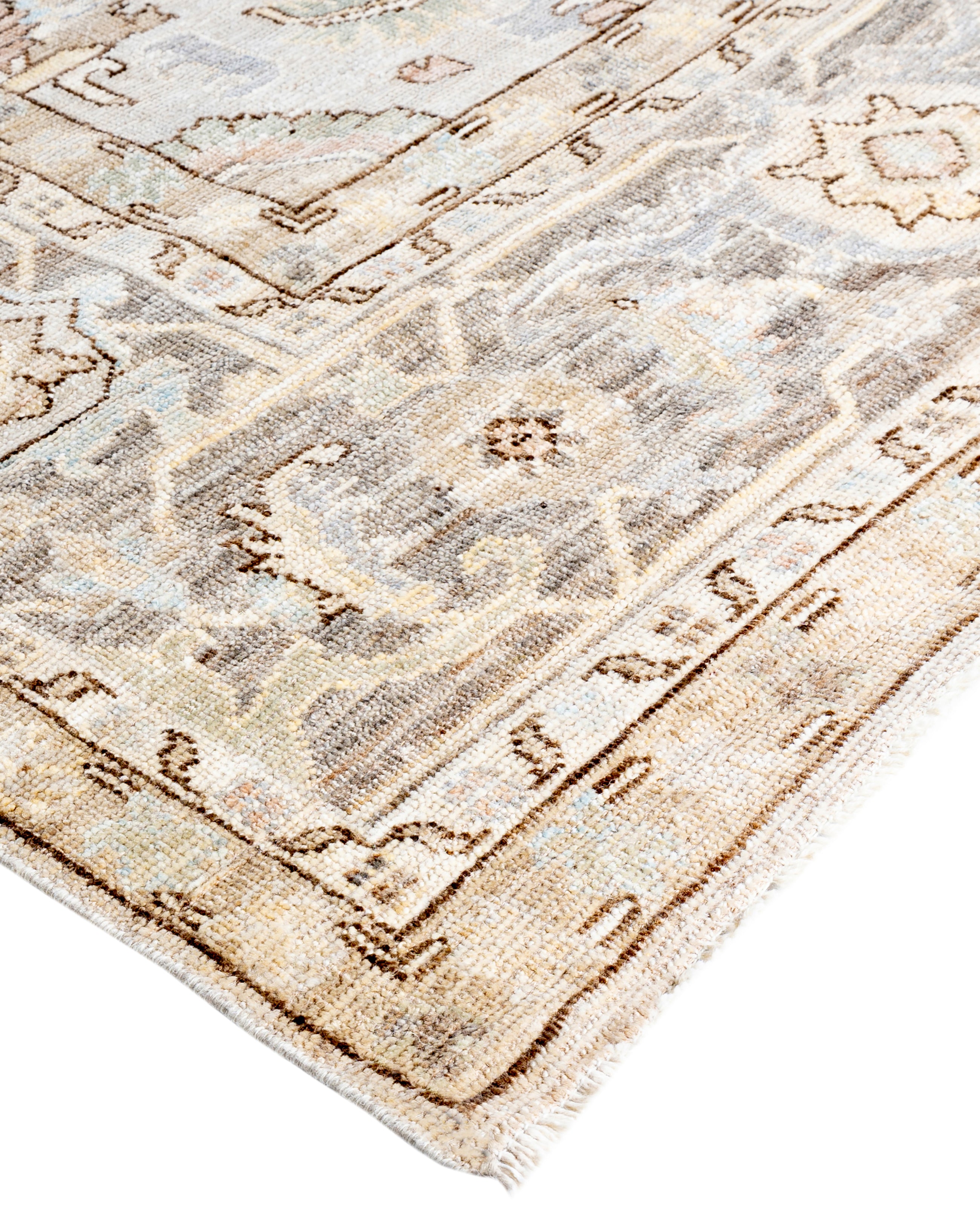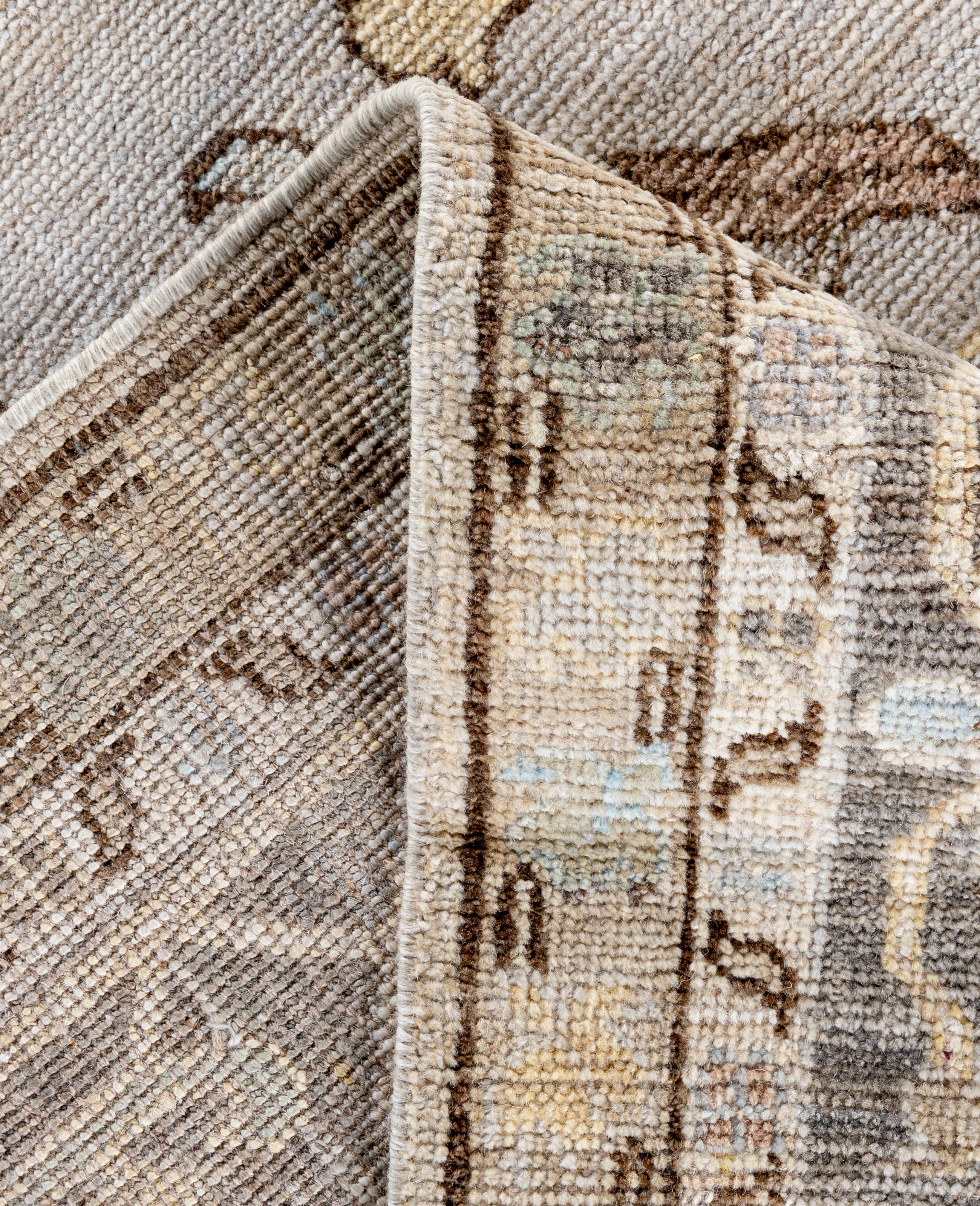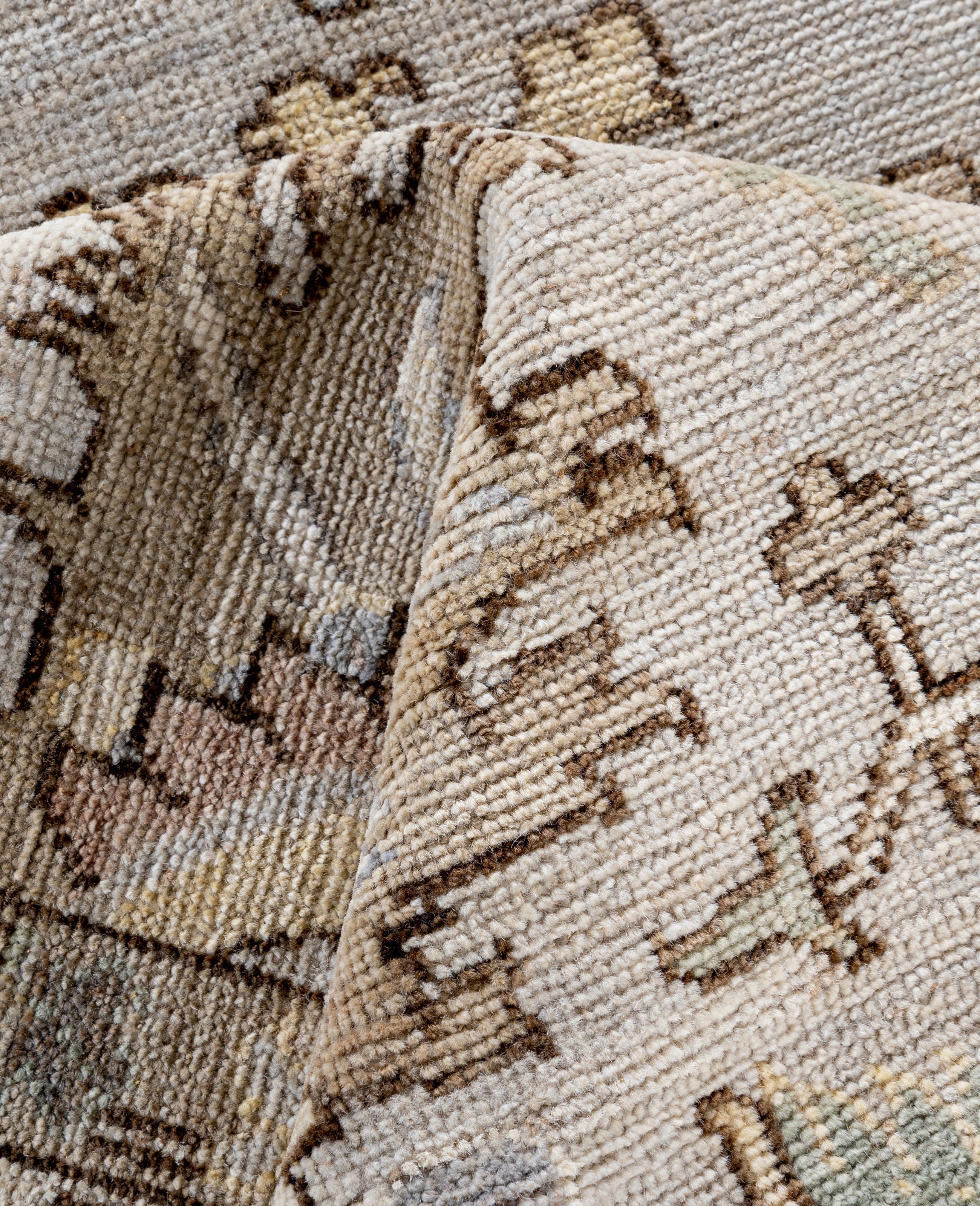 Oushak rugs are known for their soft, muted color palettes and large-scale, flowing designs. They often feature soft tones like beige, cream, gold, and light blue, with motifs that include palmettes, vines, and geometric shapes. These rugs are distinguished by their loose, open patterns, giving them an airy and elegant feel. Originating from the town of Oushak, they emphasize simplicity and a more relaxed aesthetic compared to other ornate designs. Hand-knotted using high-quality wool, Oushak rugs are celebrated for their luxurious texture and durability. Their timeless, understated beauty makes them popular in both traditional and contemporary interiors.