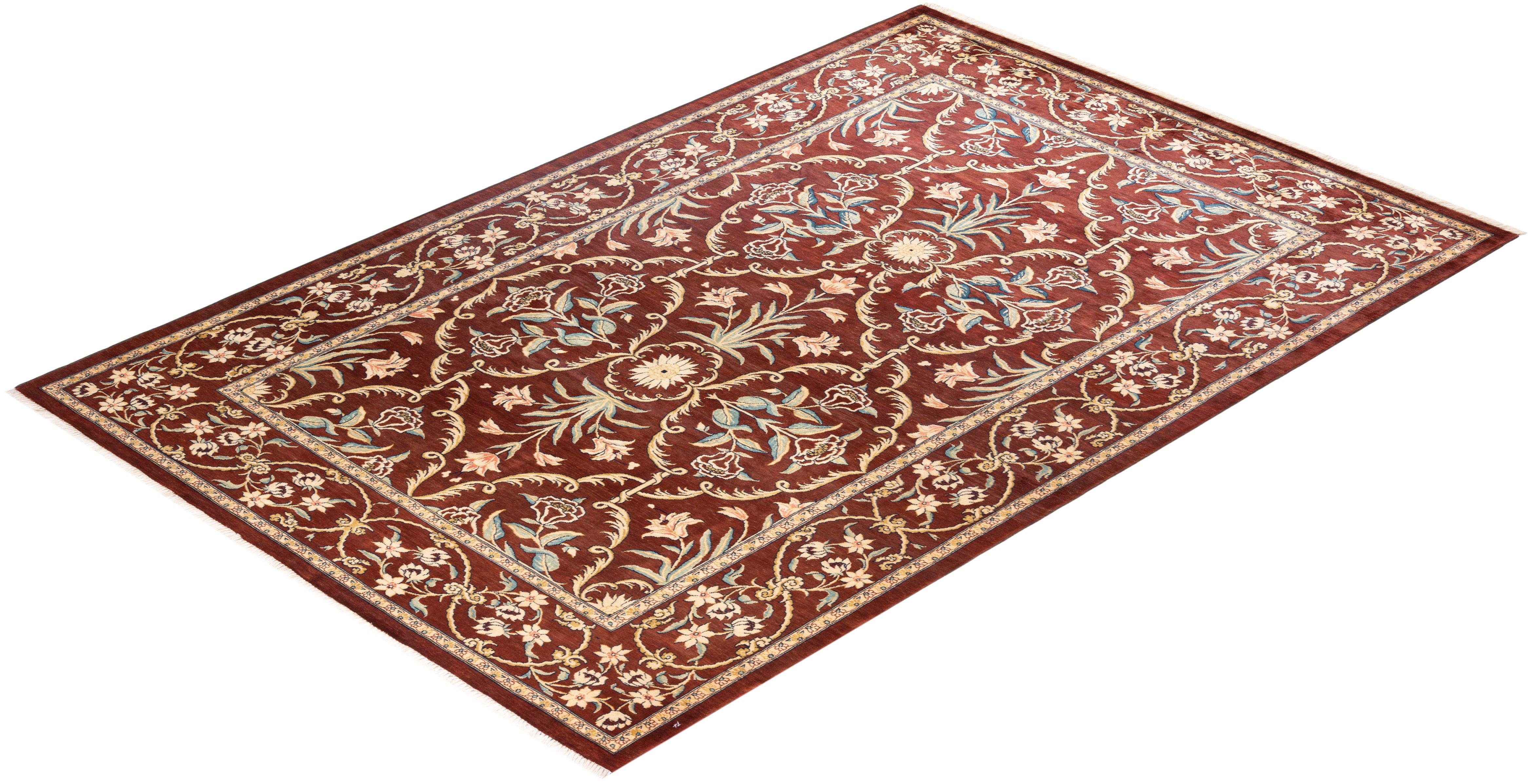 Contemporary Hand Knotted Eclectic Oriental Red Area Rug 5' 9" x 8' 10"