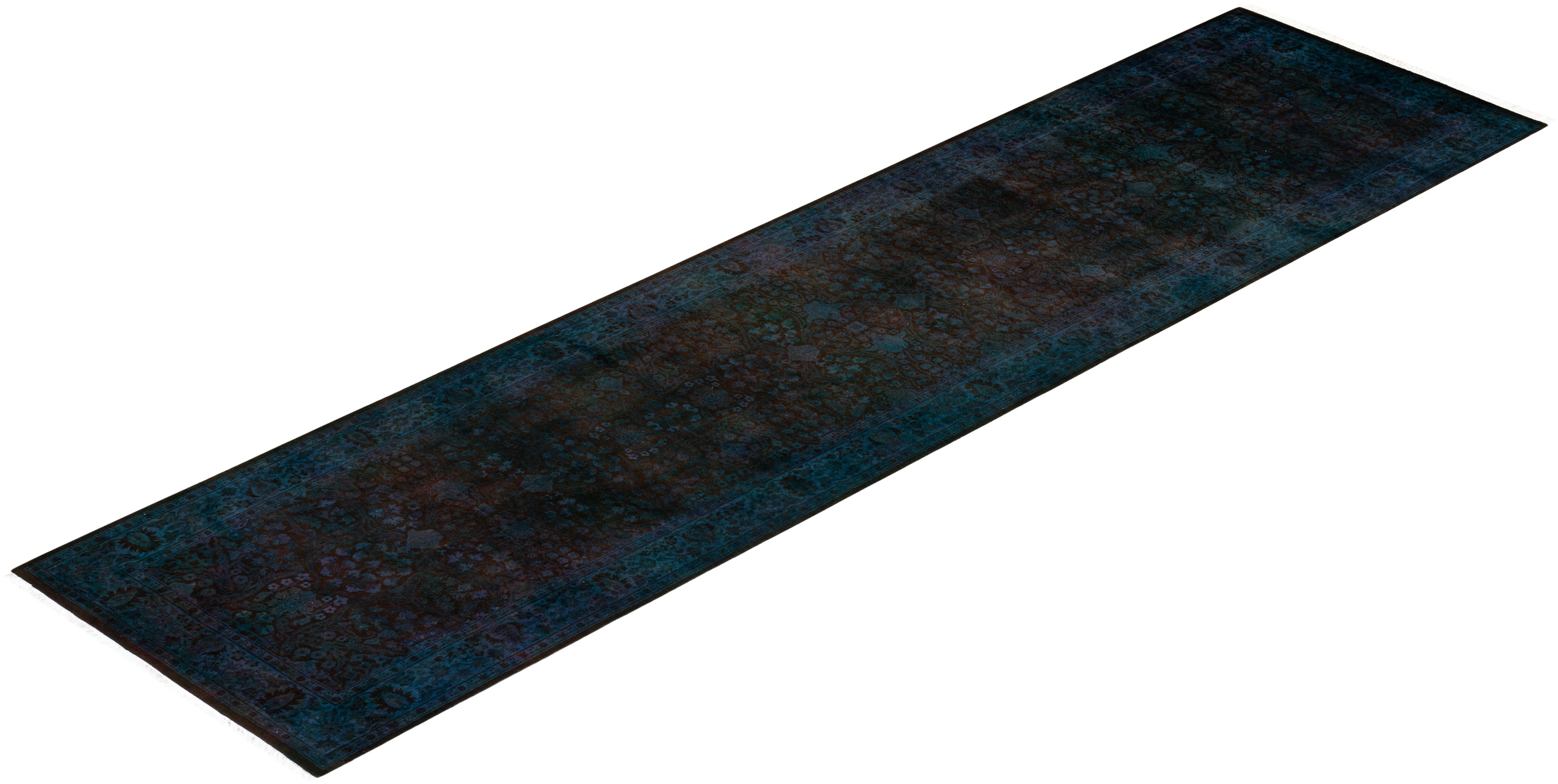 Contemporary Hand Knotted Overdyed Blue Runner 3' 1" x 12' 4"