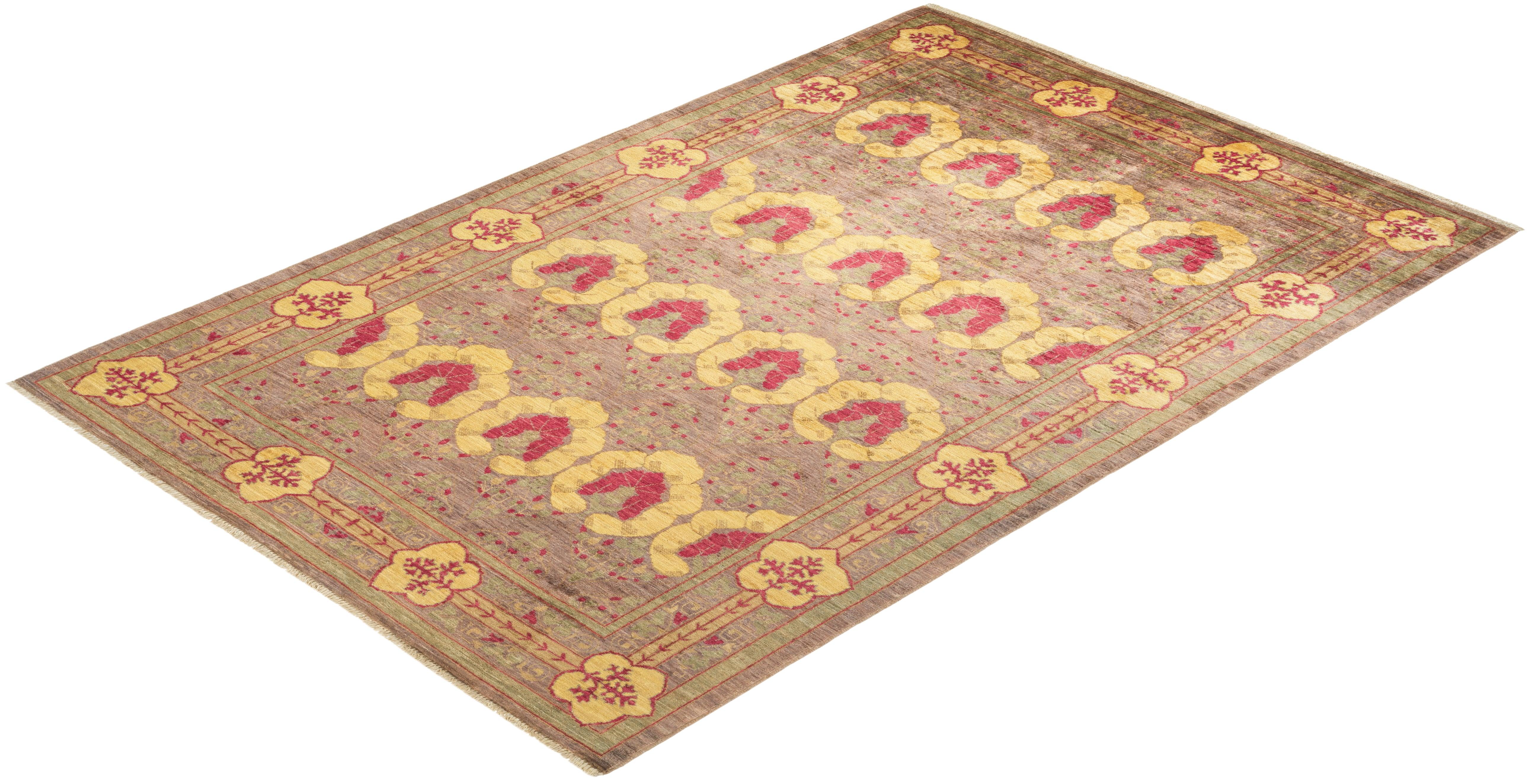 Contemporary Hand Knotted Arts & Crafts Floral Beige Area Rug 6' 1" x 8' 9"