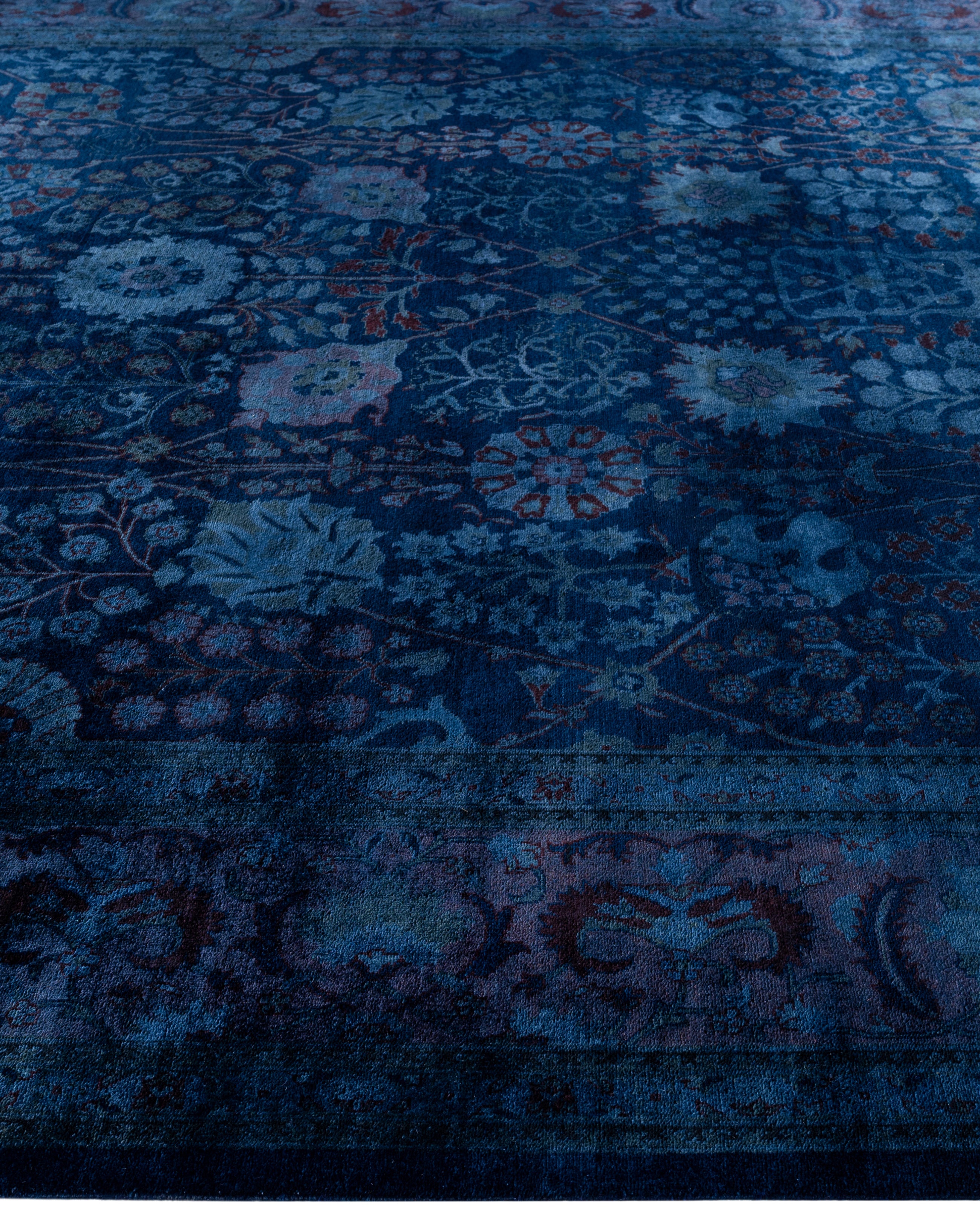 Over-dyed area rugs are created by taking vintage or traditional rugs and applying a vibrant, monochromatic dye over the existing patterns. This technique results in a bold, modern aesthetic while preserving the intricate designs beneath, blending the old with the new. The rugs are often faded and distressed before dyeing, which adds texture and depth to their appearance. The over-dye process breathes new life into worn or antique rugs, giving them a contemporary twist with rich, saturated colors like deep blues, purples, or bright reds. These rugs work well in both eclectic and modern spaces, offering a unique, artistic flair to any room. They provide a dynamic focal point, balancing between traditional craftsmanship and contemporary design trends. Over-dyed rugs are perfect for those looking to add a pop of color and character to their home decor.