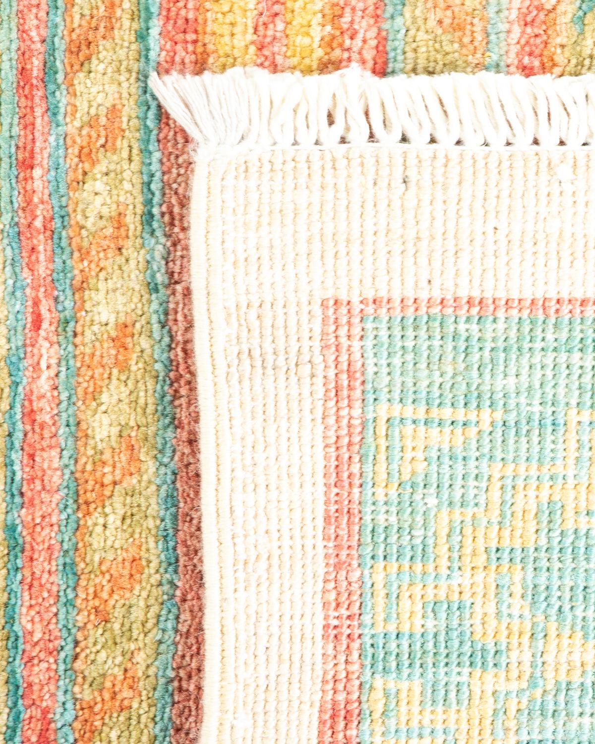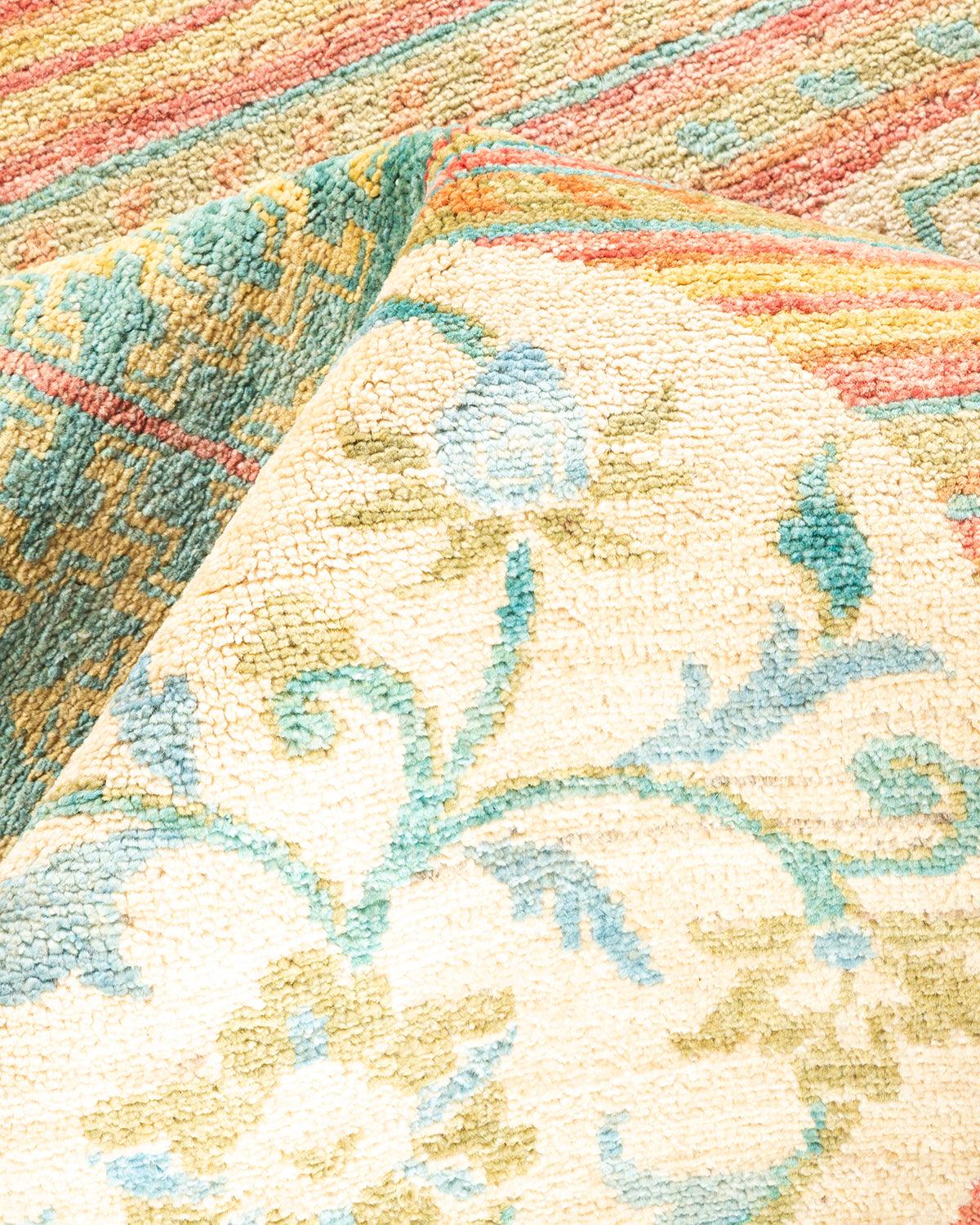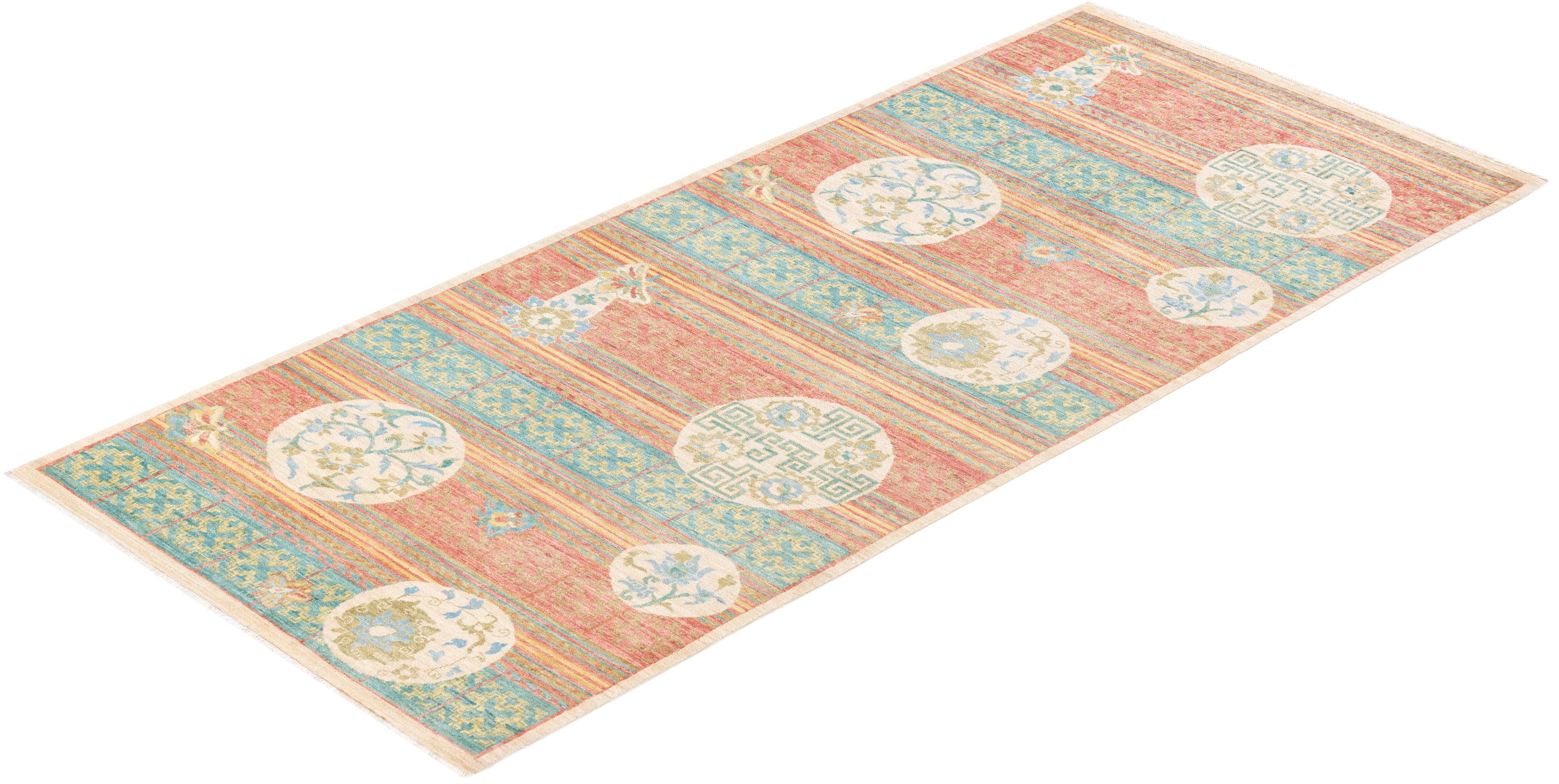 Contemporary Hand Knotted Eclectic Floral Green Runner 4' 4" x 9' 10"