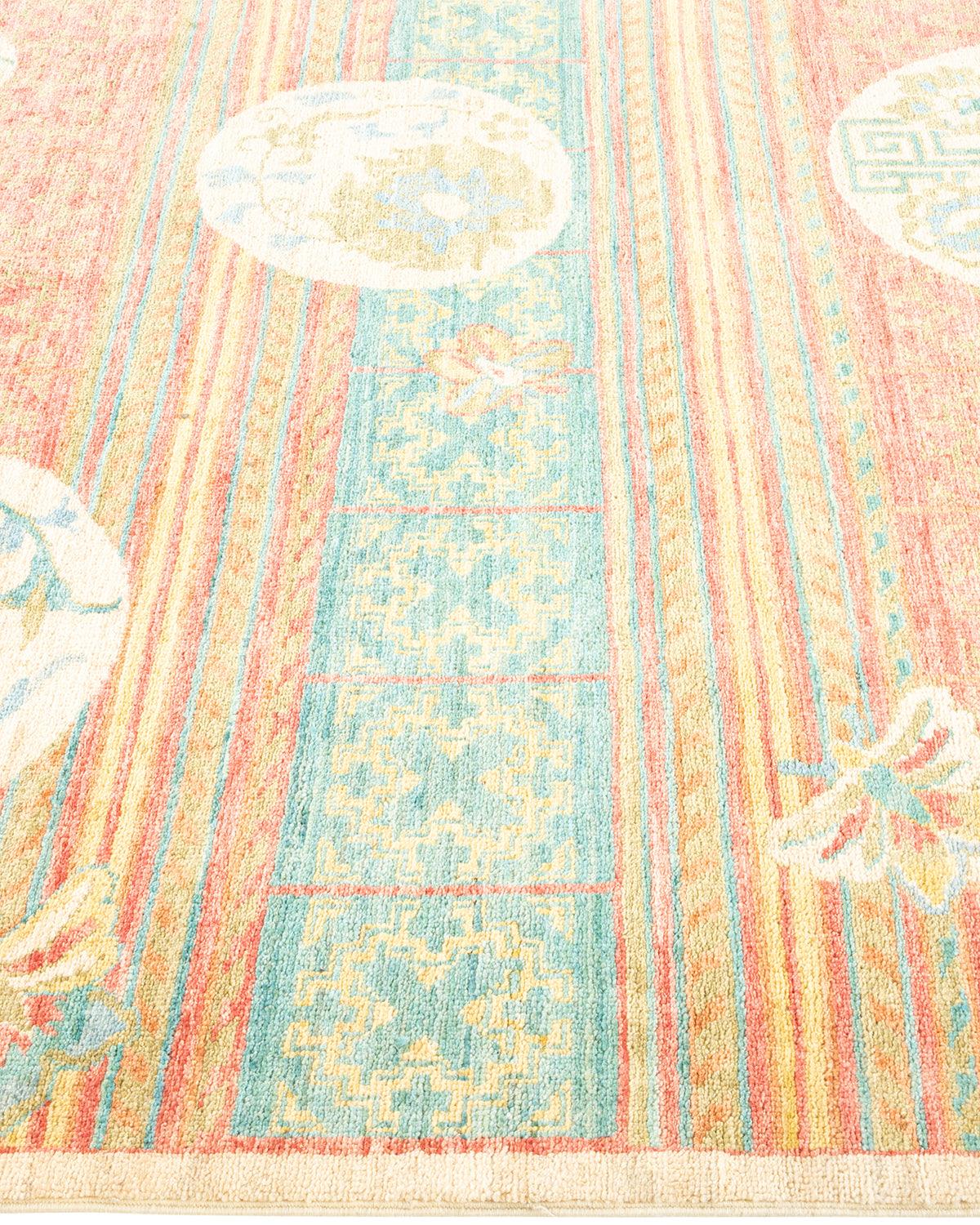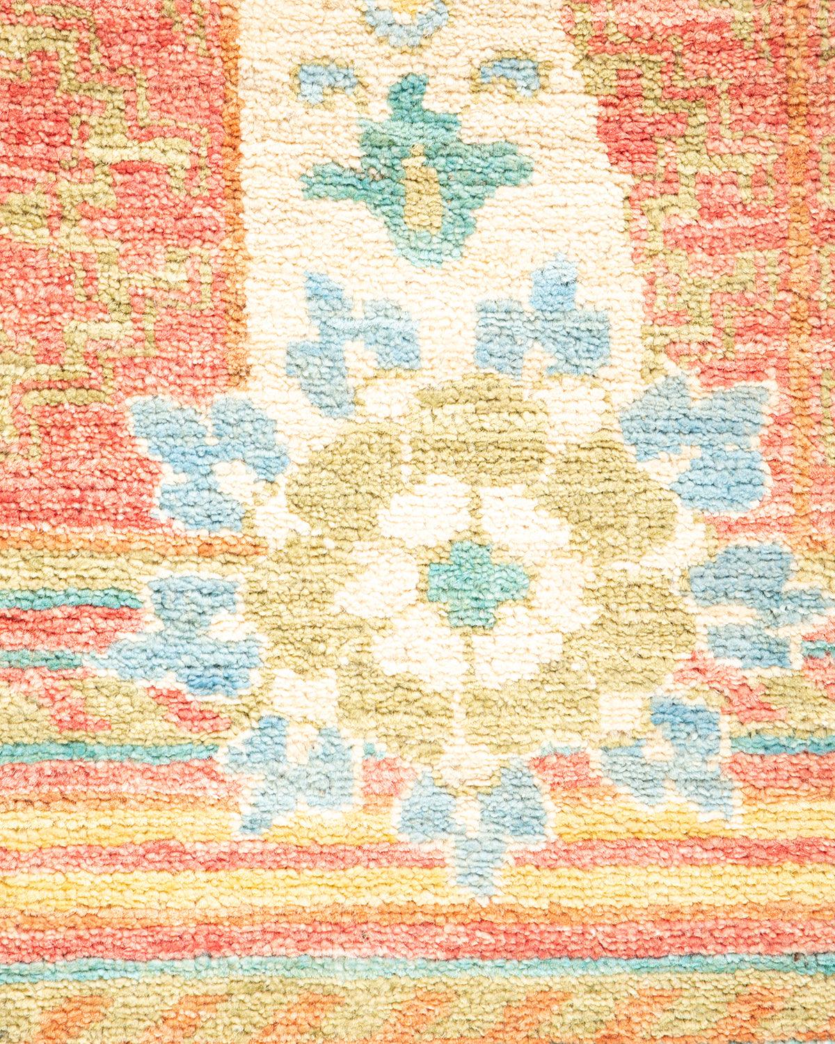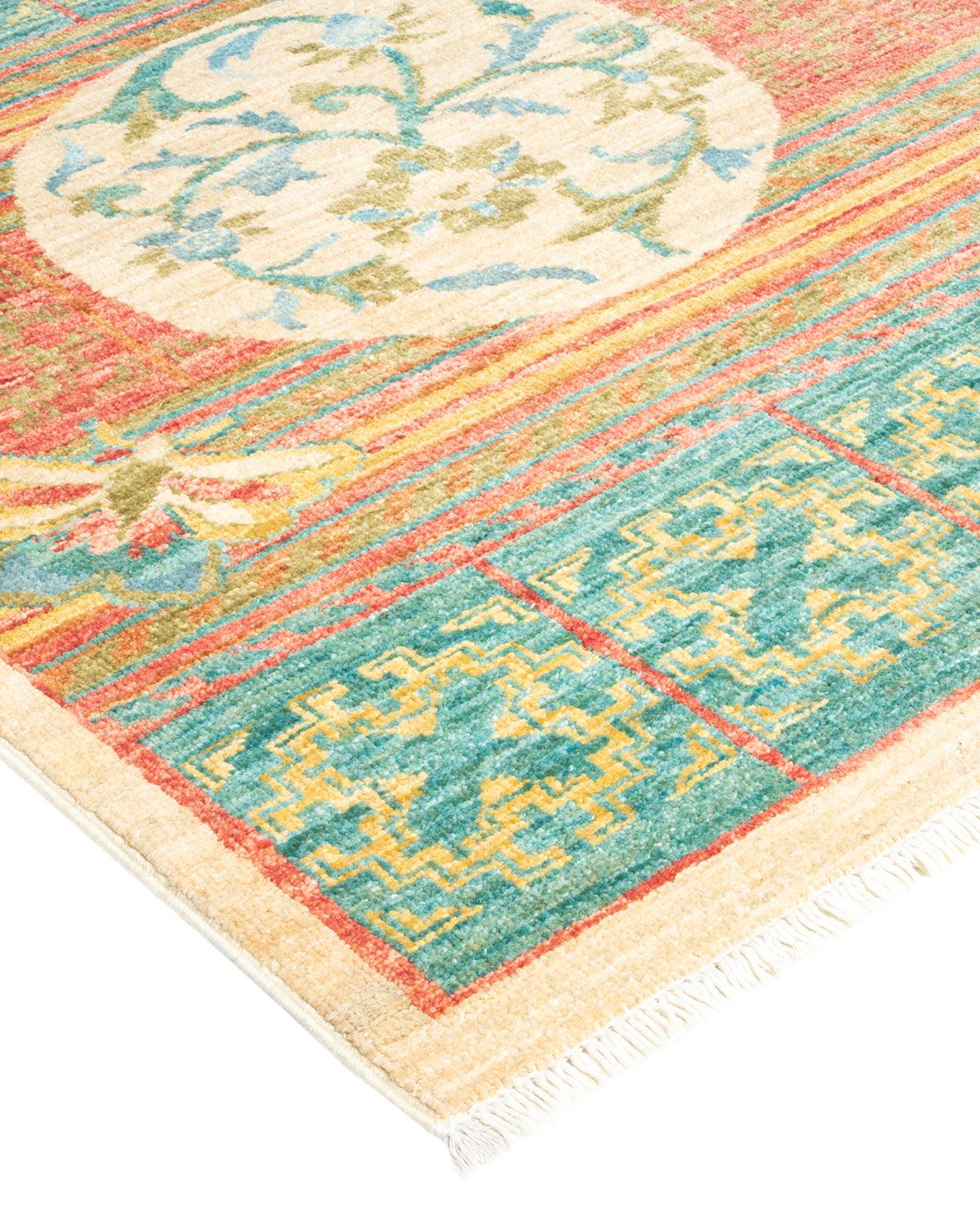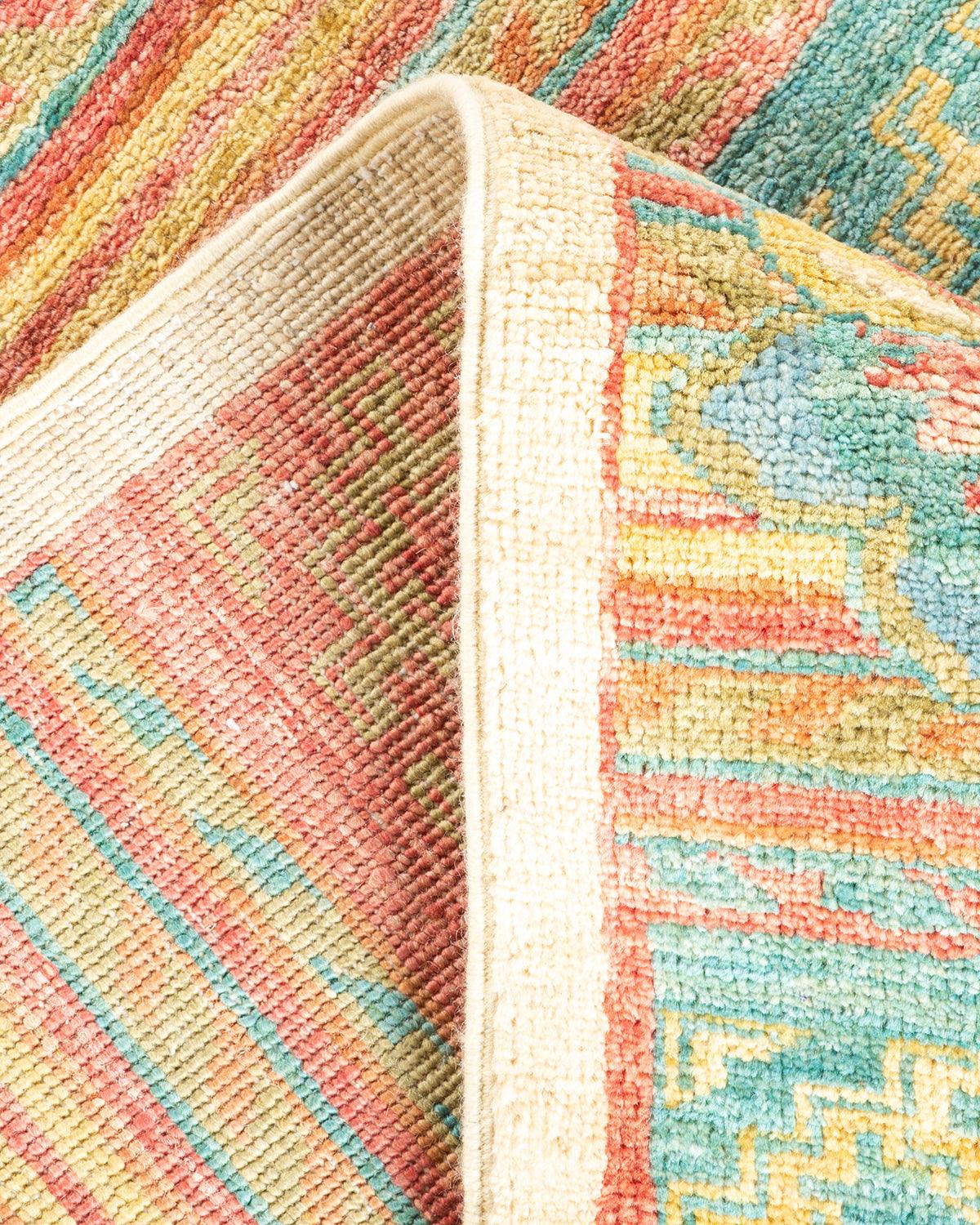 Contemporary Hand Knotted Eclectic Floral Green Runner 4' 4" x 9' 10"