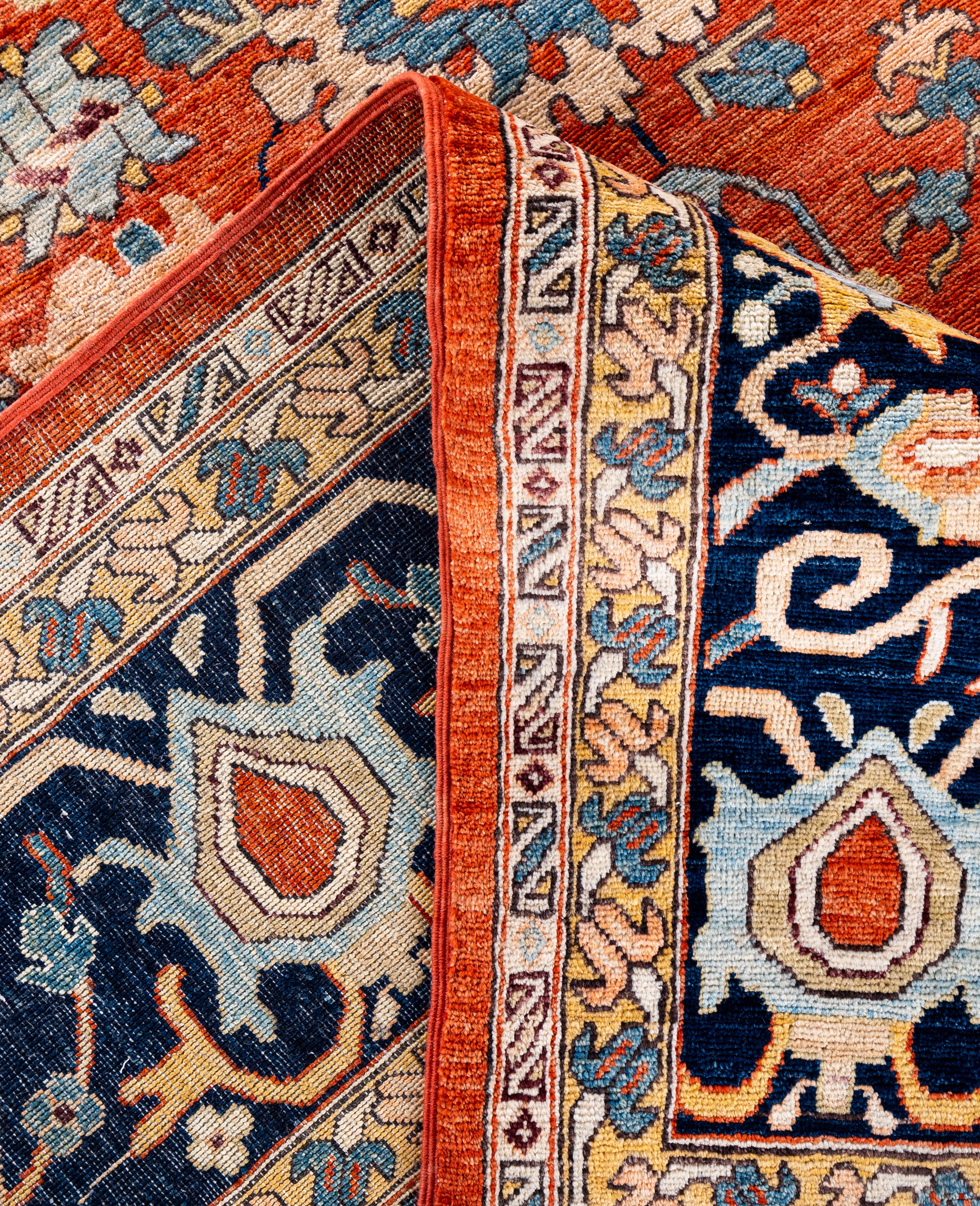 Serapi rugs are known for their bold, geometric designs and rich colors, often featuring a central medallion surrounded by intricate patterns. They typically use a warm, earthy color palette with deep reds, blues, ivory, and occasional greens. The designs emphasize large-scale motifs, including angular vines, leaves, and floral elements, giving the rugs a distinctive, almost architectural appearance. These rugs are hand-knotted and are prized for their durability and high-quality craftsmanship. Their unique aesthetic is attributed to a blend of traditional motifs with more refined, spacious compositions. They are highly sought after by collectors and interior designers for their elegance and timeless appeal.