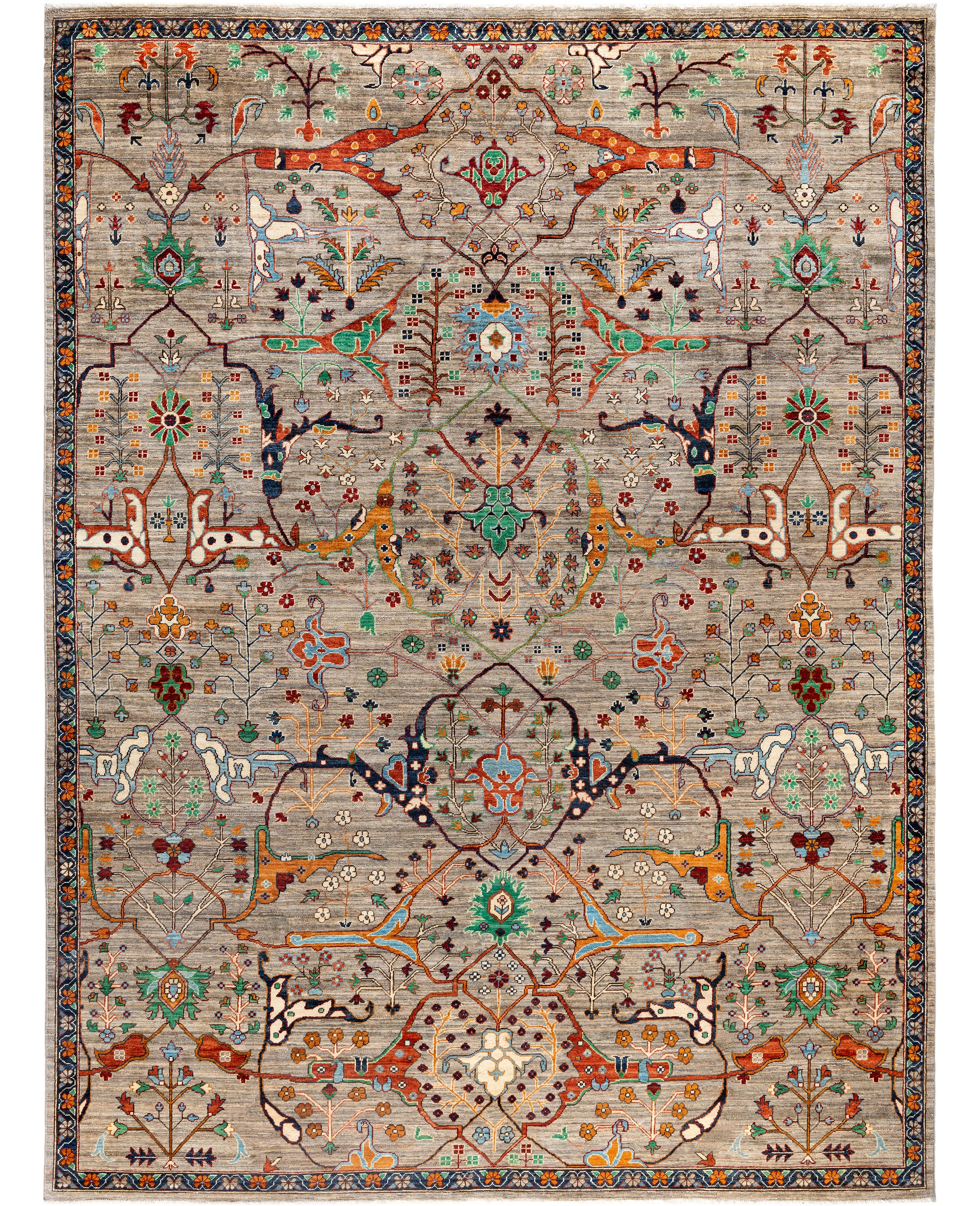 Serapi rugs are known for their bold, geometric designs and rich colors, often featuring a central medallion surrounded by intricate patterns. They typically use a warm, earthy color palette with deep reds, blues, ivory, and occasional greens. The designs emphasize large-scale motifs, including angular vines, leaves, and floral elements, giving the rugs a distinctive, almost architectural appearance. These rugs are hand-knotted and are prized for their durability and high-quality craftsmanship. Their unique aesthetic is attributed to a blend of traditional motifs with more refined, spacious compositions. They are highly sought after by collectors and interior designers for their elegance and timeless appeal.