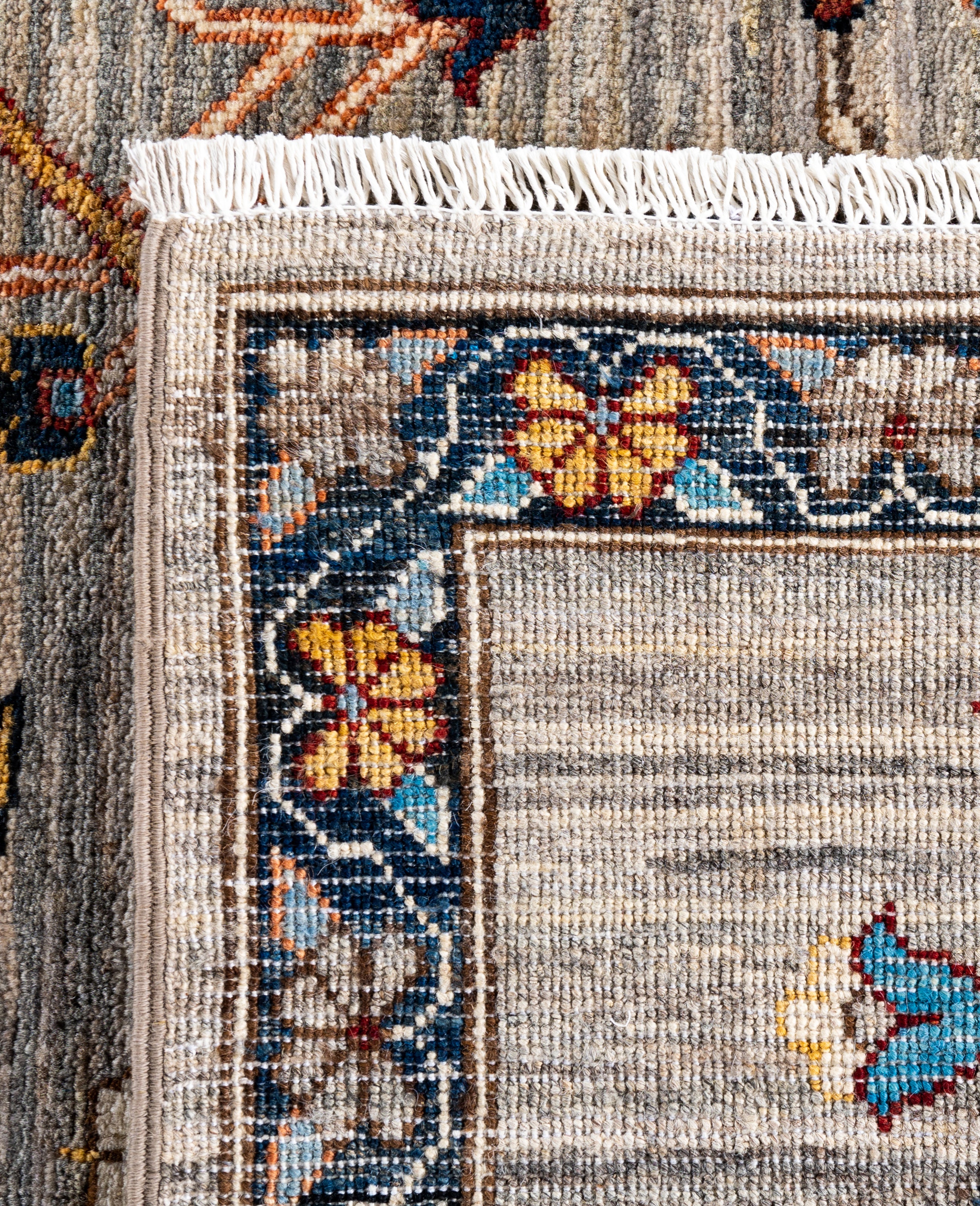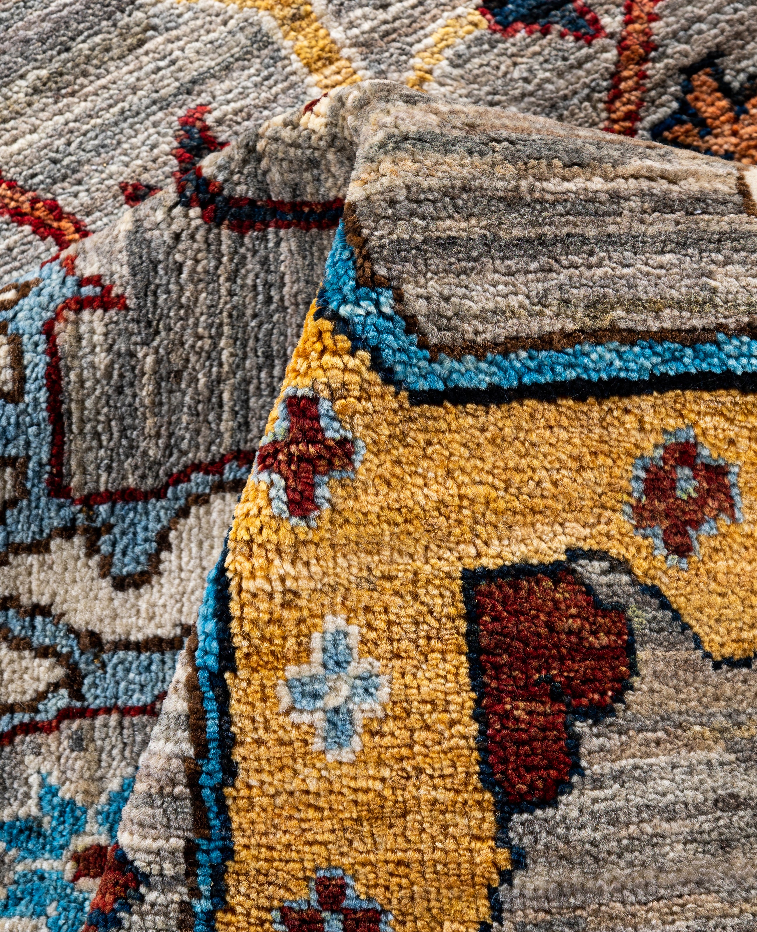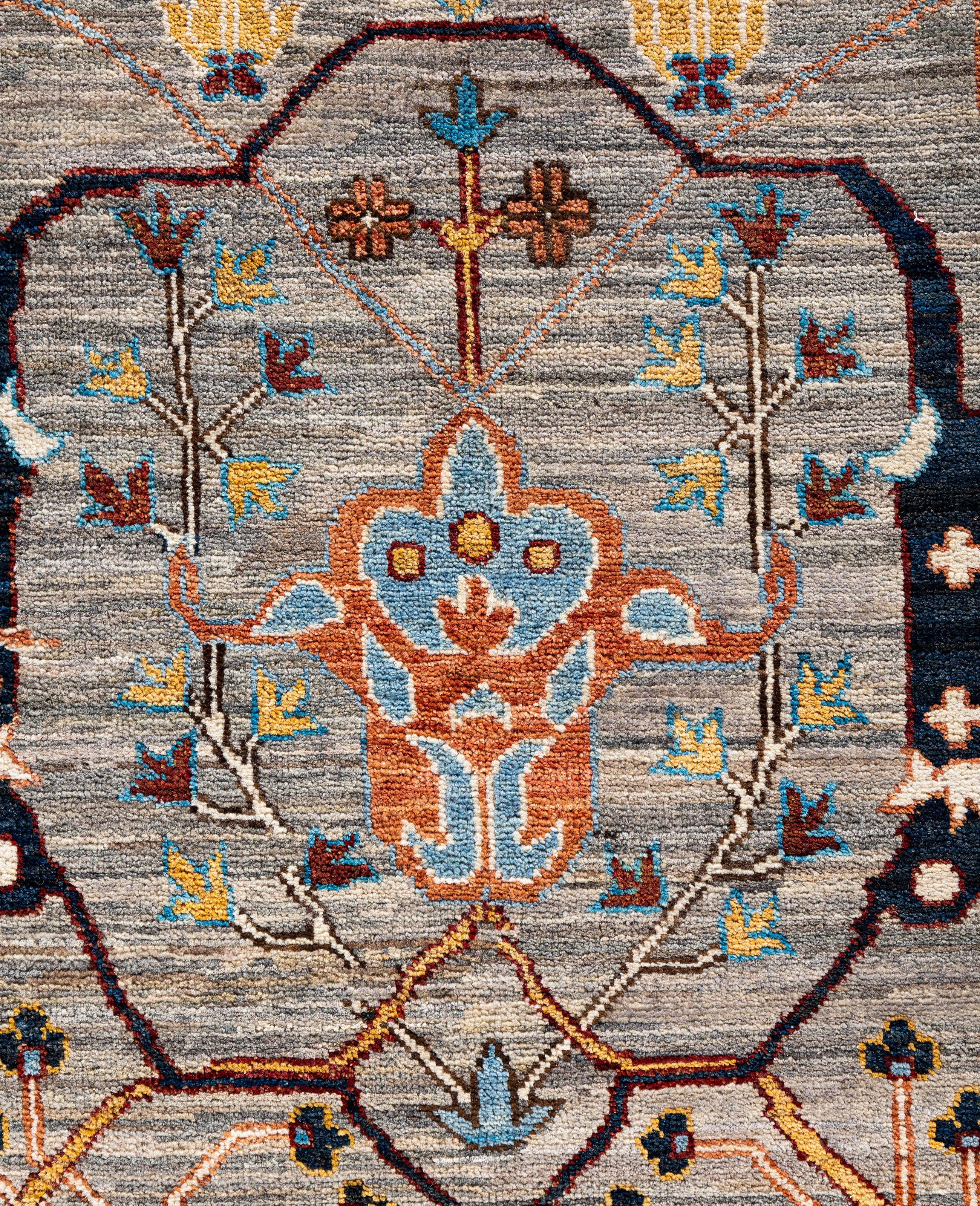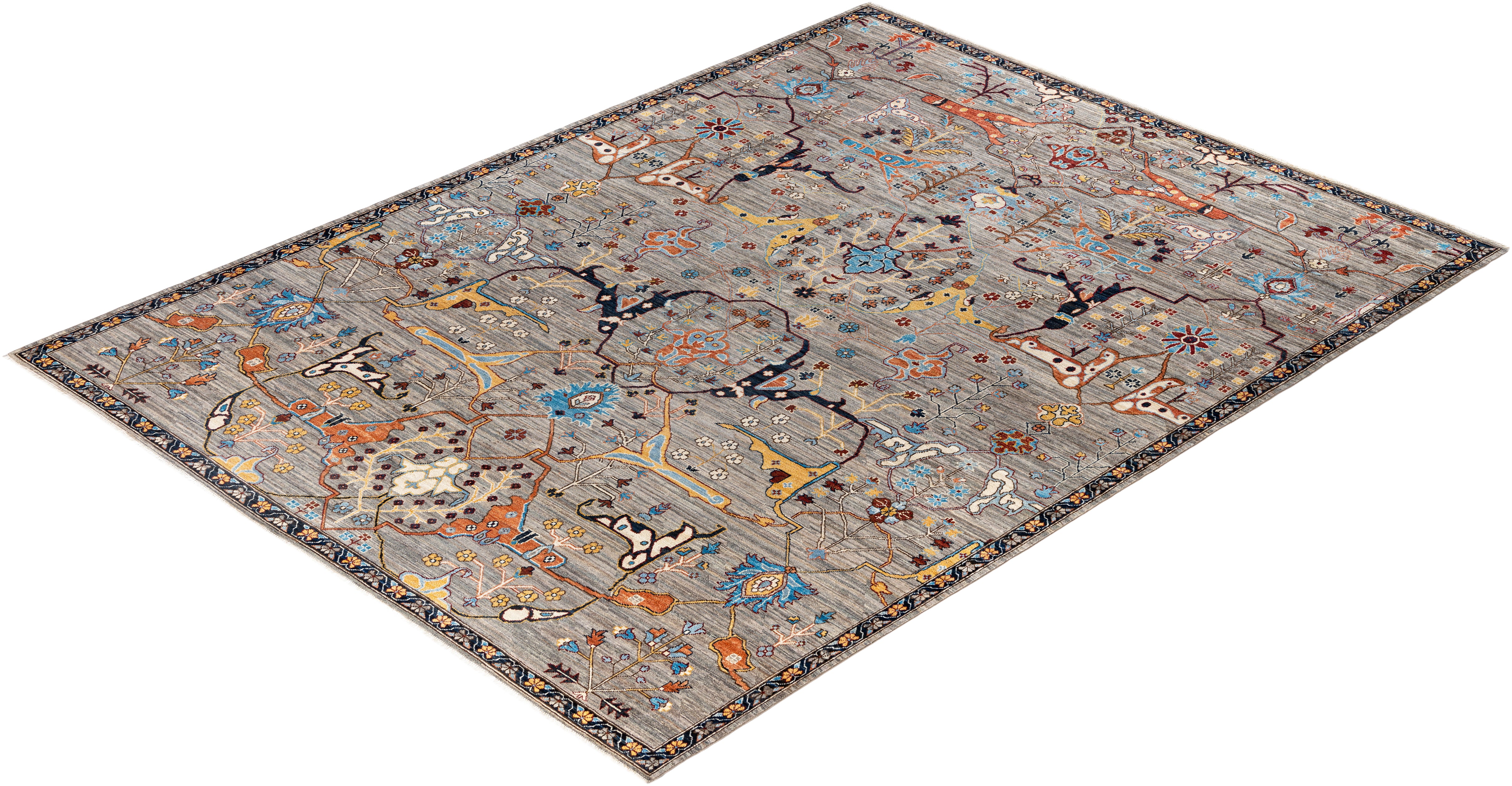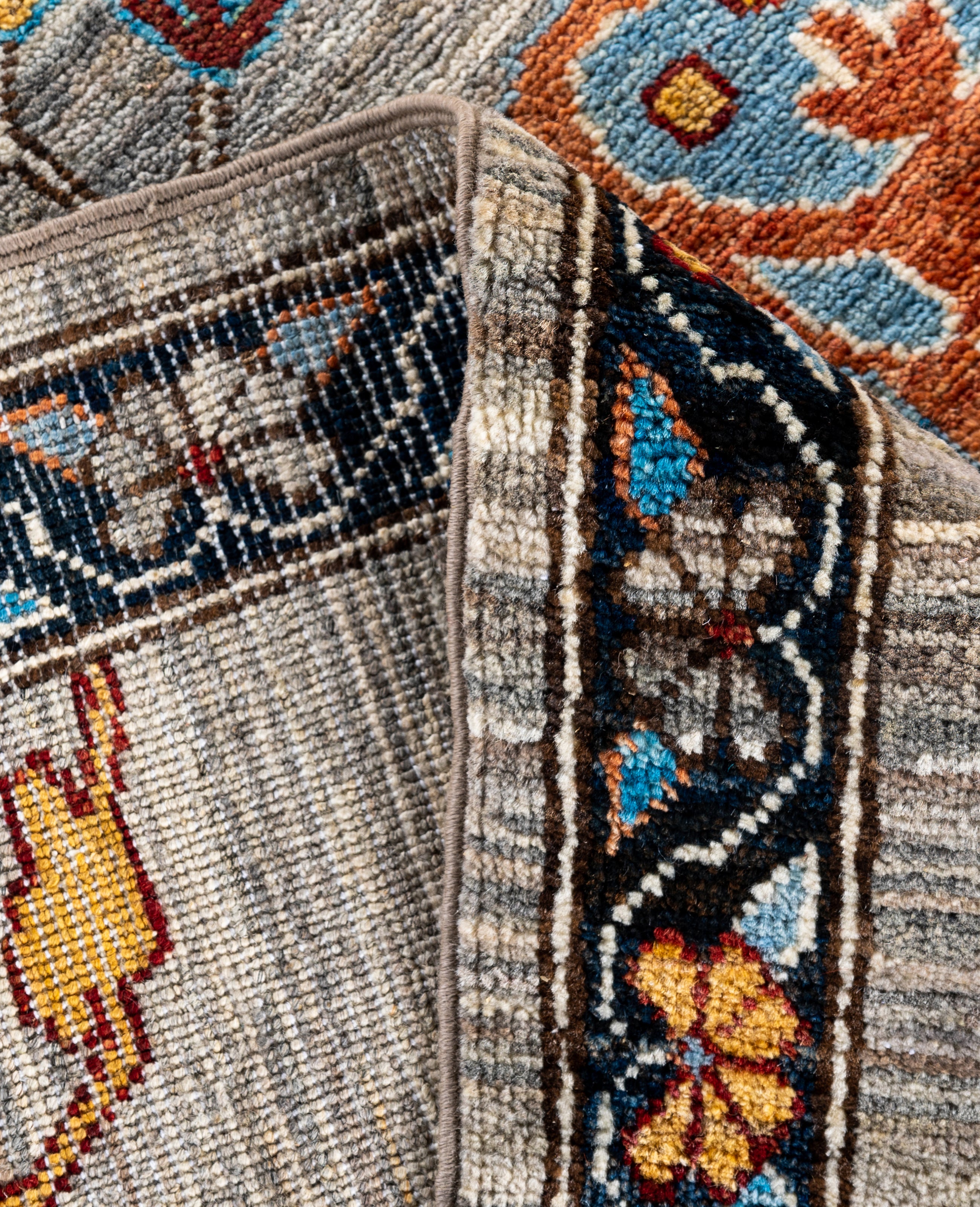 Serapi rugs are known for their bold, geometric designs and rich colors, often featuring a central medallion surrounded by intricate patterns. They typically use a warm, earthy color palette with deep reds, blues, ivory, and occasional greens. The designs emphasize large-scale motifs, including angular vines, leaves, and floral elements, giving the rugs a distinctive, almost architectural appearance. These rugs are hand-knotted and are prized for their durability and high-quality craftsmanship. Their unique aesthetic is attributed to a blend of traditional motifs with more refined, spacious compositions. They are highly sought after by collectors and interior designers for their elegance and timeless appeal.