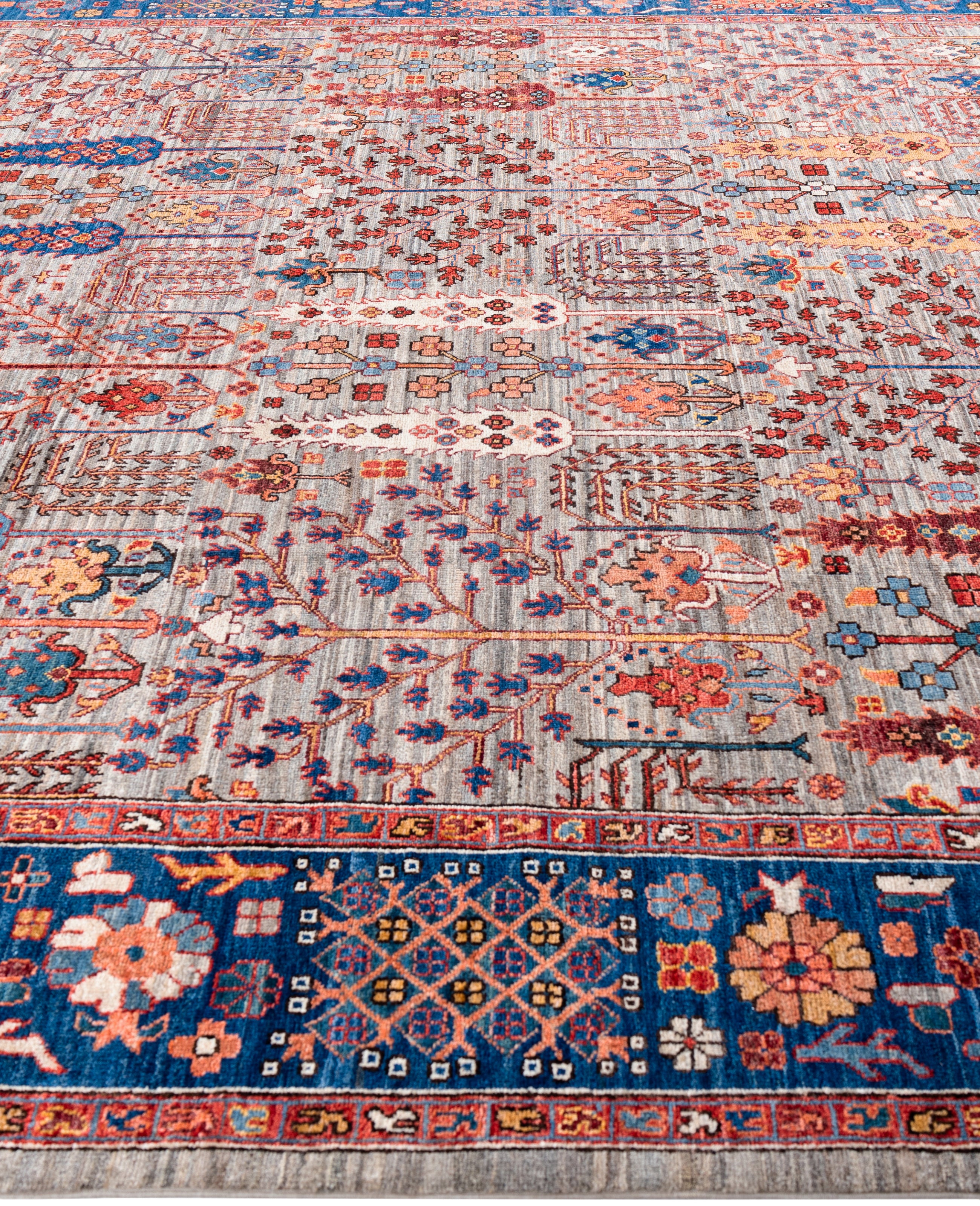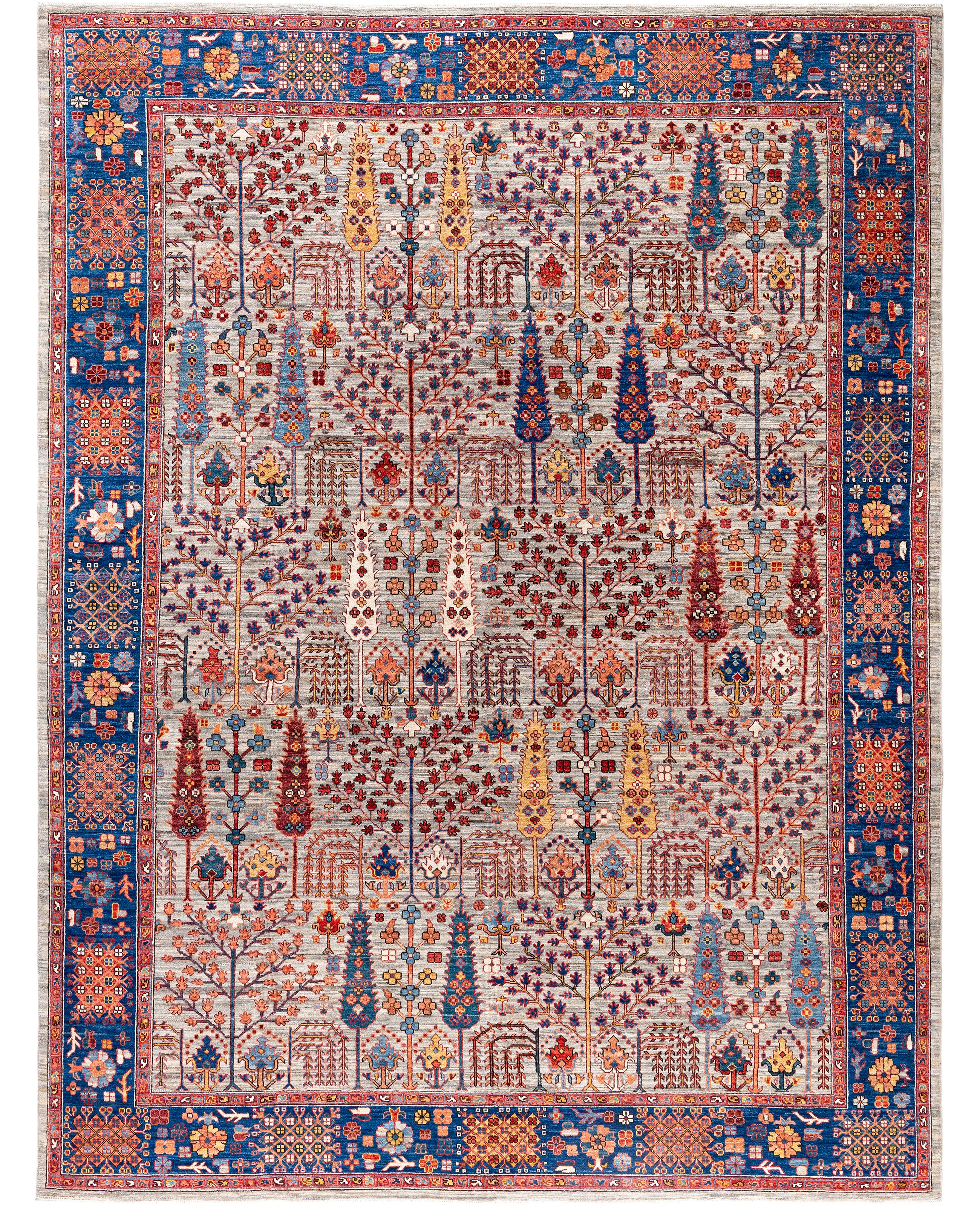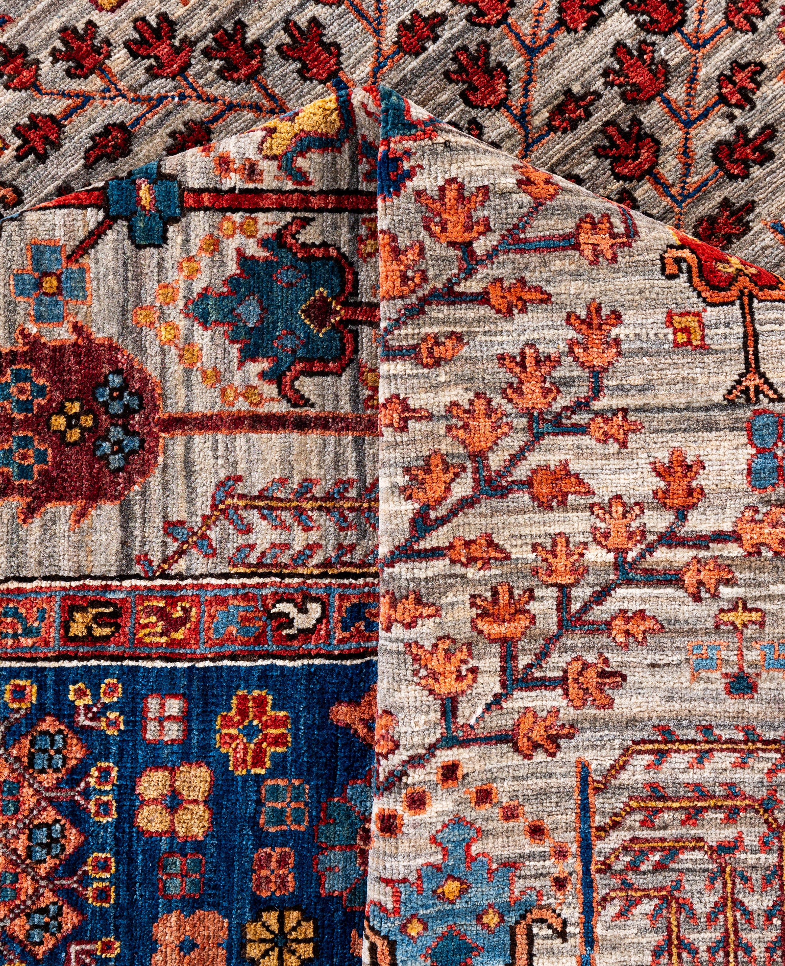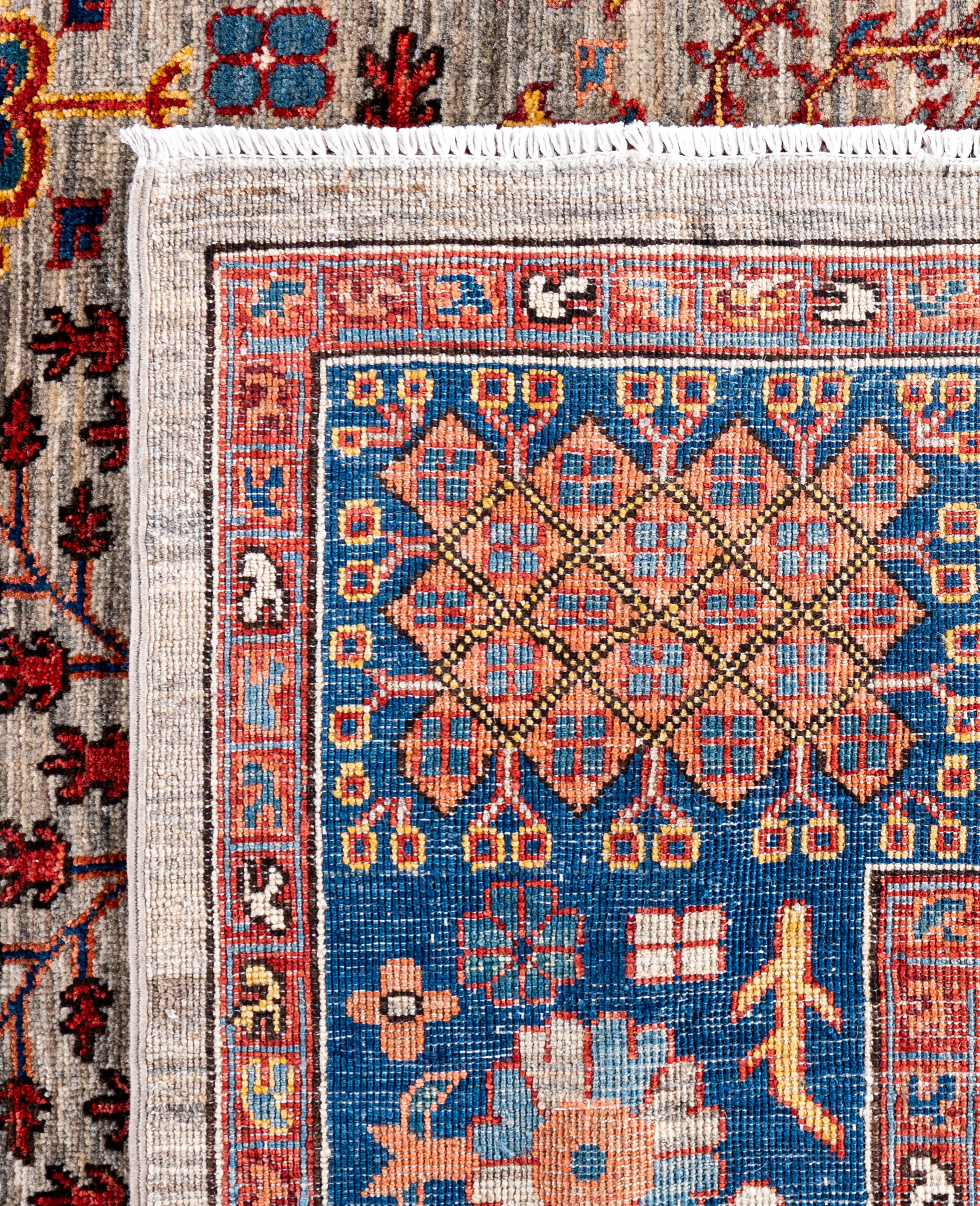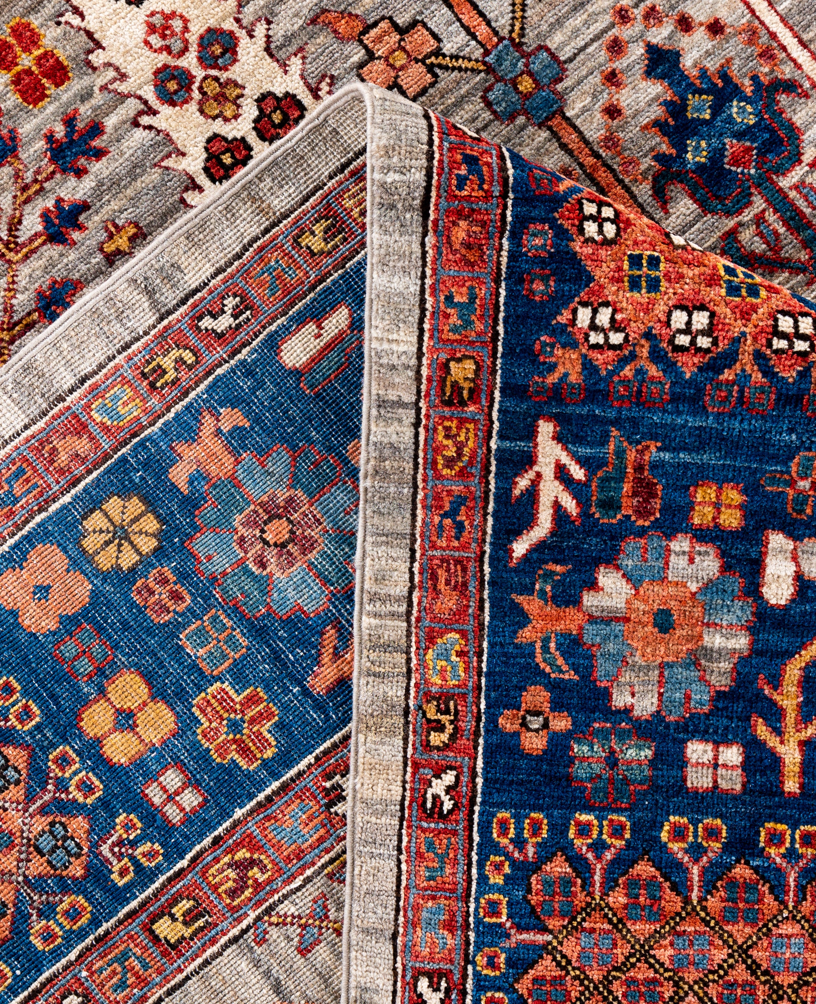 Serapi rugs are known for their bold, geometric designs and rich colors, often featuring a central medallion surrounded by intricate patterns. They typically use a warm, earthy color palette with deep reds, blues, ivory, and occasional greens. The designs emphasize large-scale motifs, including angular vines, leaves, and floral elements, giving the rugs a distinctive, almost architectural appearance. These rugs are hand-knotted and are prized for their durability and high-quality craftsmanship. Their unique aesthetic is attributed to a blend of traditional motifs with more refined, spacious compositions. They are highly sought after by collectors and interior designers for their elegance and timeless appeal.