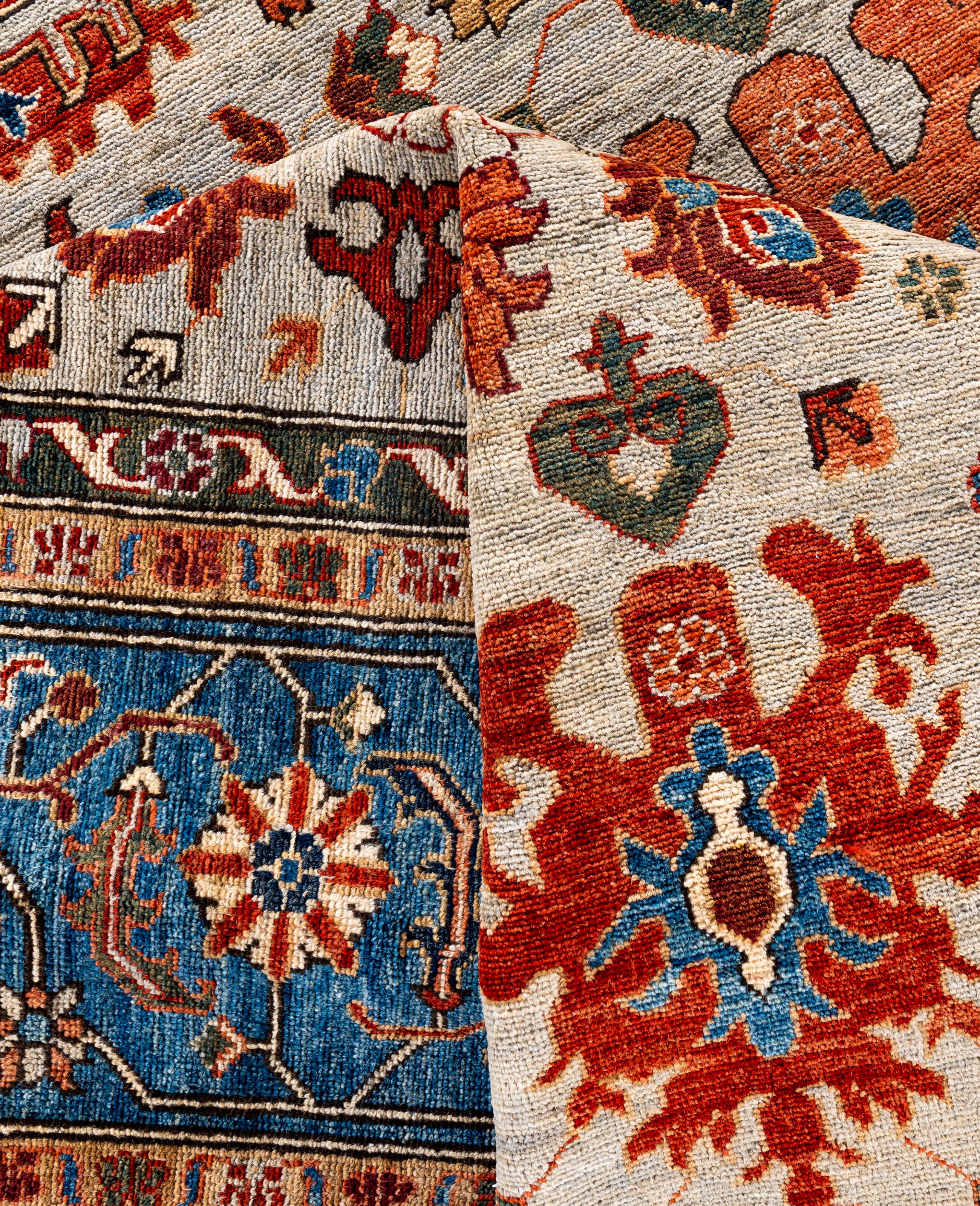 Serapi rugs are known for their bold, geometric designs and rich colors, often featuring a central medallion surrounded by intricate patterns. They typically use a warm, earthy color palette with deep reds, blues, ivory, and occasional greens. The designs emphasize large-scale motifs, including angular vines, leaves, and floral elements, giving the rugs a distinctive, almost architectural appearance. These rugs are hand-knotted and are prized for their durability and high-quality craftsmanship. Their unique aesthetic is attributed to a blend of traditional motifs with more refined, spacious compositions. They are highly sought after by collectors and interior designers for their elegance and timeless appeal.