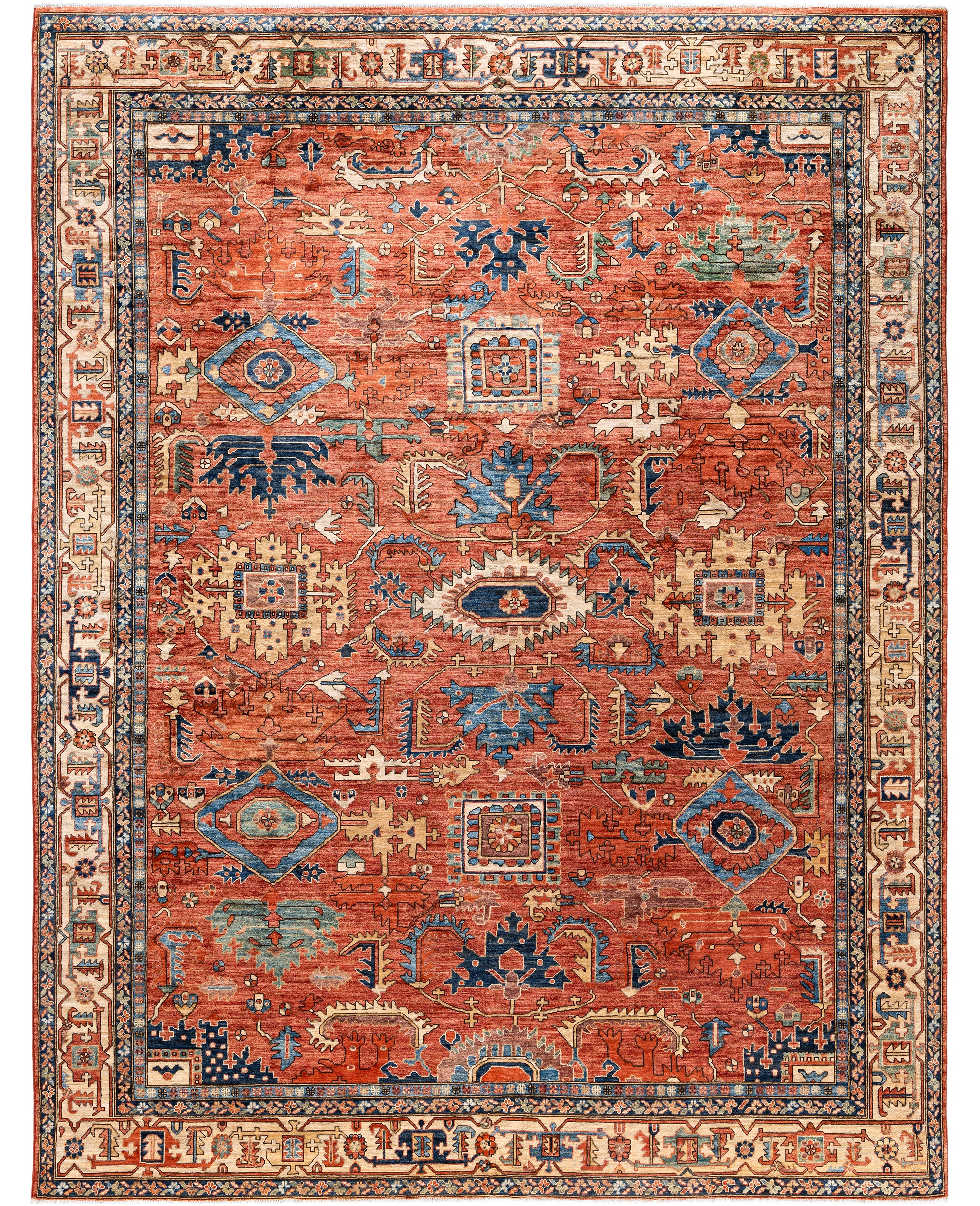 Serapi rugs are known for their bold, geometric designs and rich colors, often featuring a central medallion surrounded by intricate patterns. They typically use a warm, earthy color palette with deep reds, blues, ivory, and occasional greens. The designs emphasize large-scale motifs, including angular vines, leaves, and floral elements, giving the rugs a distinctive, almost architectural appearance. These rugs are hand-knotted and are prized for their durability and high-quality craftsmanship. Their unique aesthetic is attributed to a blend of traditional motifs with more refined, spacious compositions. They are highly sought after by collectors and interior designers for their elegance and timeless appeal.