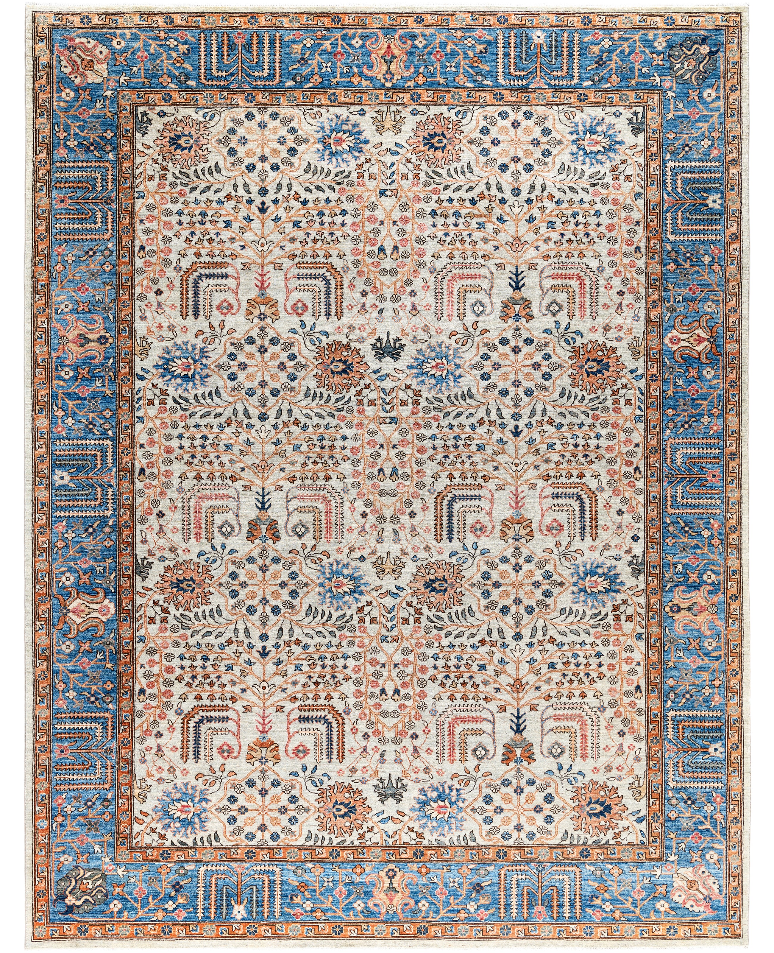 Serapi rugs are known for their bold, geometric designs and rich colors, often featuring a central medallion surrounded by intricate patterns. They typically use a warm, earthy color palette with deep reds, blues, ivory, and occasional greens. The designs emphasize large-scale motifs, including angular vines, leaves, and floral elements, giving the rugs a distinctive, almost architectural appearance. These rugs are hand-knotted and are prized for their durability and high-quality craftsmanship. Their unique aesthetic is attributed to a blend of traditional motifs with more refined, spacious compositions. They are highly sought after by collectors and interior designers for their elegance and timeless appeal.