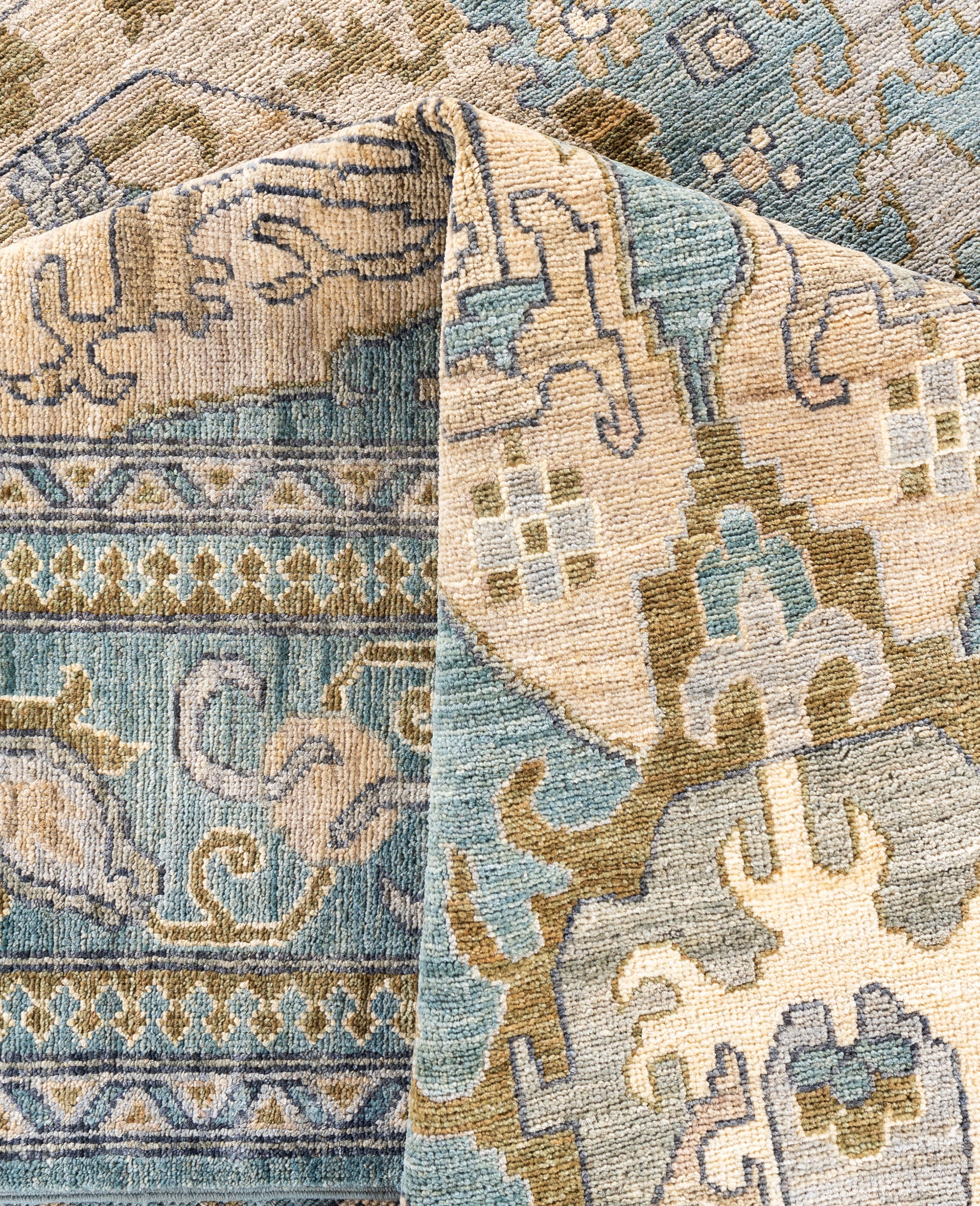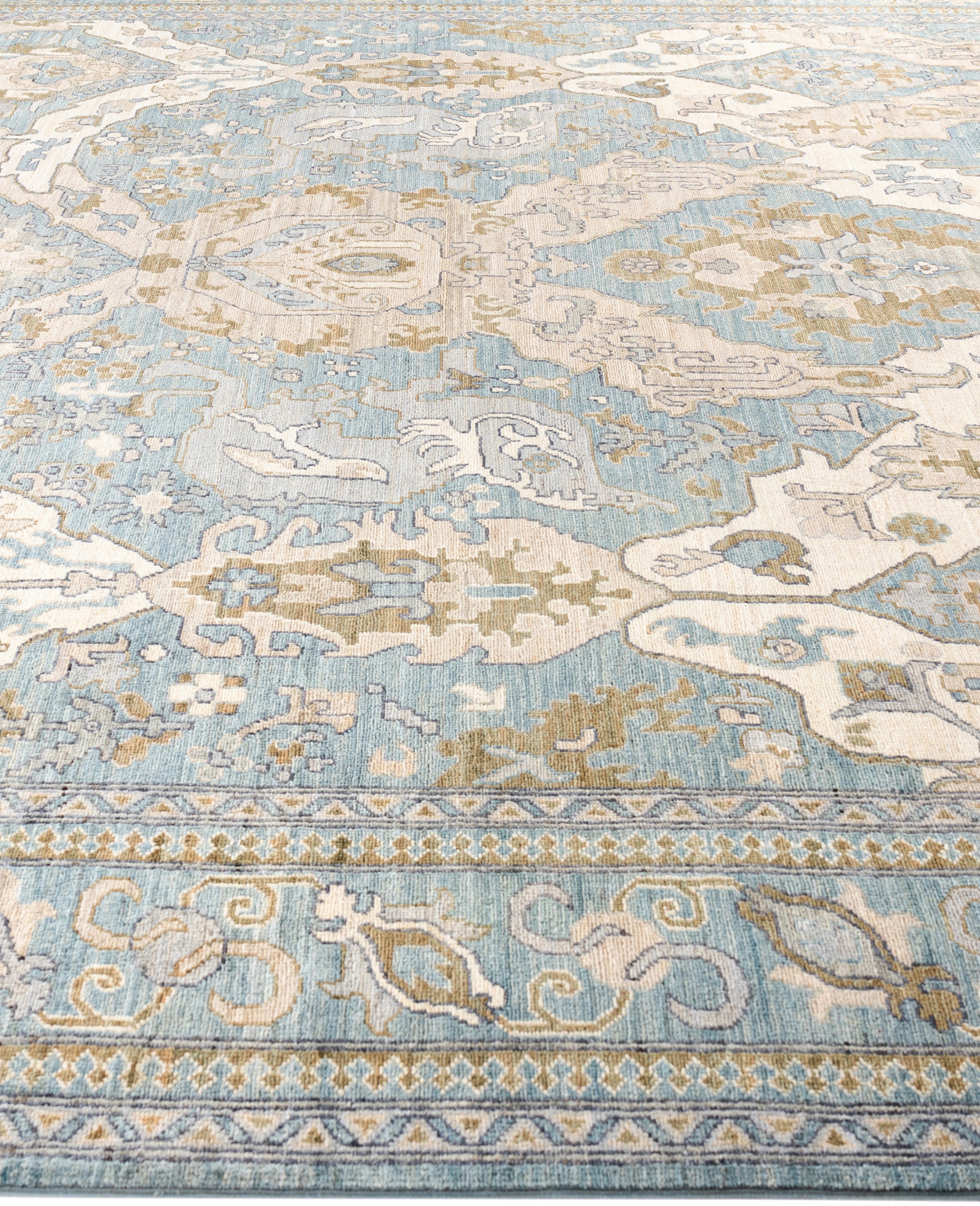Serapi rugs are known for their bold, geometric designs and rich colors, often featuring a central medallion surrounded by intricate patterns. They typically use a warm, earthy color palette with deep reds, blues, ivory, and occasional greens. The designs emphasize large-scale motifs, including angular vines, leaves, and floral elements, giving the rugs a distinctive, almost architectural appearance. These rugs are hand-knotted and are prized for their durability and high-quality craftsmanship. Their unique aesthetic is attributed to a blend of traditional motifs with more refined, spacious compositions. They are highly sought after by collectors and interior designers for their elegance and timeless appeal.
