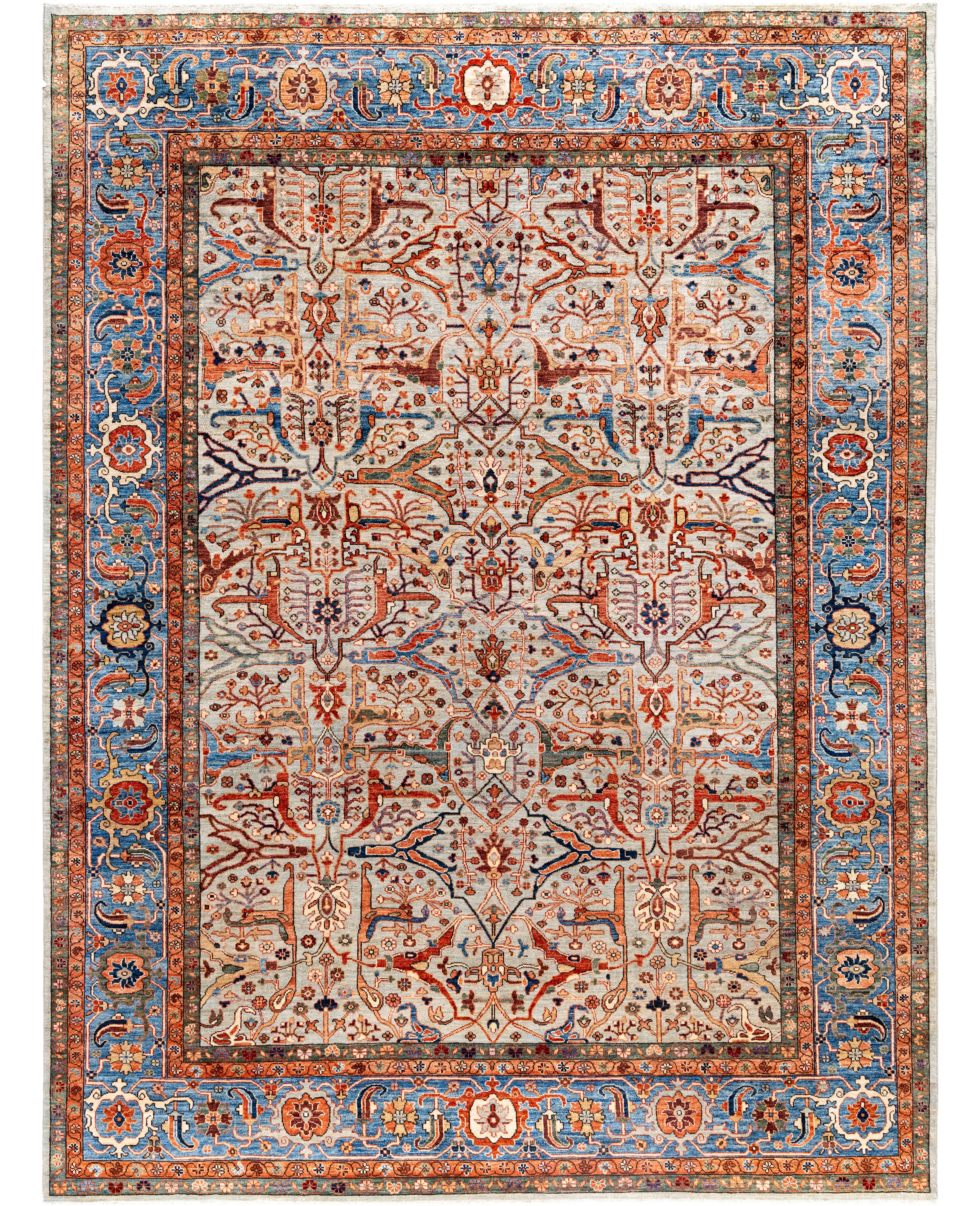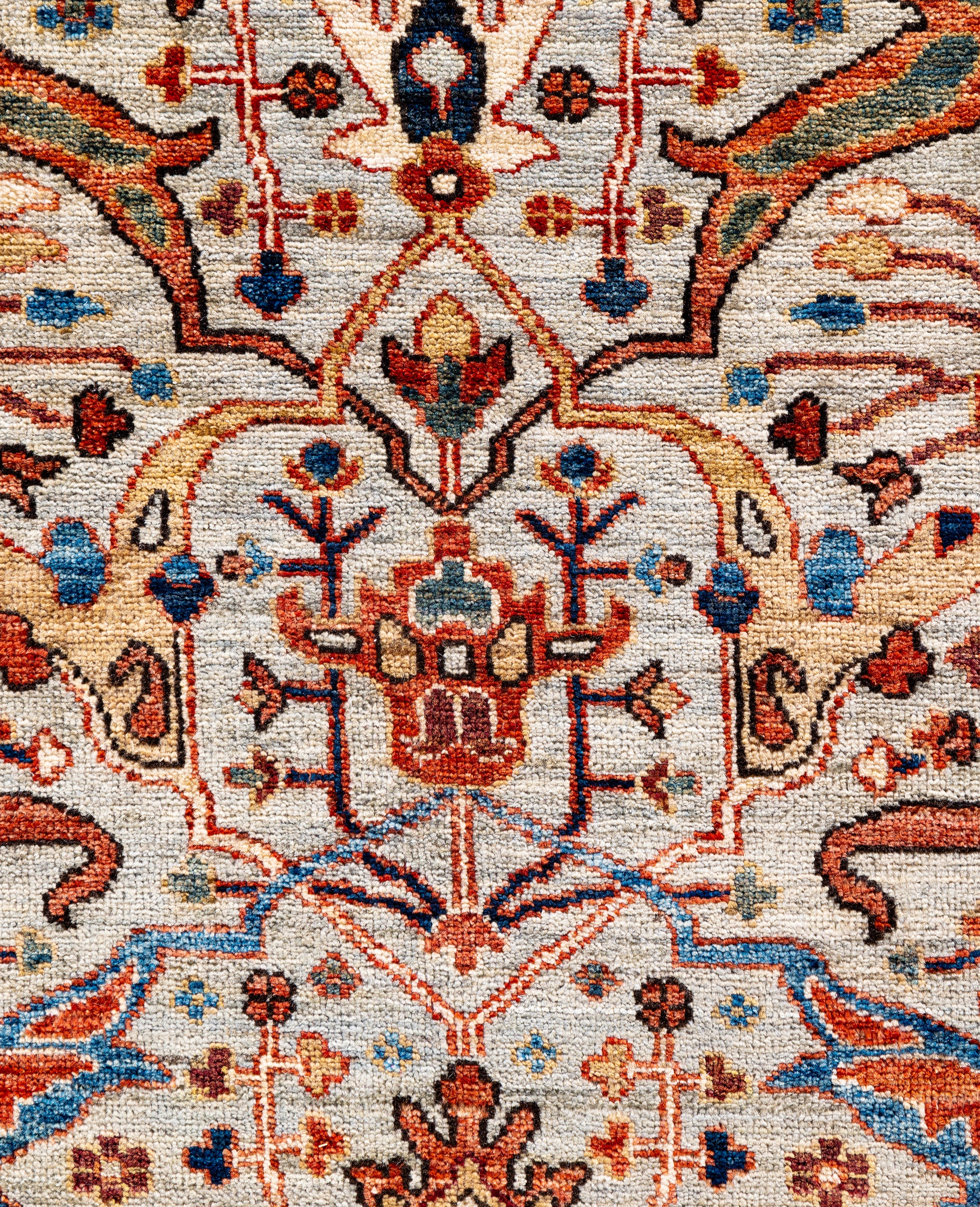 Serapi rugs are known for their bold, geometric designs and rich colors, often featuring a central medallion surrounded by intricate patterns. They typically use a warm, earthy color palette with deep reds, blues, ivory, and occasional greens. The designs emphasize large-scale motifs, including angular vines, leaves, and floral elements, giving the rugs a distinctive, almost architectural appearance. These rugs are hand-knotted and are prized for their durability and high-quality craftsmanship. Their unique aesthetic is attributed to a blend of traditional motifs with more refined, spacious compositions. They are highly sought after by collectors and interior designers for their elegance and timeless appeal.