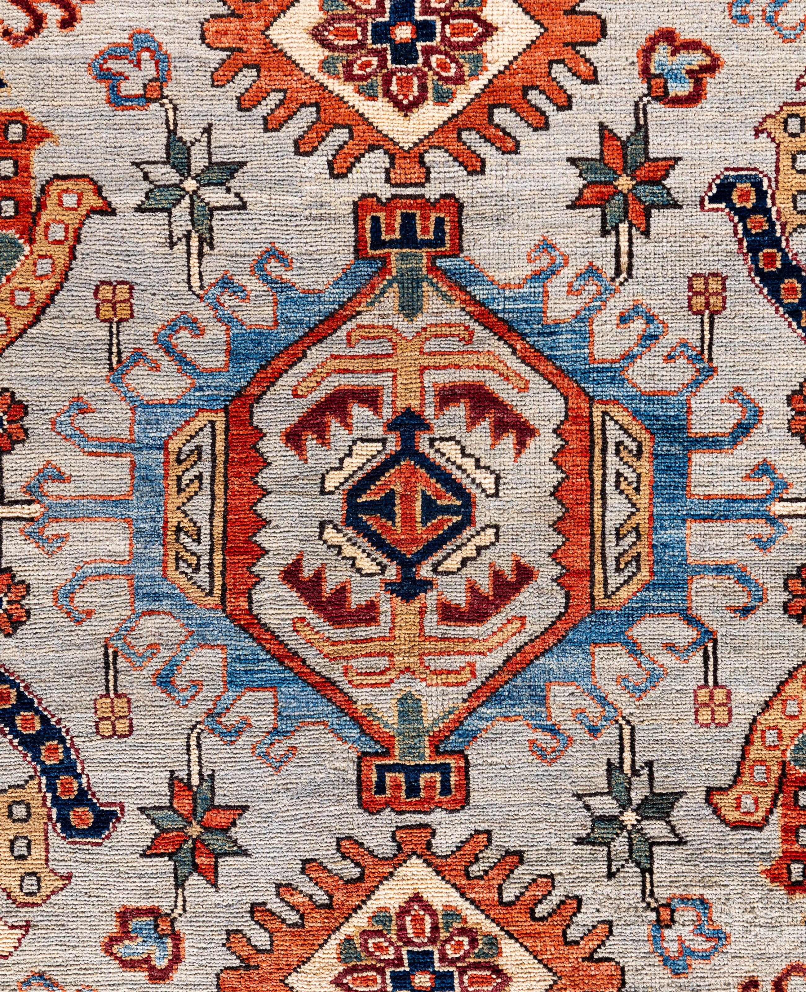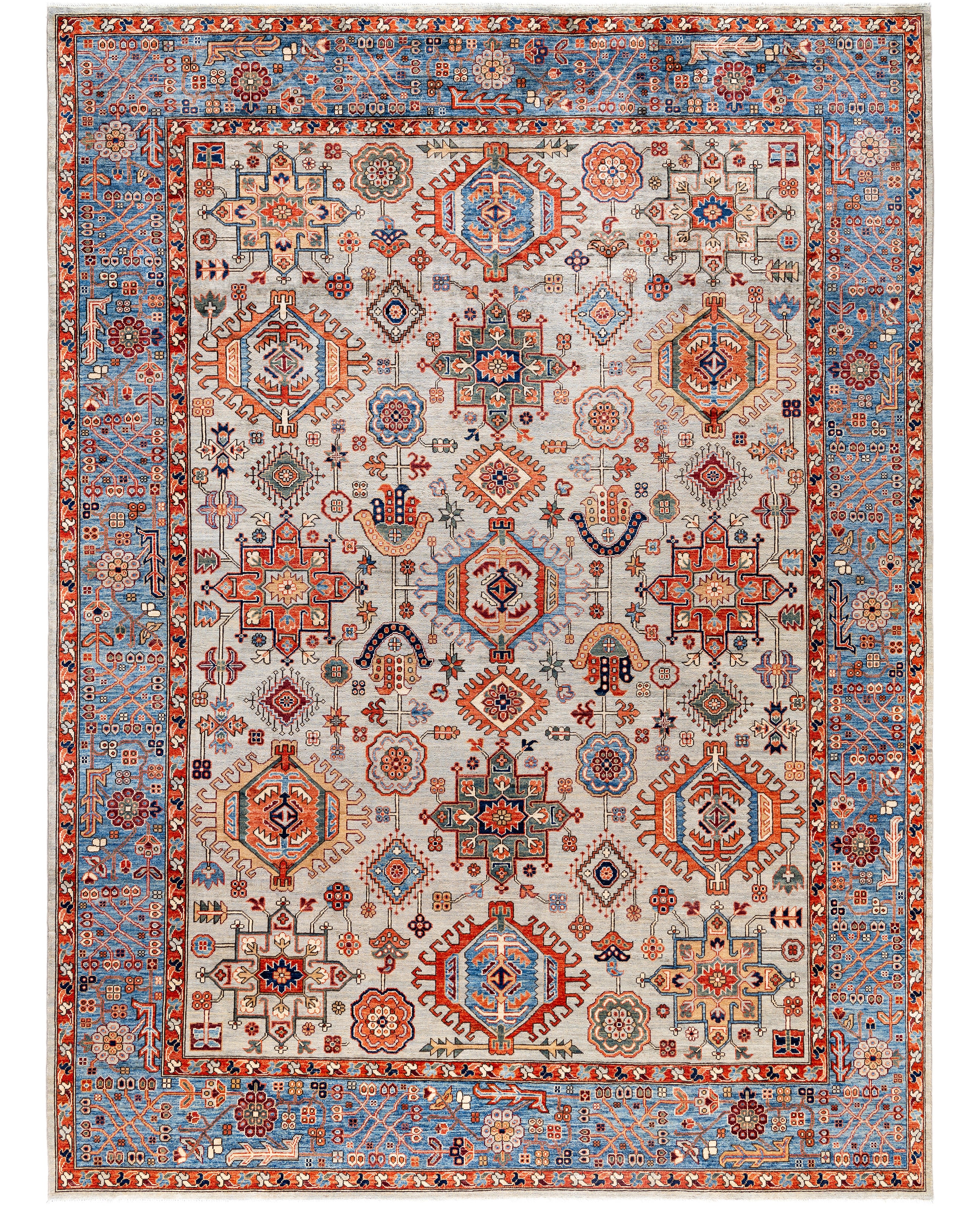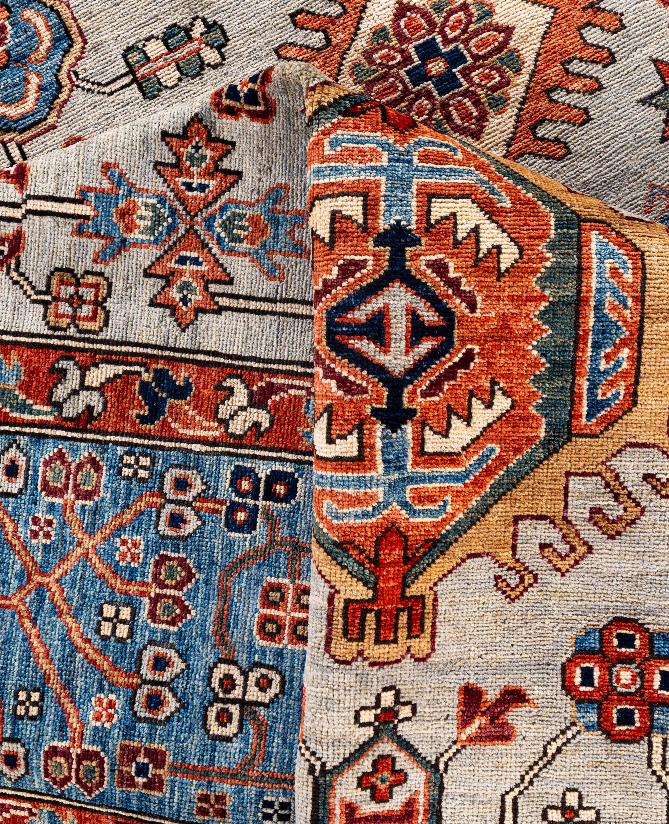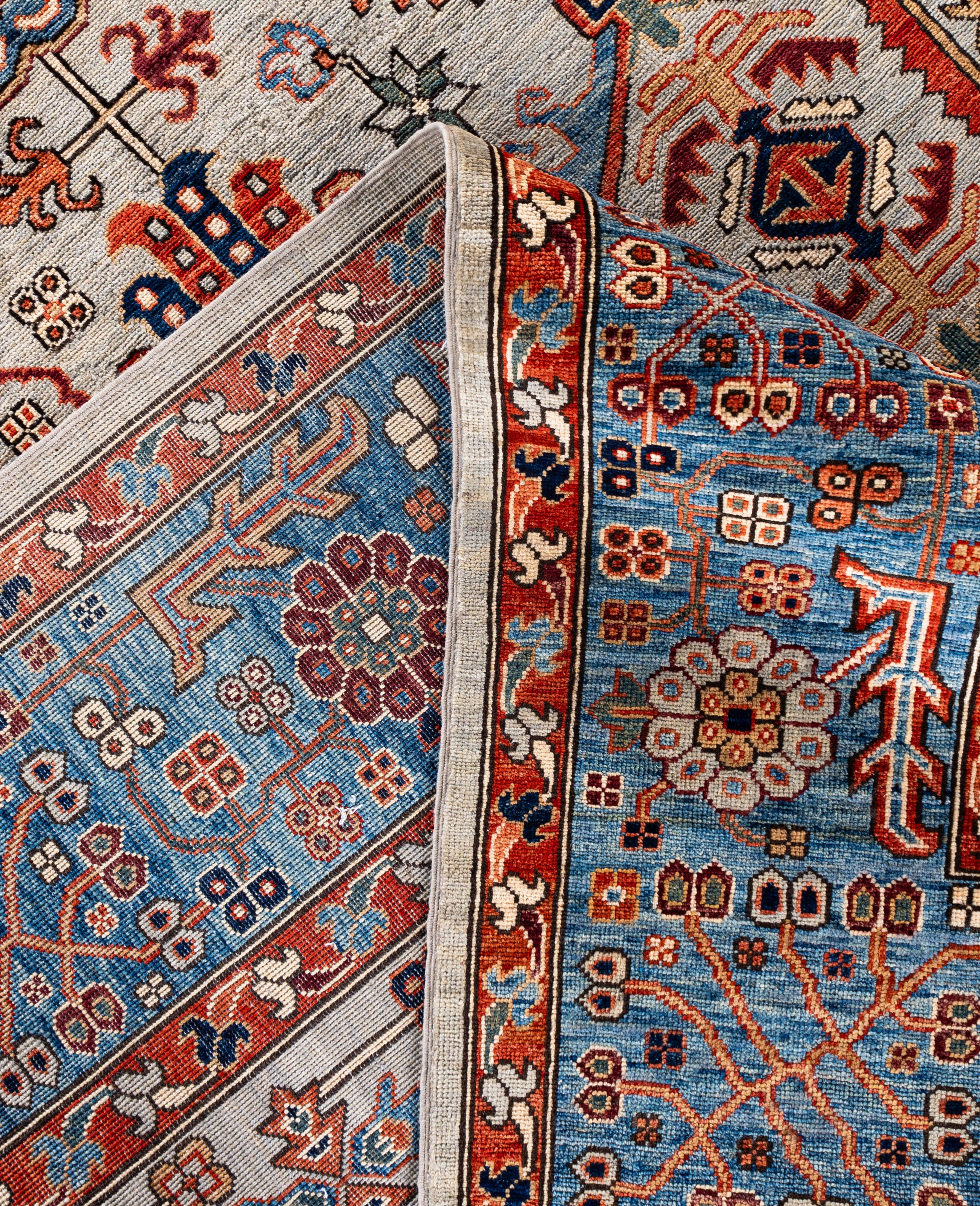 Serapi rugs are known for their bold, geometric designs and rich colors, often featuring a central medallion surrounded by intricate patterns. They typically use a warm, earthy color palette with deep reds, blues, ivory, and occasional greens. The designs emphasize large-scale motifs, including angular vines, leaves, and floral elements, giving the rugs a distinctive, almost architectural appearance. These rugs are hand-knotted and are prized for their durability and high-quality craftsmanship. Their unique aesthetic is attributed to a blend of traditional motifs with more refined, spacious compositions. They are highly sought after by collectors and interior designers for their elegance and timeless appeal.