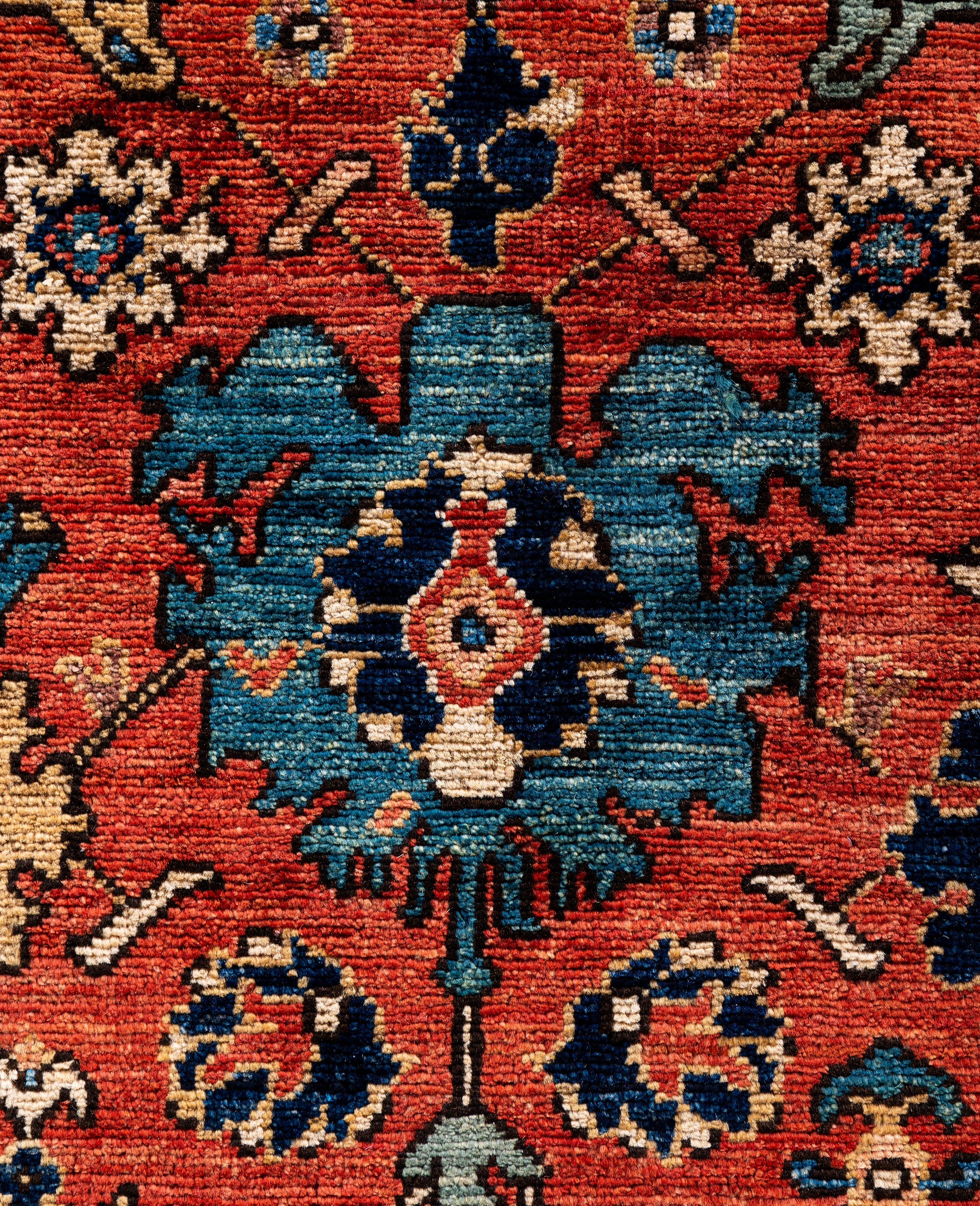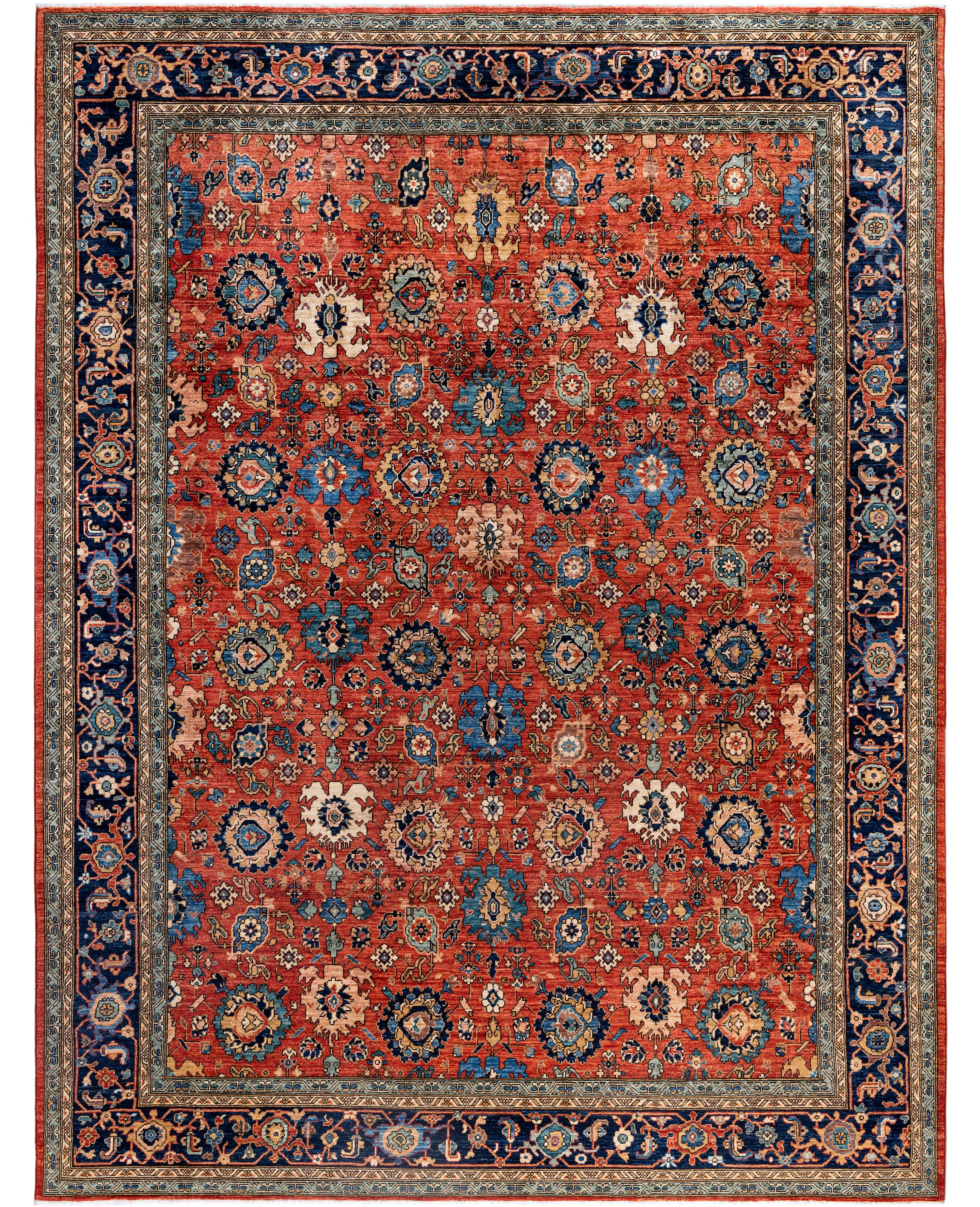 Serapi rugs are known for their bold, geometric designs and rich colors, often featuring a central medallion surrounded by intricate patterns. They typically use a warm, earthy color palette with deep reds, blues, ivory, and occasional greens. The designs emphasize large-scale motifs, including angular vines, leaves, and floral elements, giving the rugs a distinctive, almost architectural appearance. These rugs are hand-knotted and are prized for their durability and high-quality craftsmanship. Their unique aesthetic is attributed to a blend of traditional motifs with more refined, spacious compositions. They are highly sought after by collectors and interior designers for their elegance and timeless appeal.