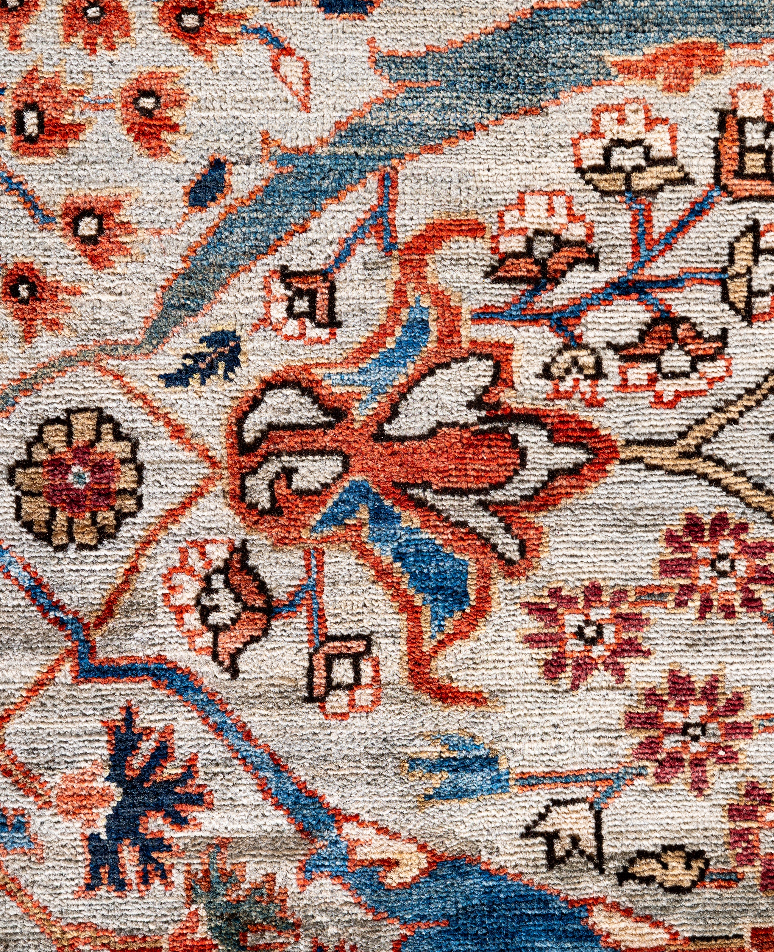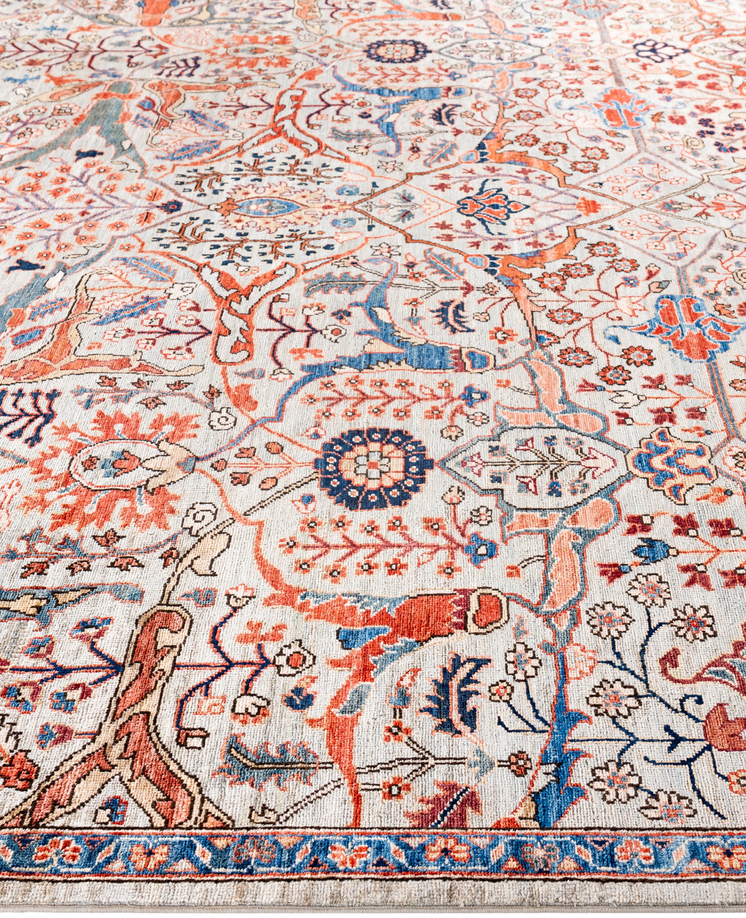 Serapi rugs are known for their bold, geometric designs and rich colors, often featuring a central medallion surrounded by intricate patterns. They typically use a warm, earthy color palette with deep reds, blues, ivory, and occasional greens. The designs emphasize large-scale motifs, including angular vines, leaves, and floral elements, giving the rugs a distinctive, almost architectural appearance. These rugs are hand-knotted and are prized for their durability and high-quality craftsmanship. Their unique aesthetic is attributed to a blend of traditional motifs with more refined, spacious compositions. They are highly sought after by collectors and interior designers for their elegance and timeless appeal.