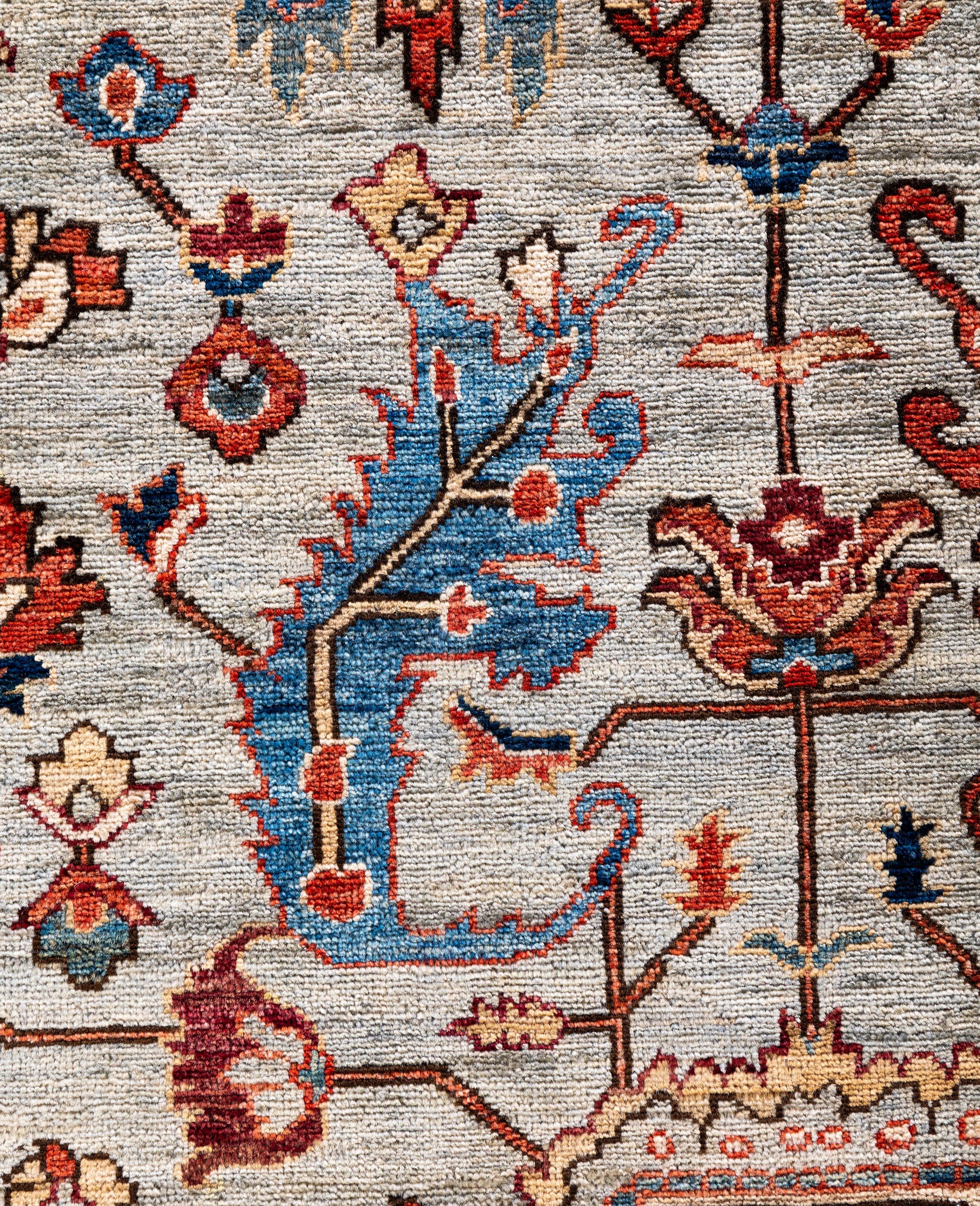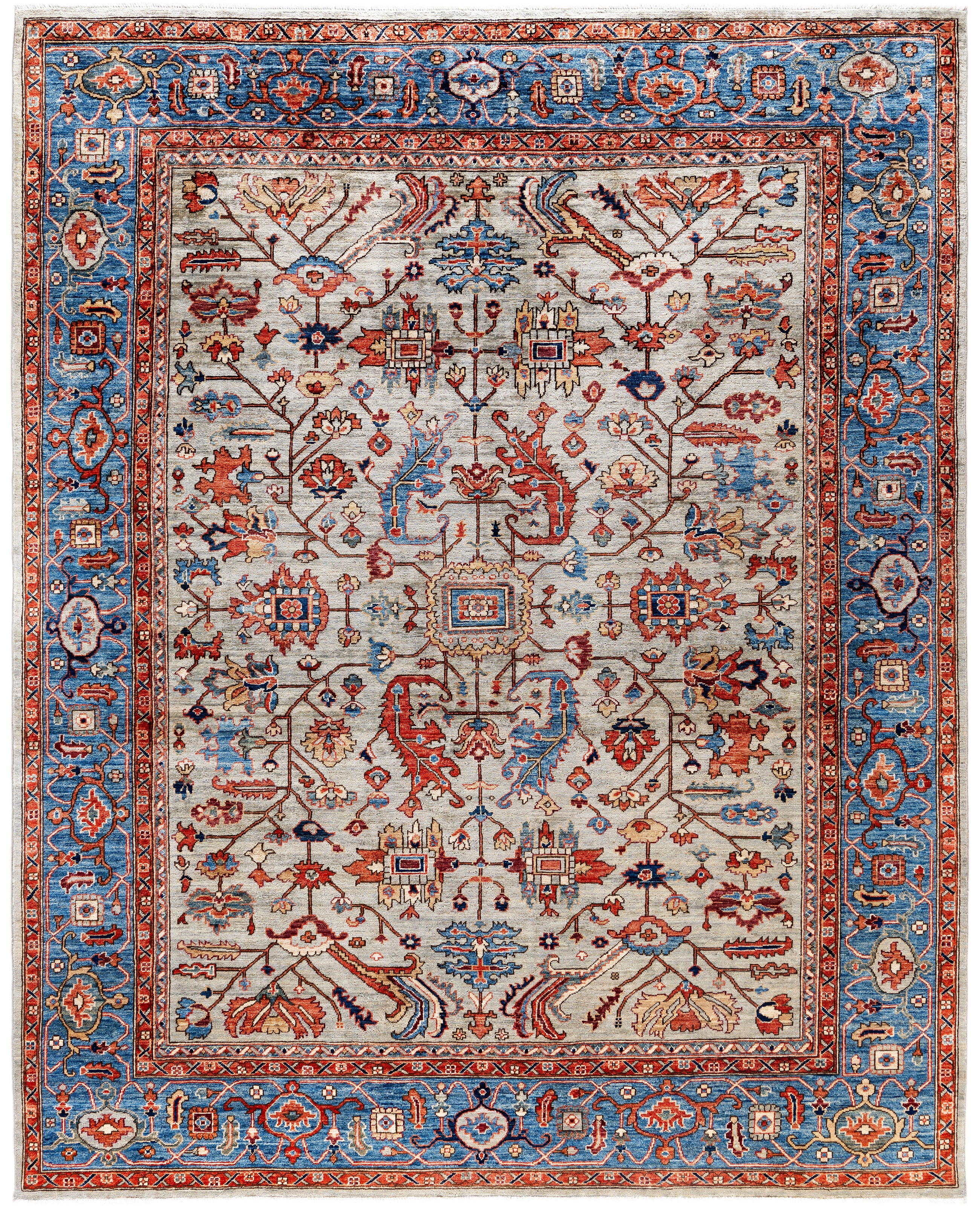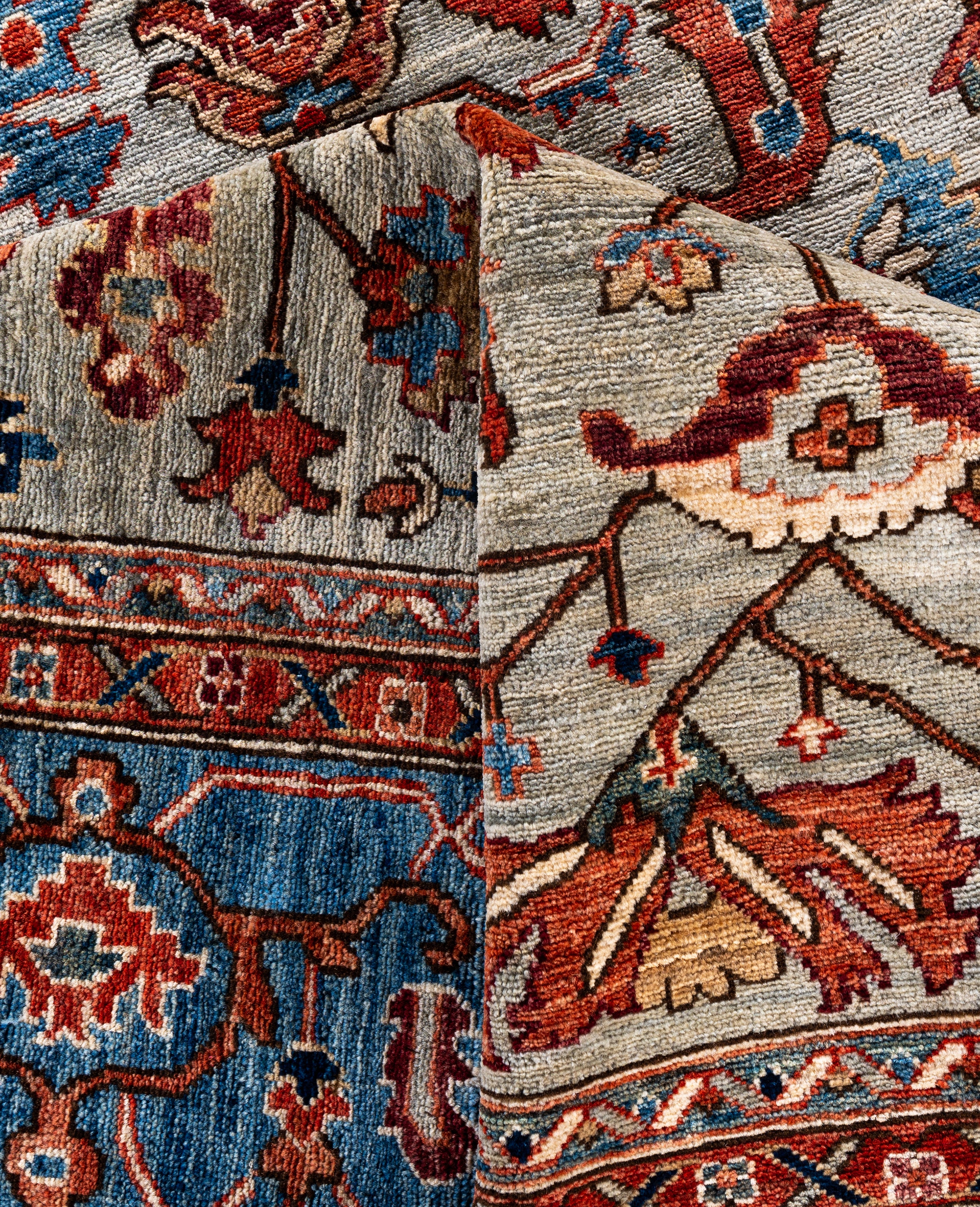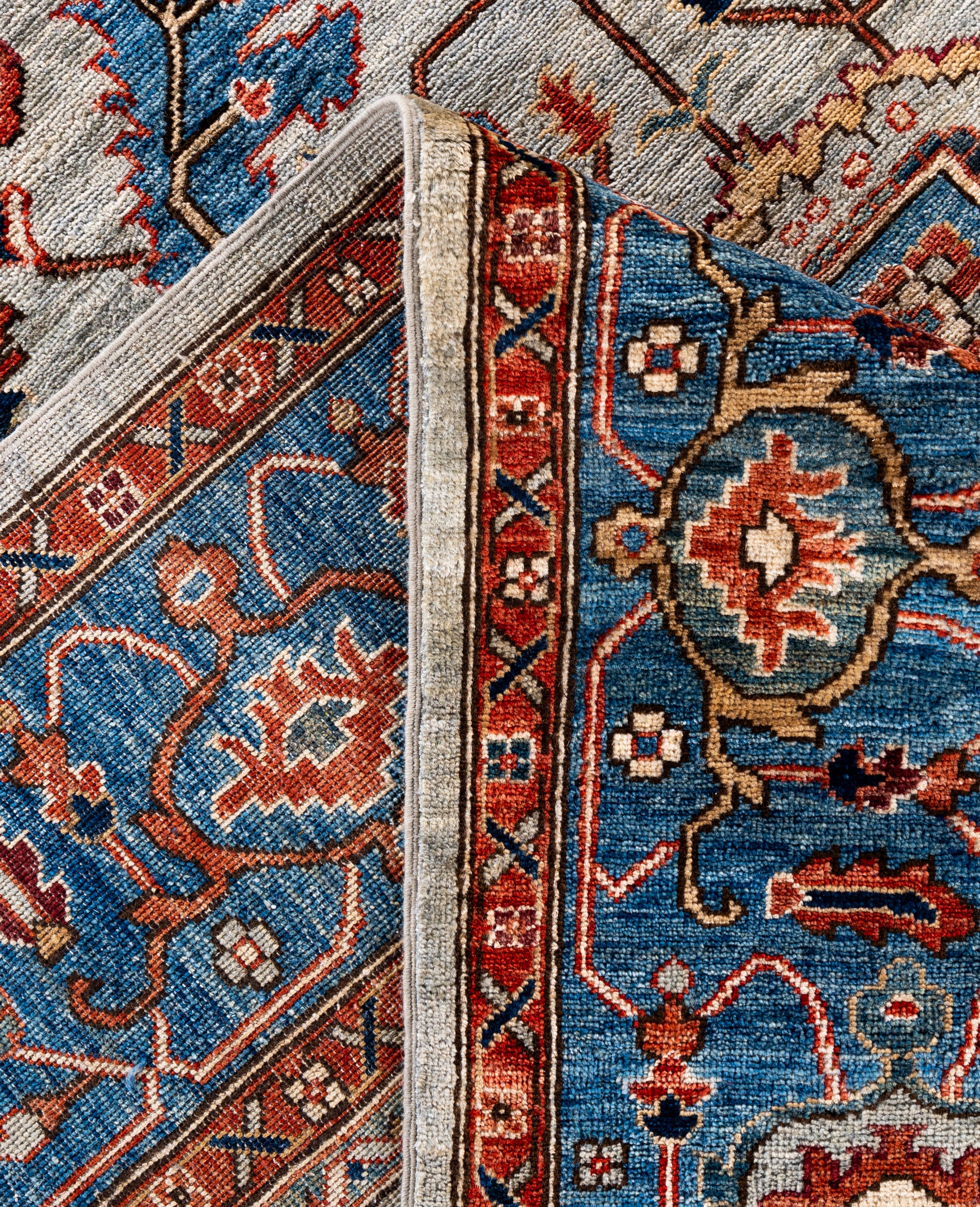 Serapi rugs are known for their bold, geometric designs and rich colors, often featuring a central medallion surrounded by intricate patterns. They typically use a warm, earthy color palette with deep reds, blues, ivory, and occasional greens. The designs emphasize large-scale motifs, including angular vines, leaves, and floral elements, giving the rugs a distinctive, almost architectural appearance. These rugs are hand-knotted and are prized for their durability and high-quality craftsmanship. Their unique aesthetic is attributed to a blend of traditional motifs with more refined, spacious compositions. They are highly sought after by collectors and interior designers for their elegance and timeless appeal.