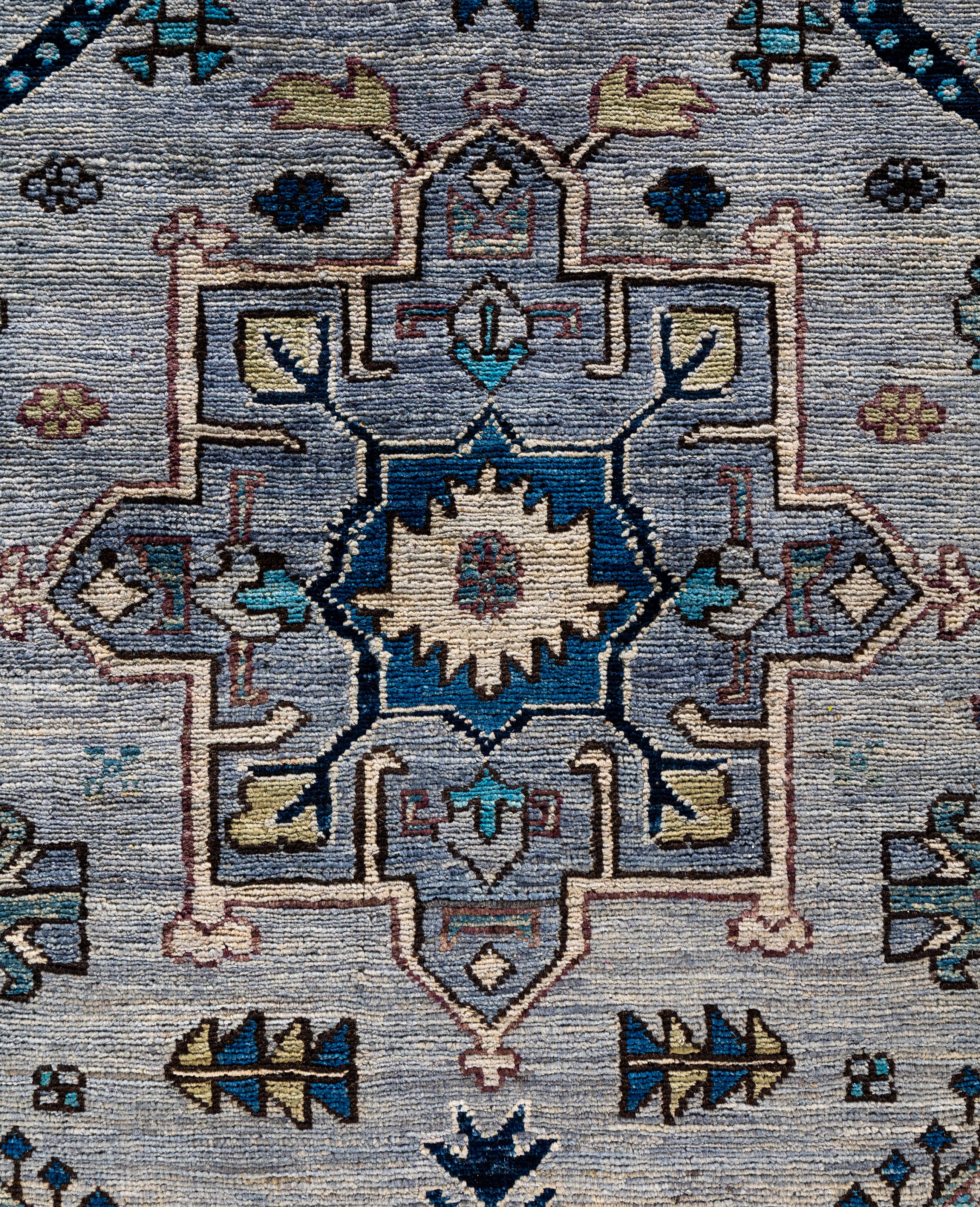Serapi rugs are known for their bold, geometric designs and rich colors, often featuring a central medallion surrounded by intricate patterns. They typically use a warm, earthy color palette with deep reds, blues, ivory, and occasional greens. The designs emphasize large-scale motifs, including angular vines, leaves, and floral elements, giving the rugs a distinctive, almost architectural appearance. These rugs are hand-knotted and are prized for their durability and high-quality craftsmanship. Their unique aesthetic is attributed to a blend of traditional motifs with more refined, spacious compositions. They are highly sought after by collectors and interior designers for their elegance and timeless appeal.