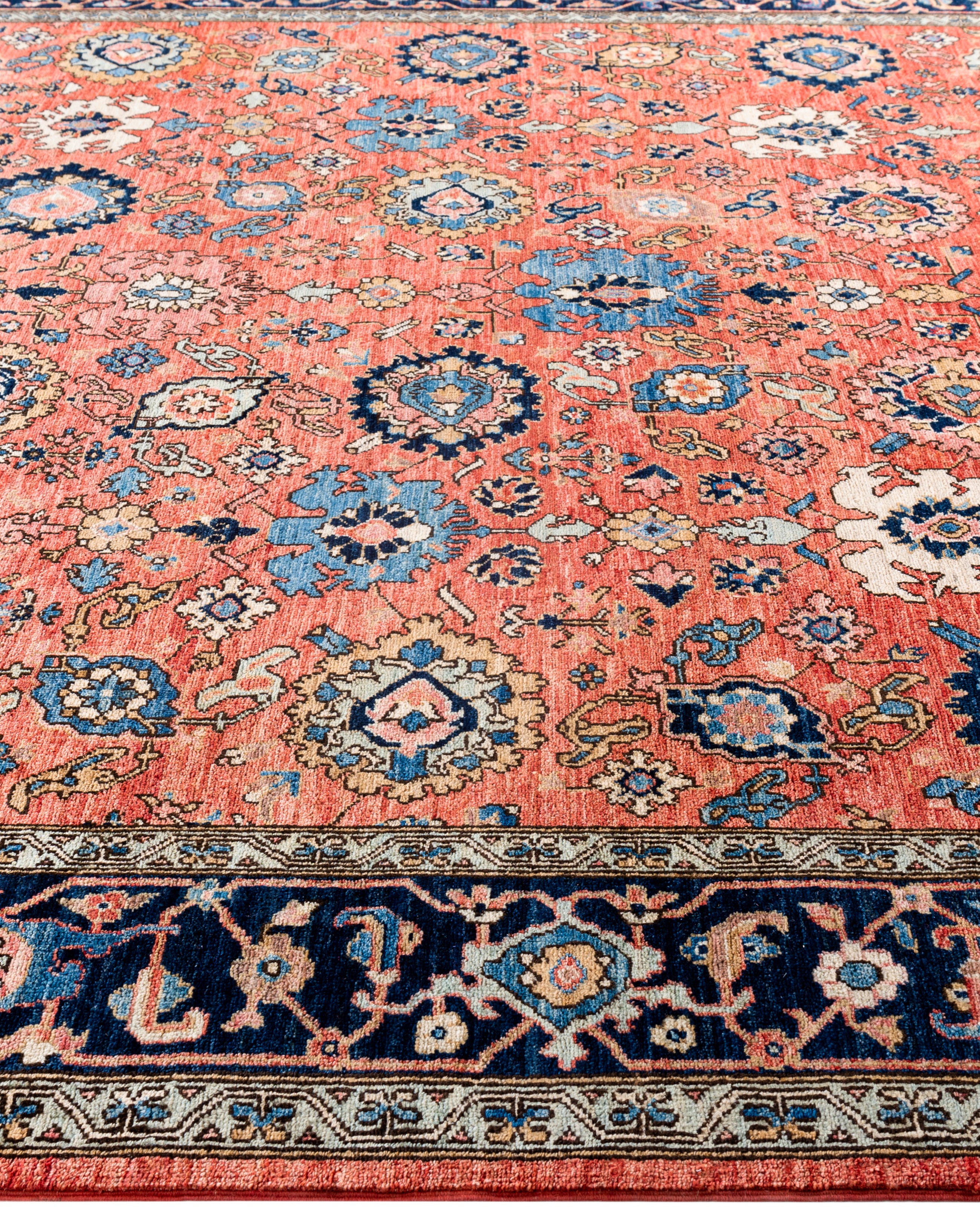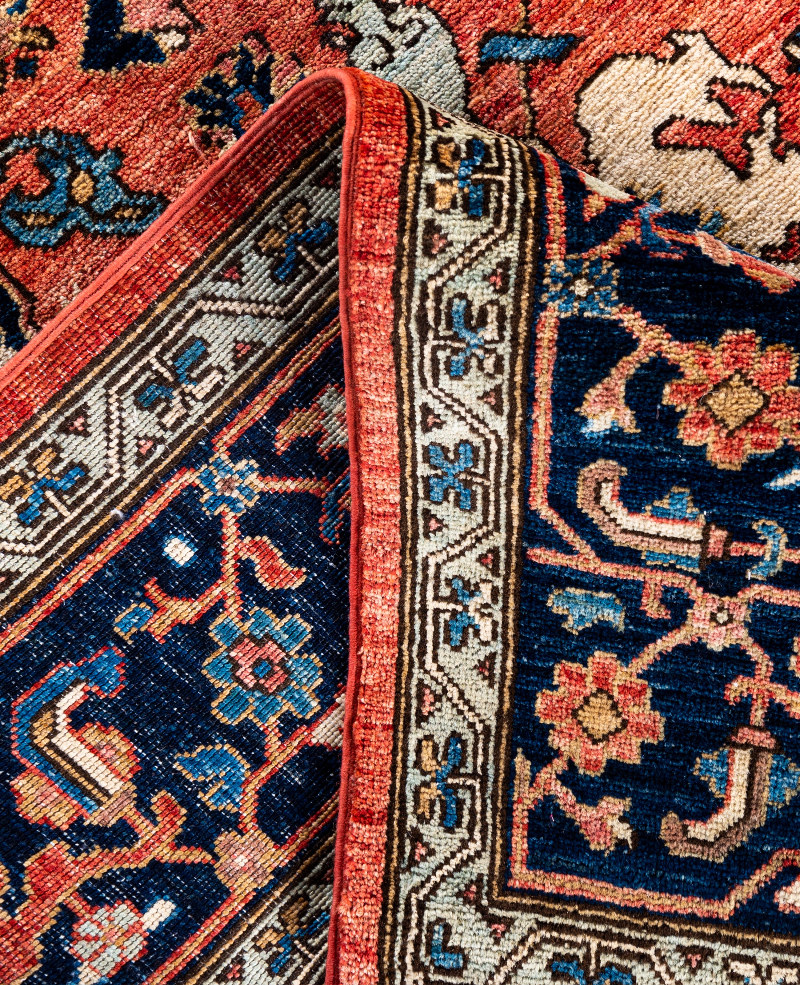 Serapi rugs are known for their bold, geometric designs and rich colors, often featuring a central medallion surrounded by intricate patterns. They typically use a warm, earthy color palette with deep reds, blues, ivory, and occasional greens. The designs emphasize large-scale motifs, including angular vines, leaves, and floral elements, giving the rugs a distinctive, almost architectural appearance. These rugs are hand-knotted and are prized for their durability and high-quality craftsmanship. Their unique aesthetic is attributed to a blend of traditional motifs with more refined, spacious compositions. They are highly sought after by collectors and interior designers for their elegance and timeless appeal.