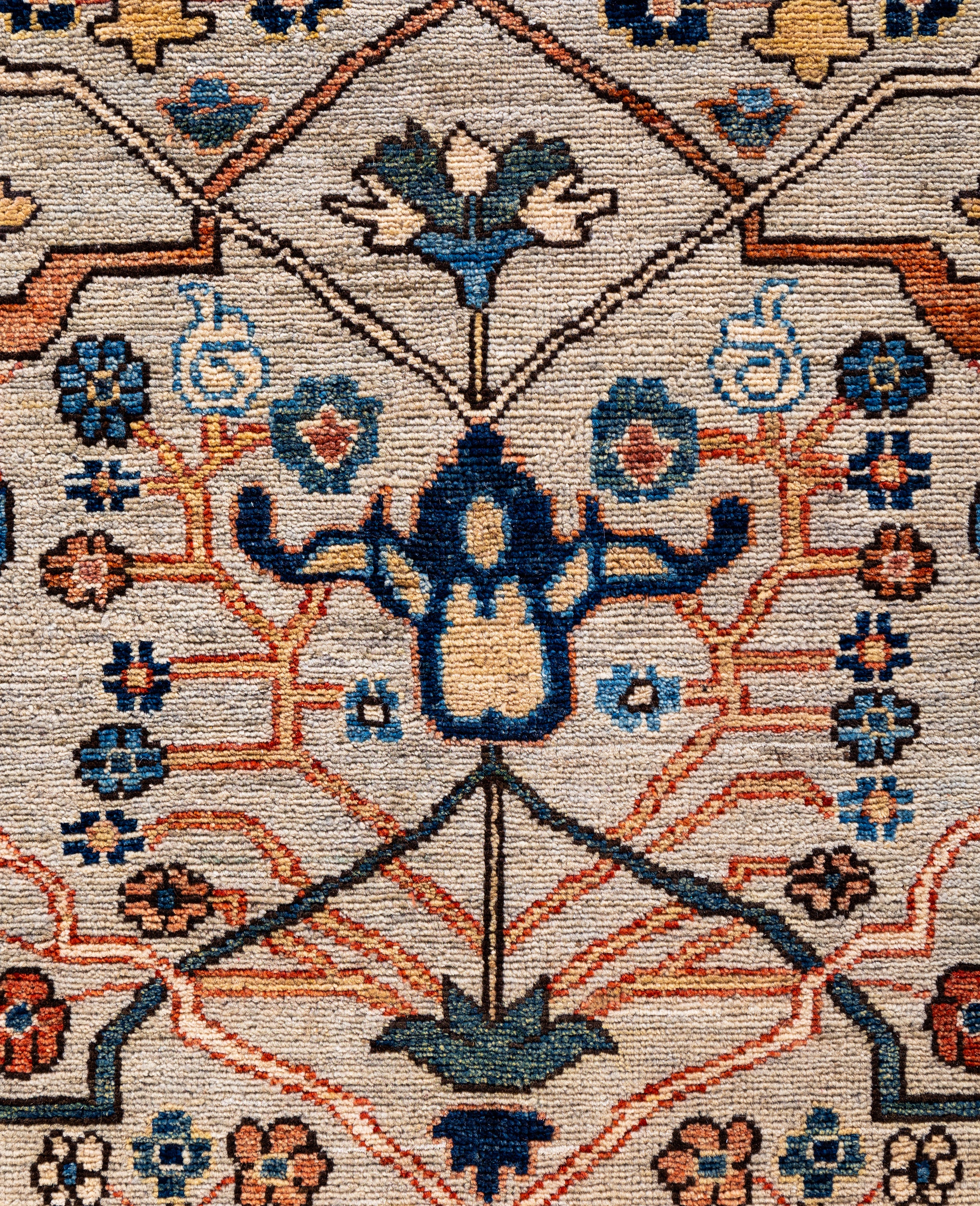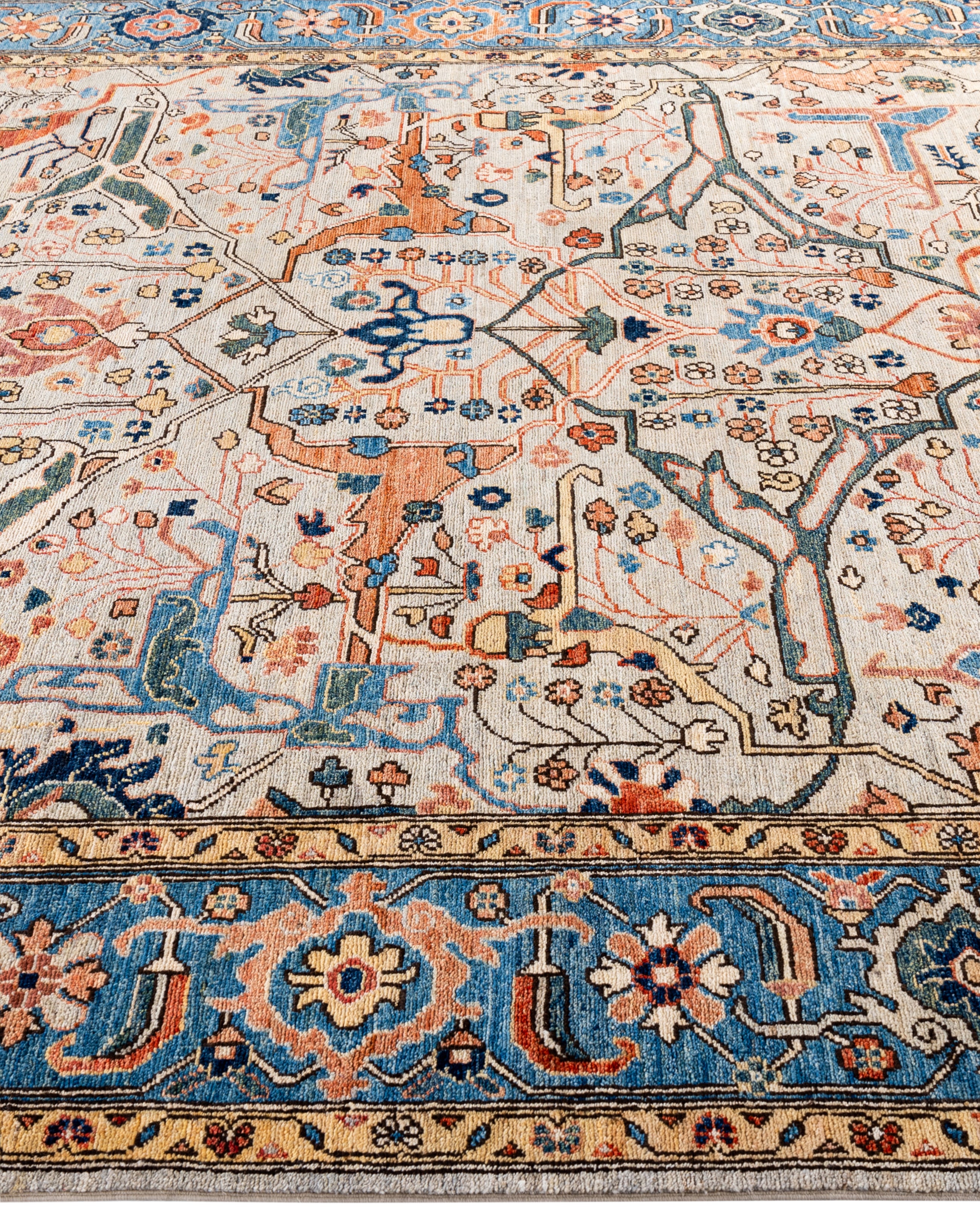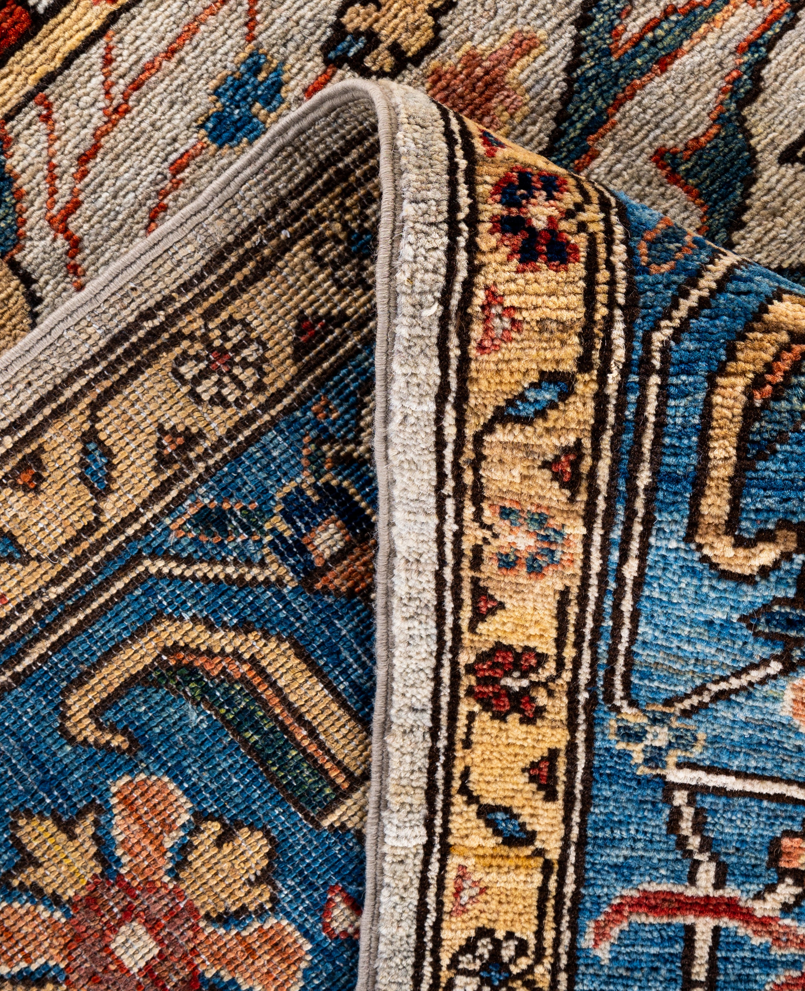 Serapi rugs are known for their bold, geometric designs and rich colors, often featuring a central medallion surrounded by intricate patterns. They typically use a warm, earthy color palette with deep reds, blues, ivory, and occasional greens. The designs emphasize large-scale motifs, including angular vines, leaves, and floral elements, giving the rugs a distinctive, almost architectural appearance. These rugs are hand-knotted and are prized for their durability and high-quality craftsmanship. Their unique aesthetic is attributed to a blend of traditional motifs with more refined, spacious compositions. They are highly sought after by collectors and interior designers for their elegance and timeless appeal.