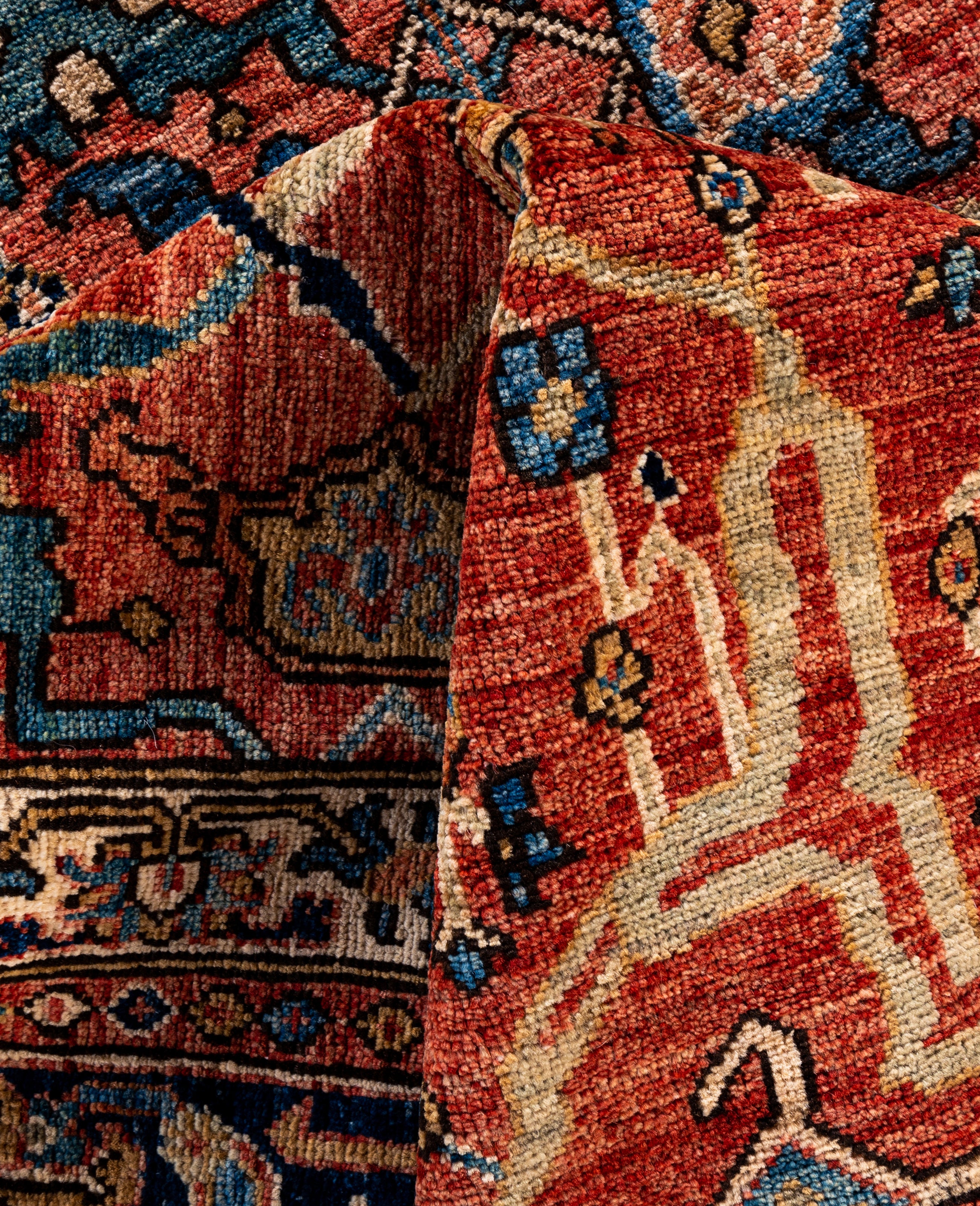Serapi rugs are known for their bold, geometric designs and rich colors, often featuring a central medallion surrounded by intricate patterns. They typically use a warm, earthy color palette with deep reds, blues, ivory, and occasional greens. The designs emphasize large-scale motifs, including angular vines, leaves, and floral elements, giving the rugs a distinctive, almost architectural appearance. These rugs are hand-knotted and are prized for their durability and high-quality craftsmanship. Their unique aesthetic is attributed to a blend of traditional motifs with more refined, spacious compositions. They are highly sought after by collectors and interior designers for their elegance and timeless appeal.