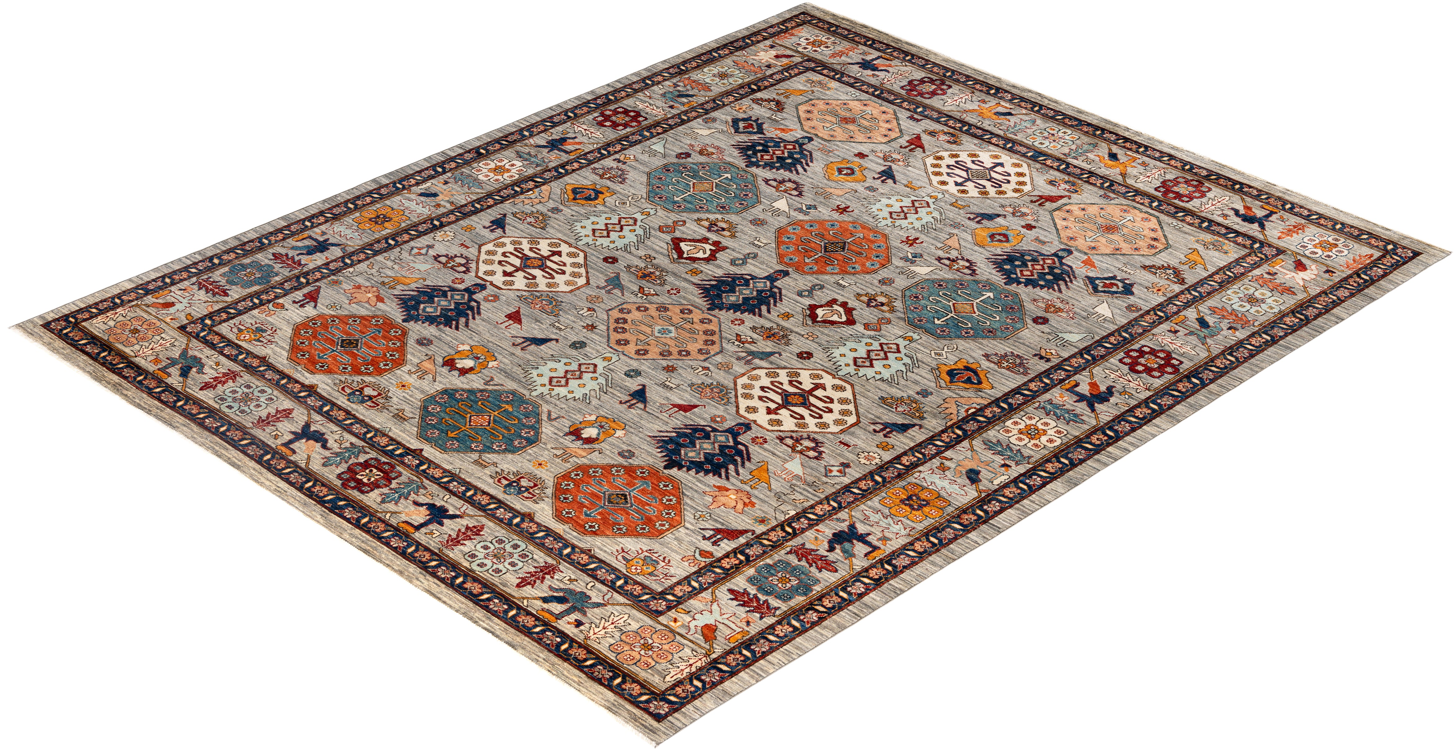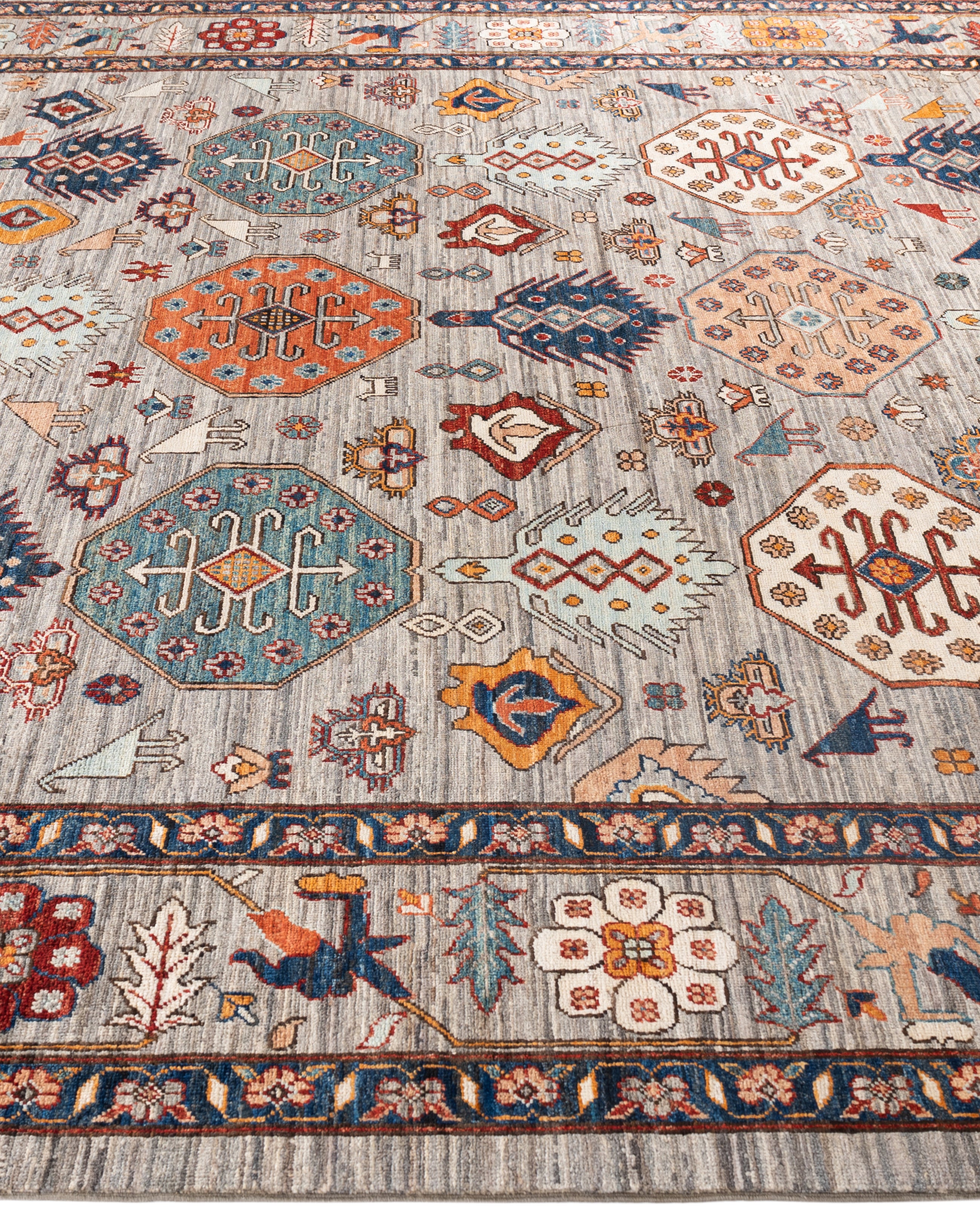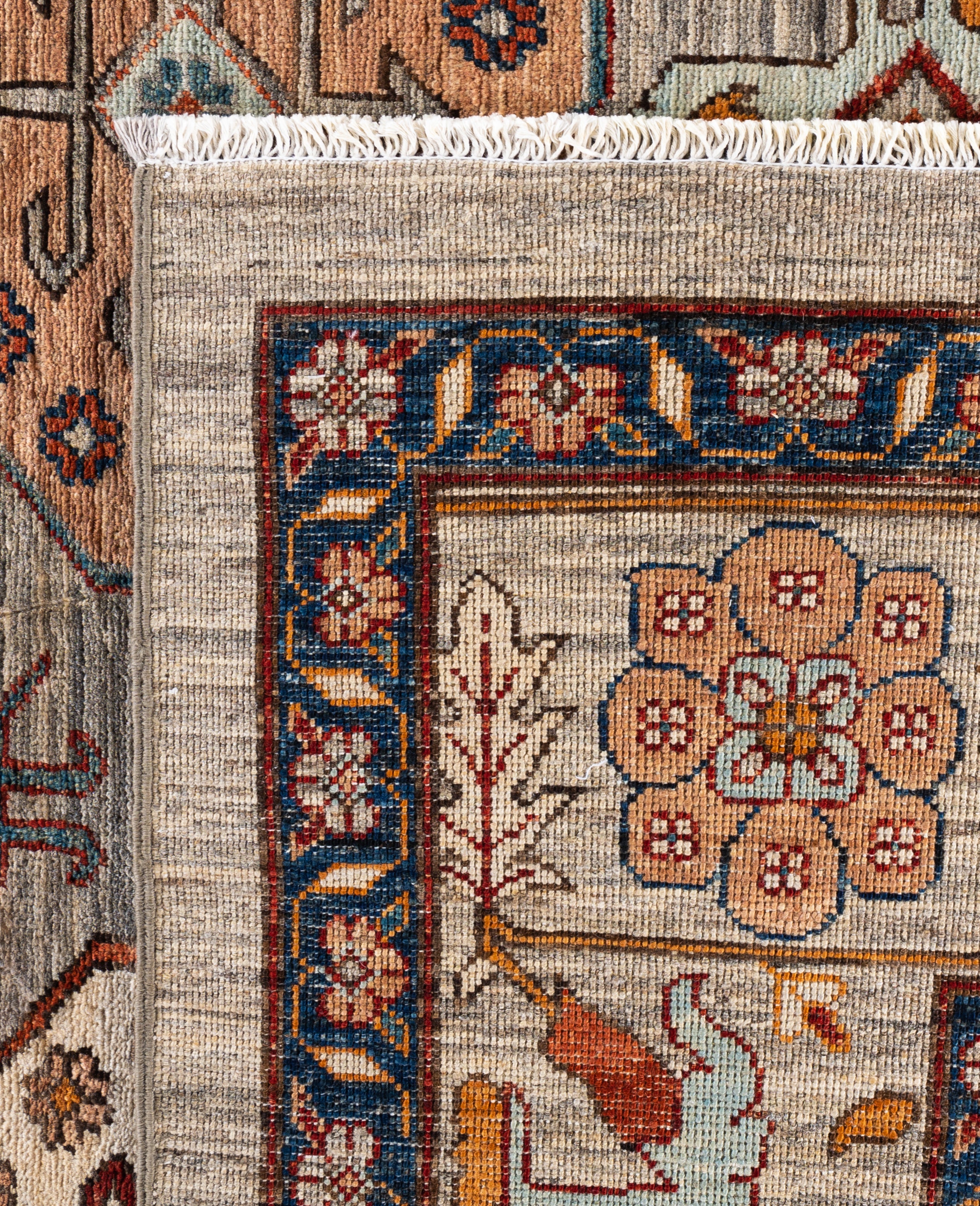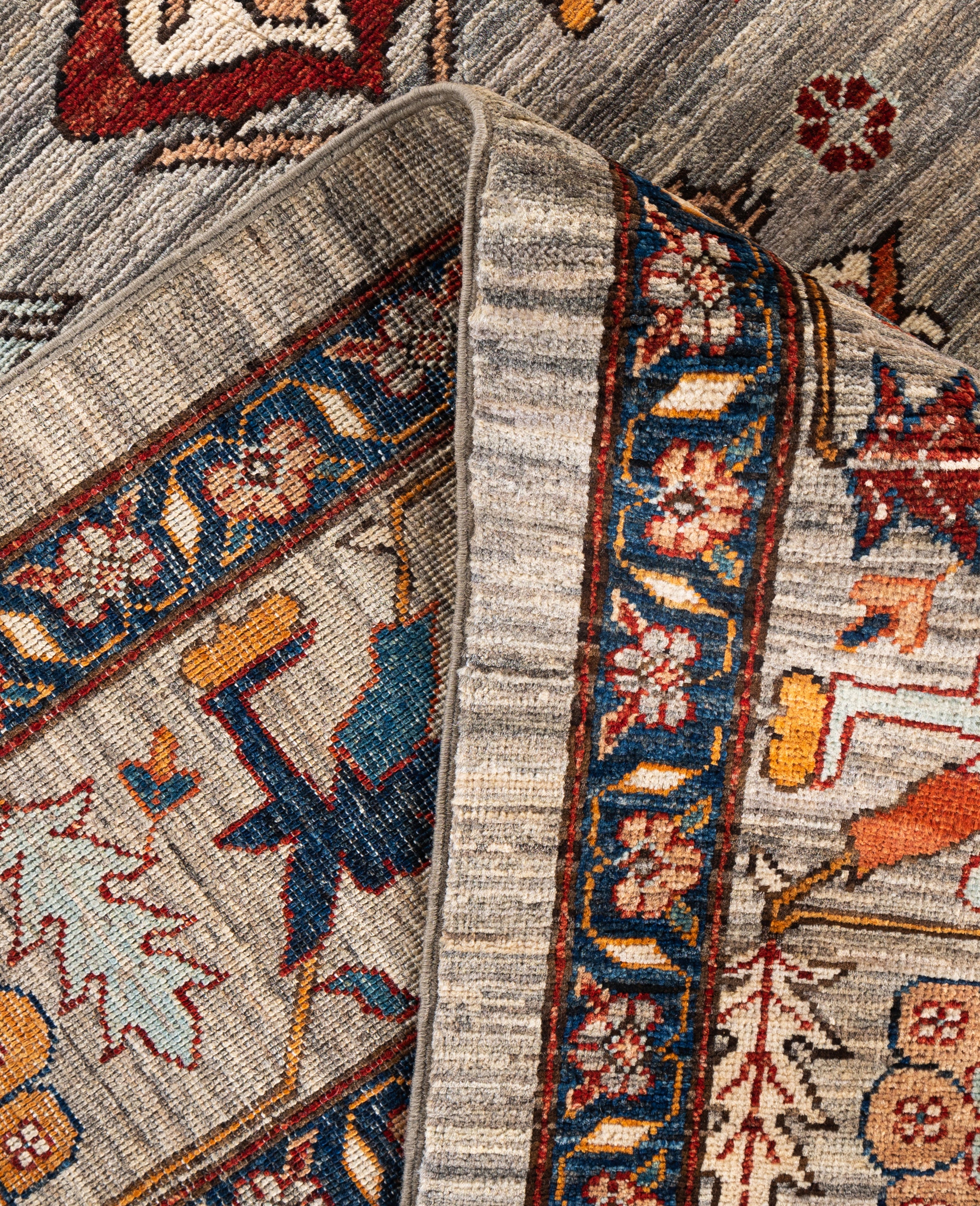 Serapi rugs are known for their bold, geometric designs and rich colors, often featuring a central medallion surrounded by intricate patterns. They typically use a warm, earthy color palette with deep reds, blues, ivory, and occasional greens. The designs emphasize large-scale motifs, including angular vines, leaves, and floral elements, giving the rugs a distinctive, almost architectural appearance. These rugs are hand-knotted and are prized for their durability and high-quality craftsmanship. Their unique aesthetic is attributed to a blend of traditional motifs with more refined, spacious compositions. They are highly sought after by collectors and interior designers for their elegance and timeless appeal.