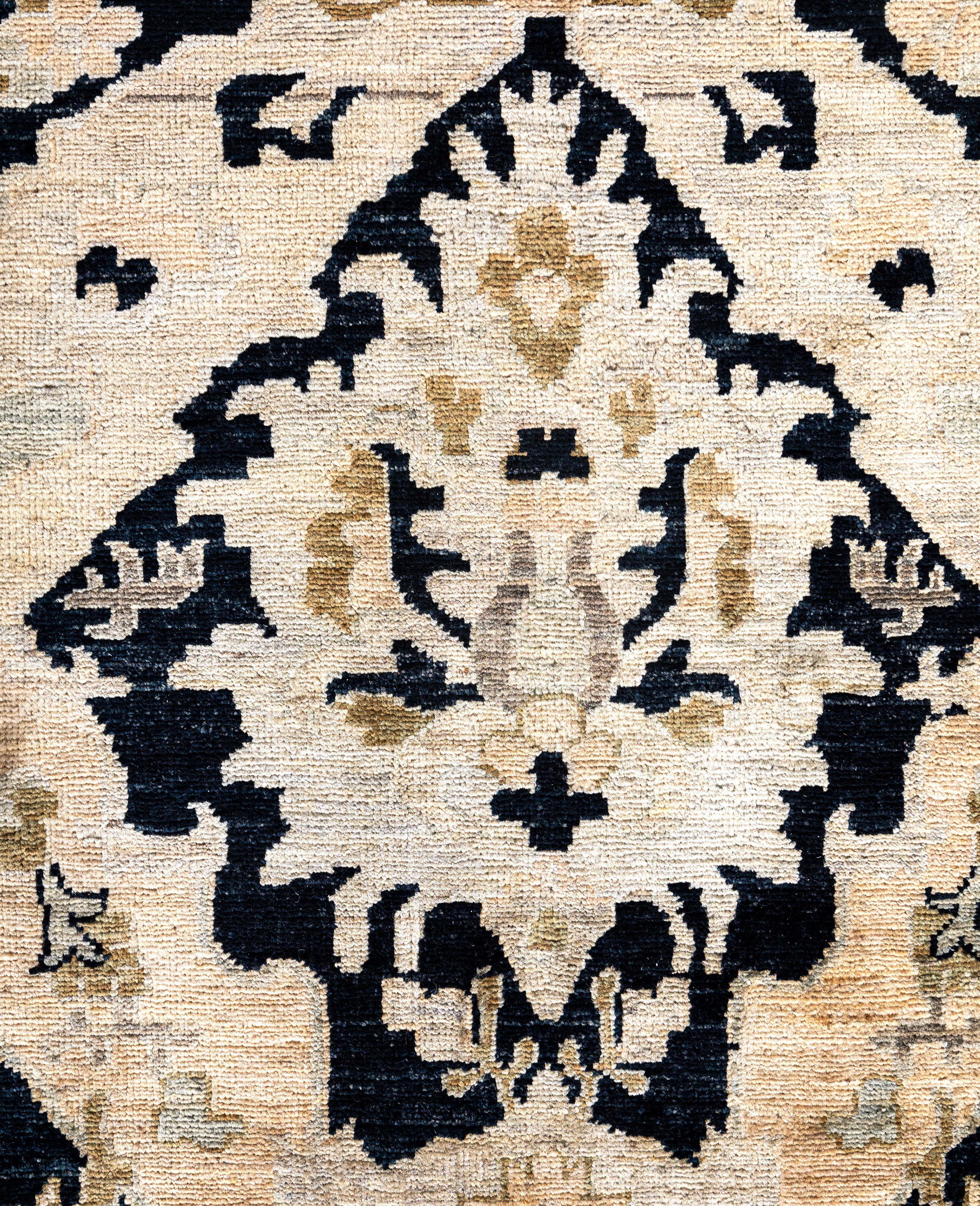 Serapi rugs are known for their bold, geometric designs and rich colors, often featuring a central medallion surrounded by intricate patterns. They typically use a warm, earthy color palette with deep reds, blues, ivory, and occasional greens. The designs emphasize large-scale motifs, including angular vines, leaves, and floral elements, giving the rugs a distinctive, almost architectural appearance. These rugs are hand-knotted and are prized for their durability and high-quality craftsmanship. Their unique aesthetic is attributed to a blend of traditional motifs with more refined, spacious compositions. They are highly sought after by collectors and interior designers for their elegance and timeless appeal.