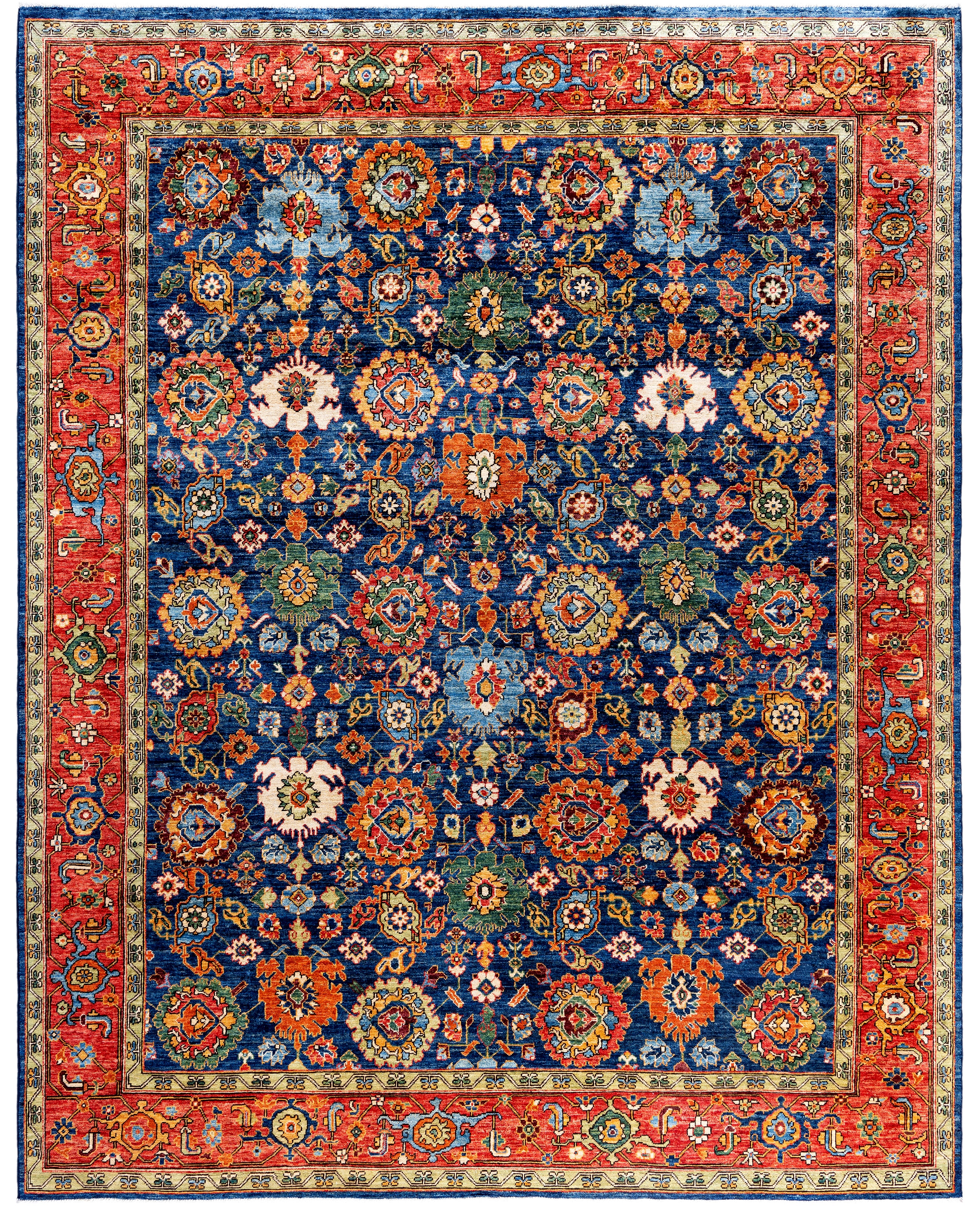 Serapi rugs are known for their bold, geometric designs and rich colors, often featuring a central medallion surrounded by intricate patterns. They typically use a warm, earthy color palette with deep reds, blues, ivory, and occasional greens. The designs emphasize large-scale motifs, including angular vines, leaves, and floral elements, giving the rugs a distinctive, almost architectural appearance. These rugs are hand-knotted and are prized for their durability and high-quality craftsmanship. Their unique aesthetic is attributed to a blend of traditional motifs with more refined, spacious compositions. They are highly sought after by collectors and interior designers for their elegance and timeless appeal.