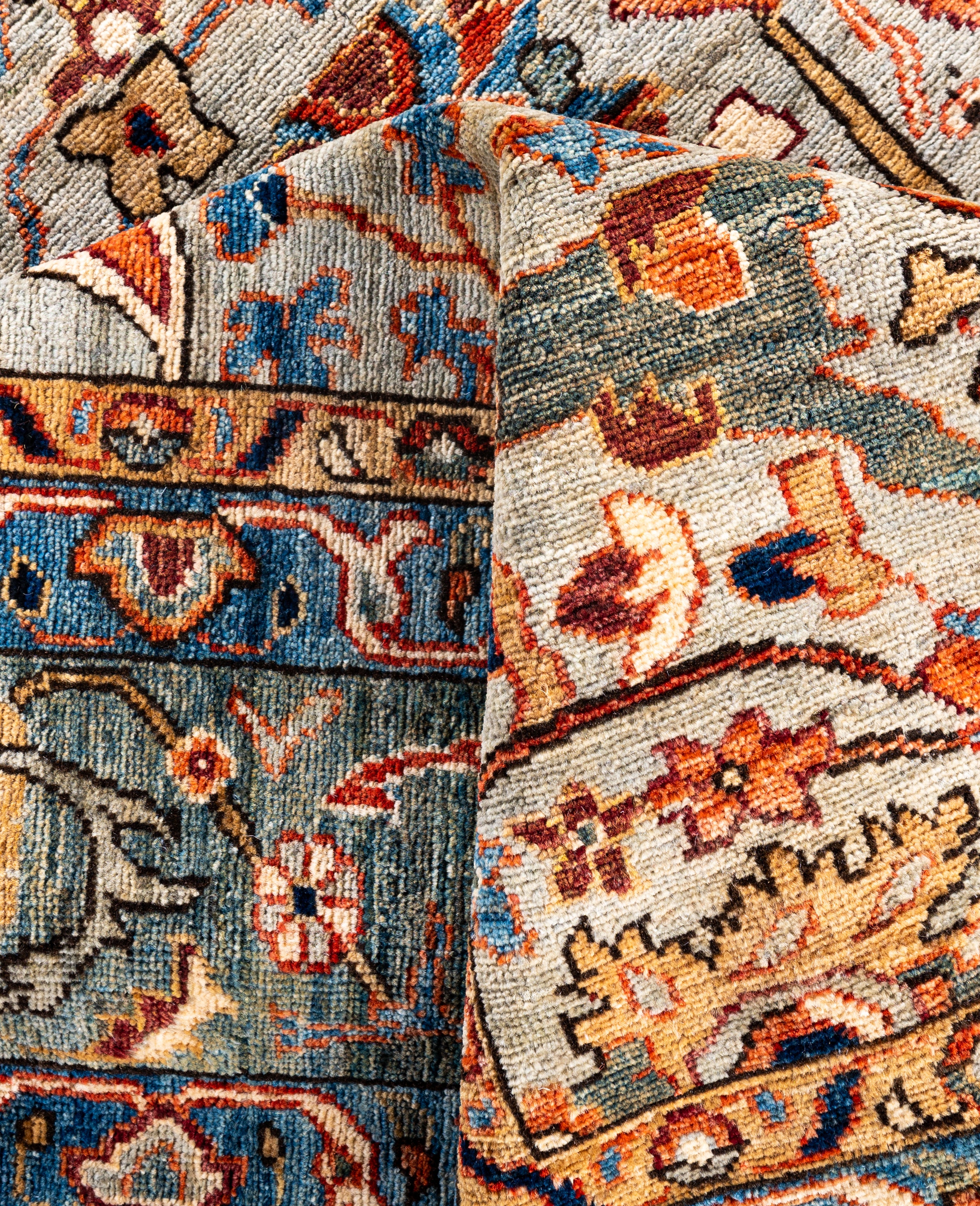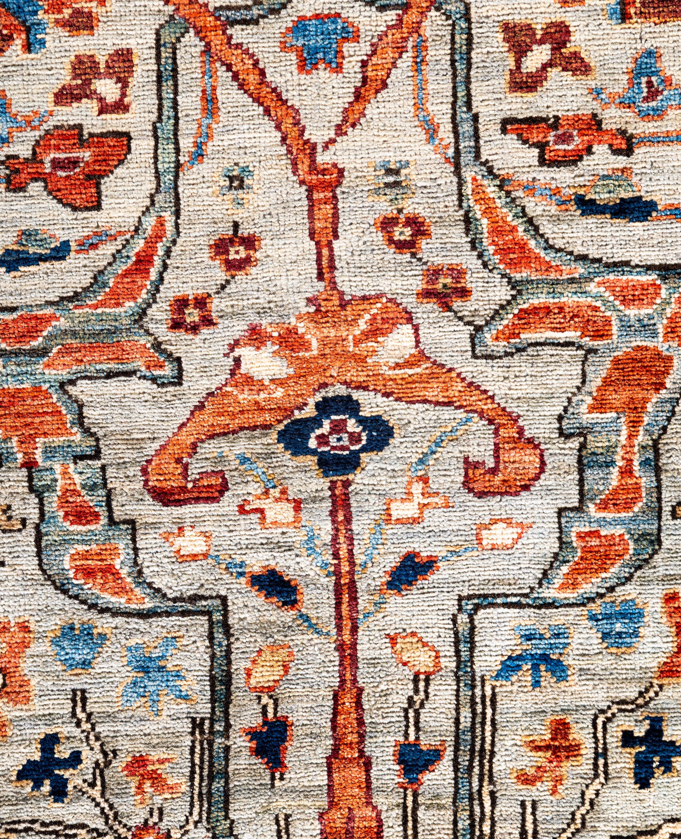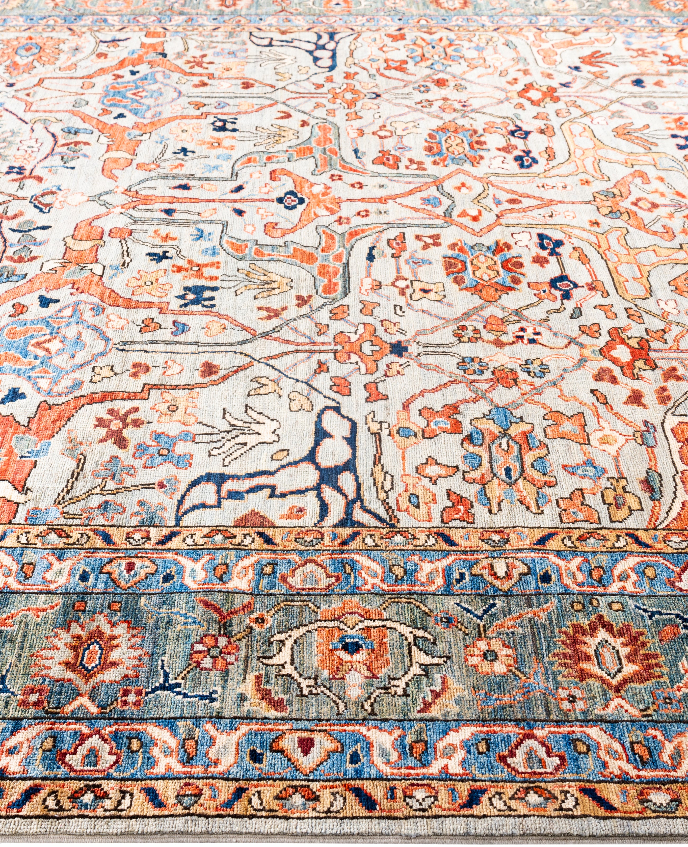 Serapi rugs are known for their bold, geometric designs and rich colors, often featuring a central medallion surrounded by intricate patterns. They typically use a warm, earthy color palette with deep reds, blues, ivory, and occasional greens. The designs emphasize large-scale motifs, including angular vines, leaves, and floral elements, giving the rugs a distinctive, almost architectural appearance. These rugs are hand-knotted and are prized for their durability and high-quality craftsmanship. Their unique aesthetic is attributed to a blend of traditional motifs with more refined, spacious compositions. They are highly sought after by collectors and interior designers for their elegance and timeless appeal.