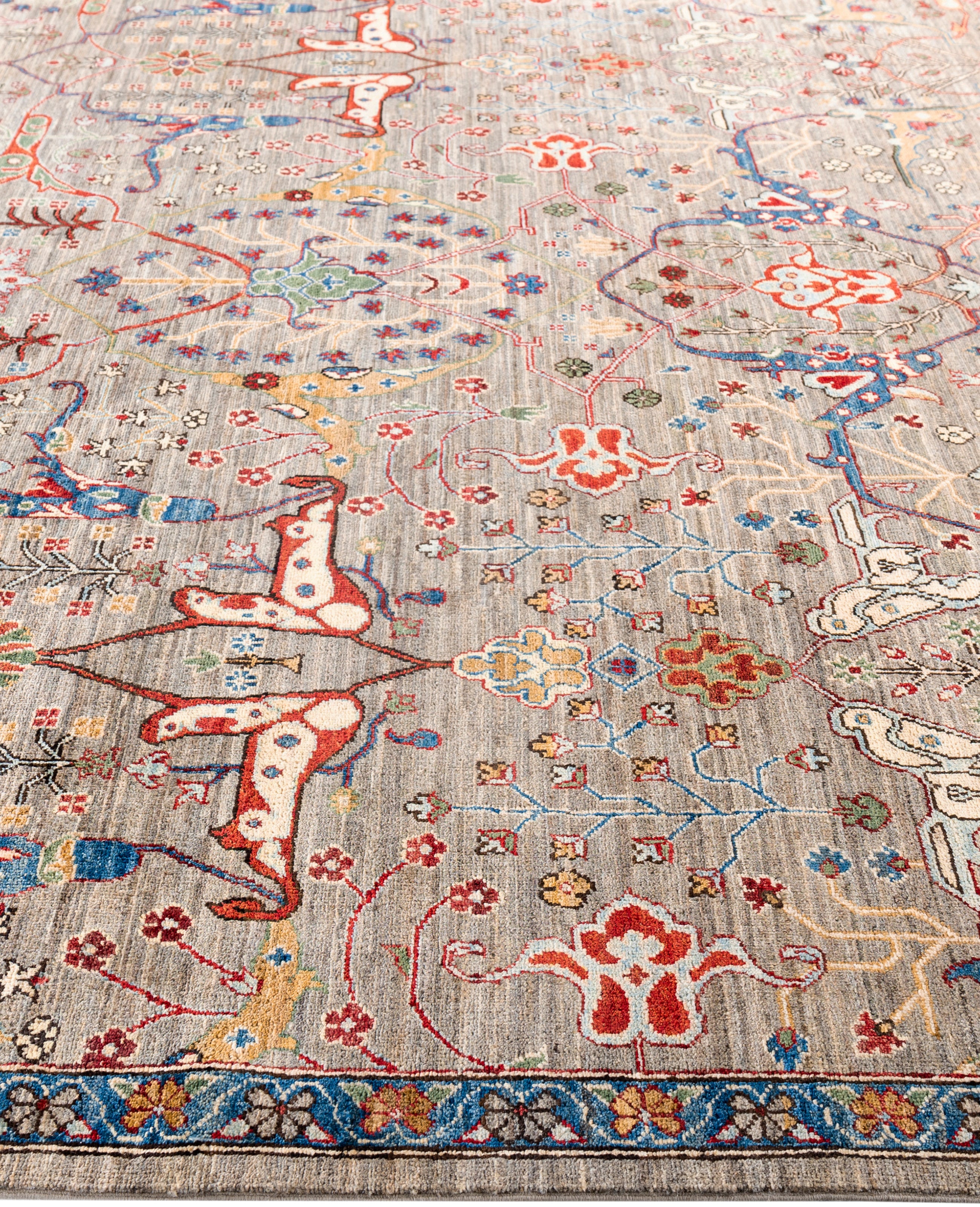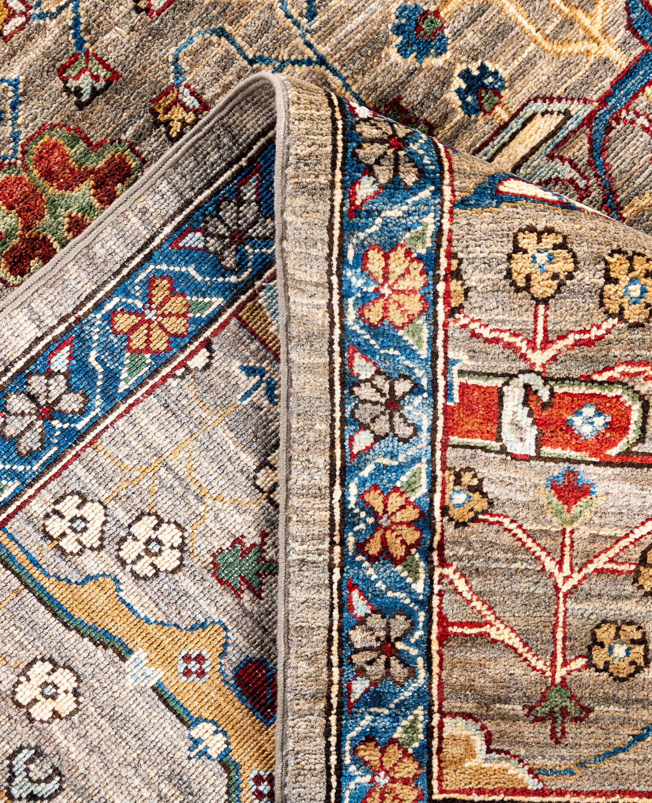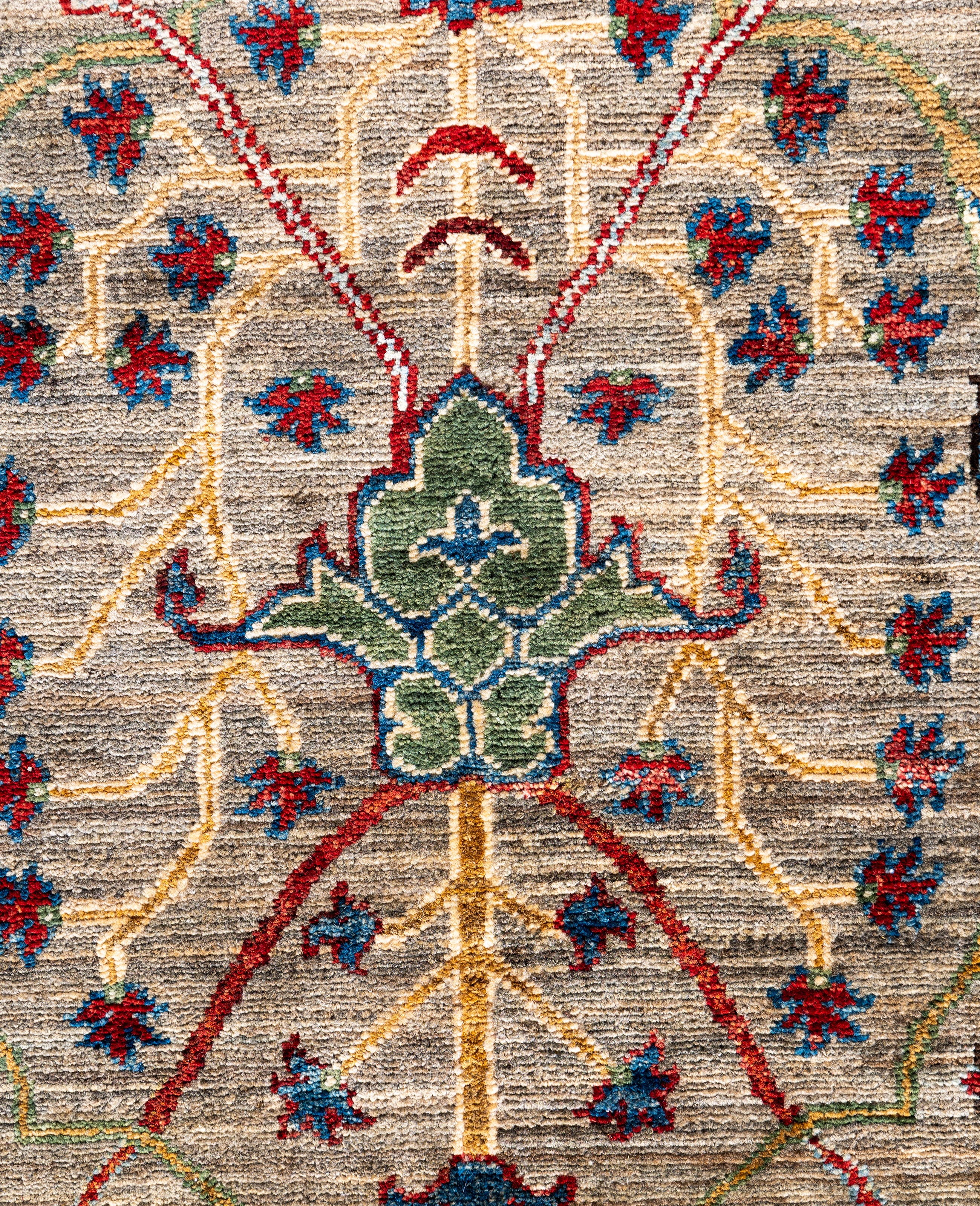 Serapi rugs are known for their bold, geometric designs and rich colors, often featuring a central medallion surrounded by intricate patterns. They typically use a warm, earthy color palette with deep reds, blues, ivory, and occasional greens. The designs emphasize large-scale motifs, including angular vines, leaves, and floral elements, giving the rugs a distinctive, almost architectural appearance. These rugs are hand-knotted and are prized for their durability and high-quality craftsmanship. Their unique aesthetic is attributed to a blend of traditional motifs with more refined, spacious compositions. They are highly sought after by collectors and interior designers for their elegance and timeless appeal.