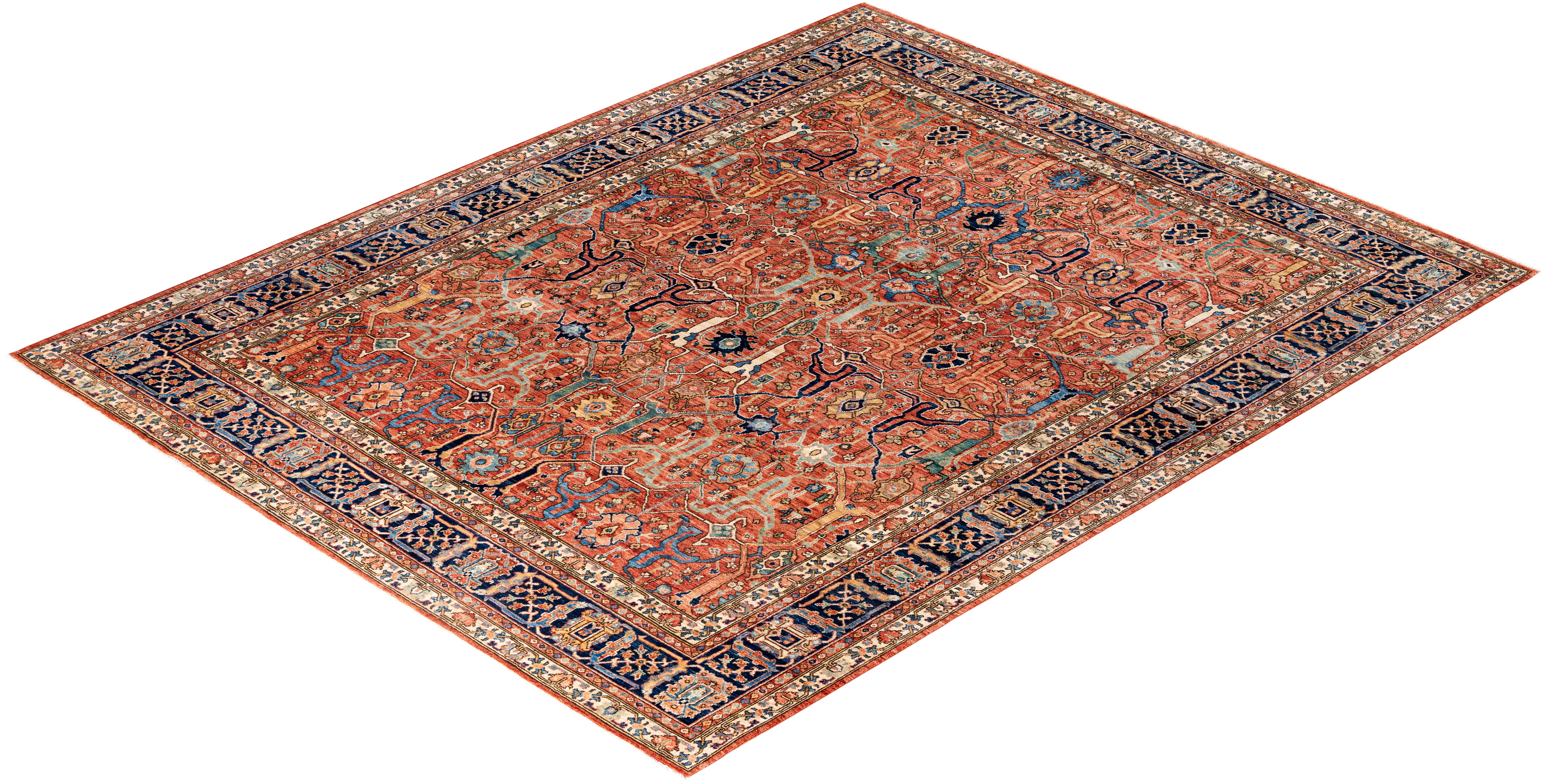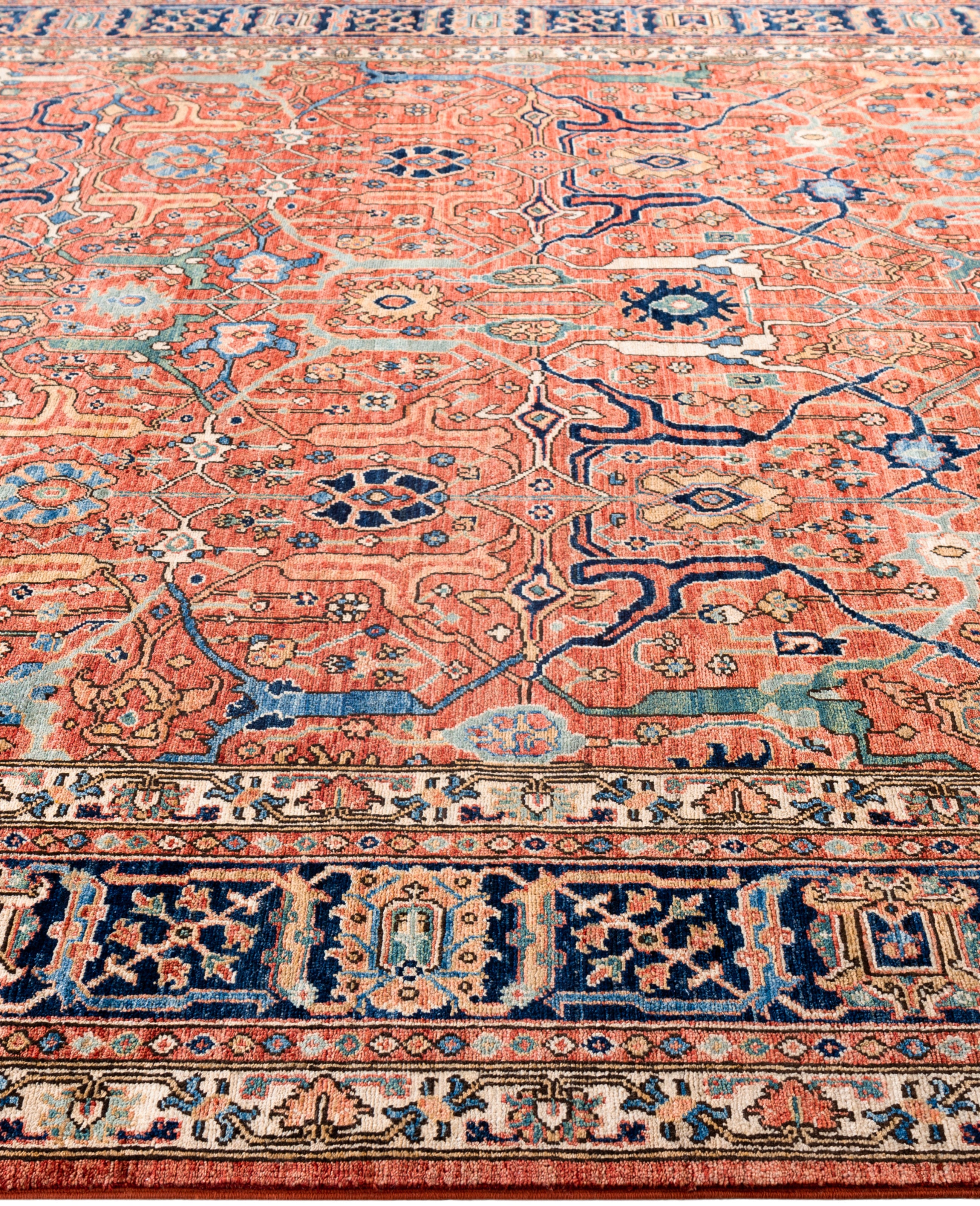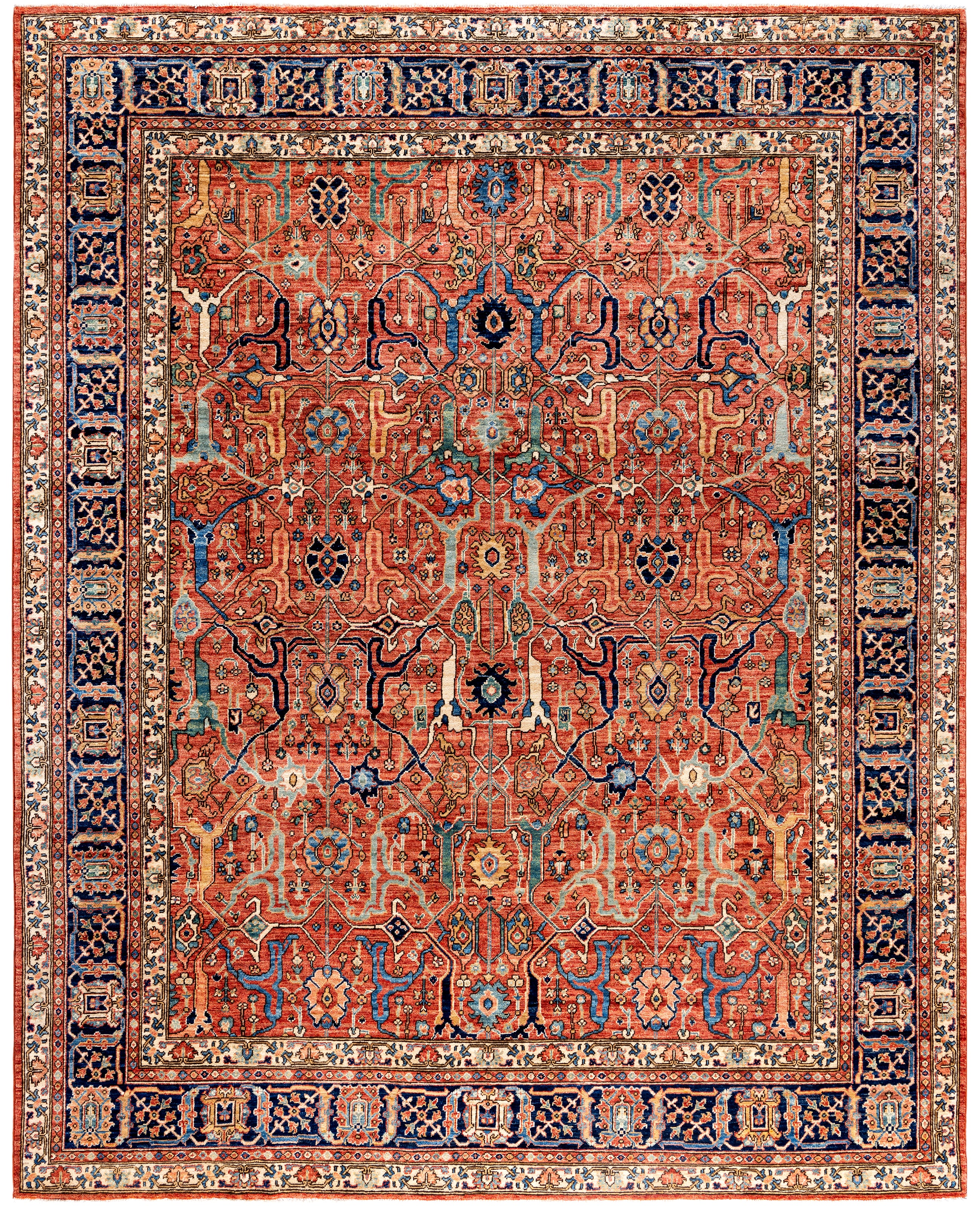 Serapi rugs are known for their bold, geometric designs and rich colors, often featuring a central medallion surrounded by intricate patterns. They typically use a warm, earthy color palette with deep reds, blues, ivory, and occasional greens. The designs emphasize large-scale motifs, including angular vines, leaves, and floral elements, giving the rugs a distinctive, almost architectural appearance. These rugs are hand-knotted and are prized for their durability and high-quality craftsmanship. Their unique aesthetic is attributed to a blend of traditional motifs with more refined, spacious compositions. They are highly sought after by collectors and interior designers for their elegance and timeless appeal.