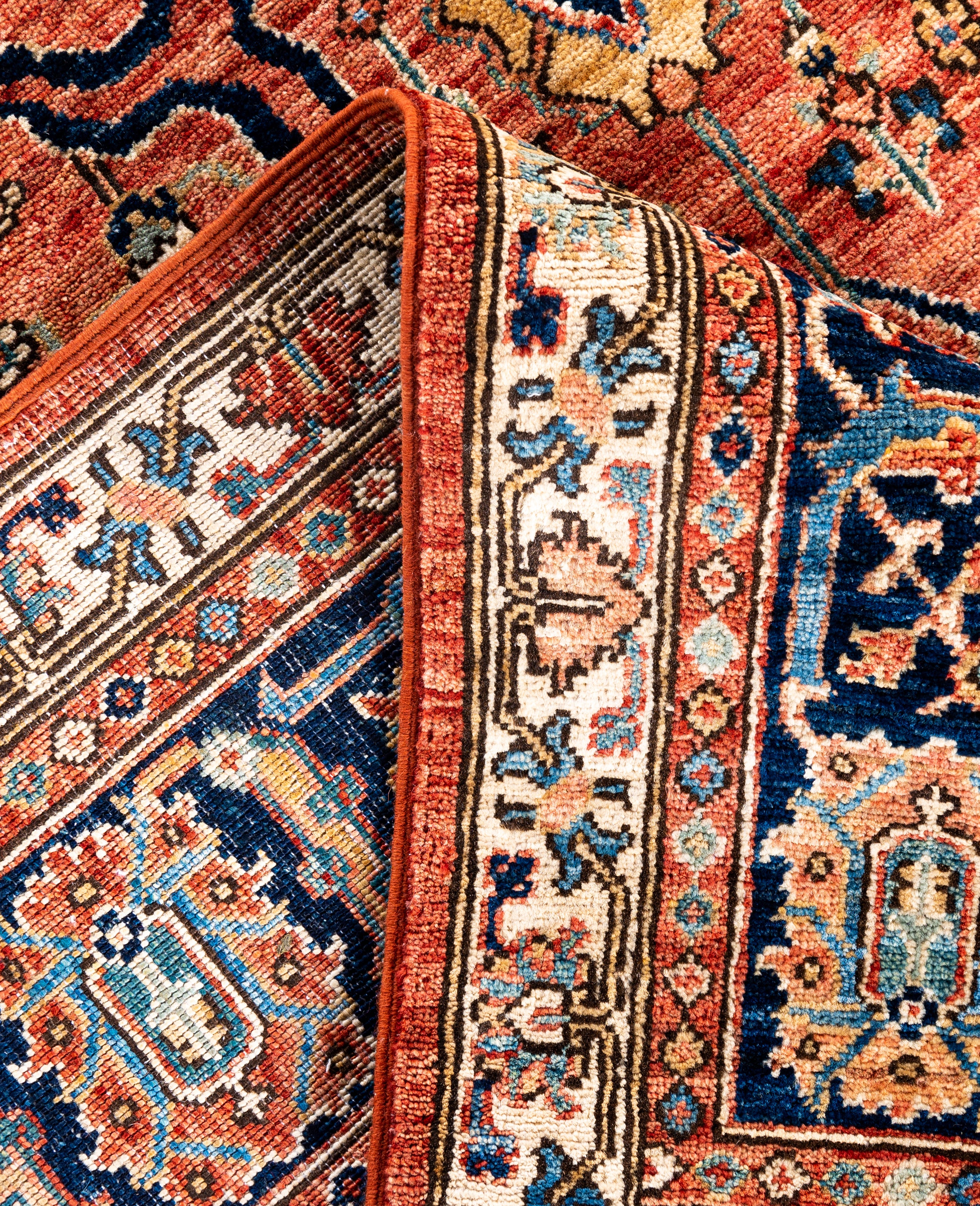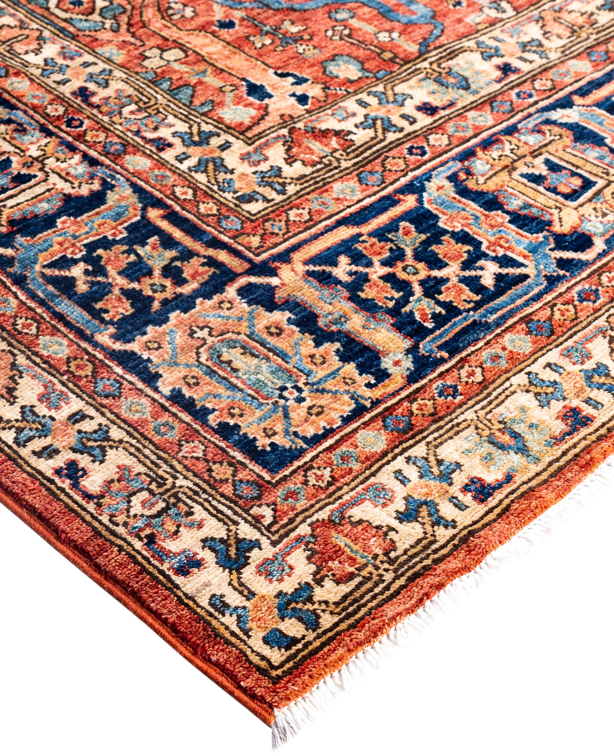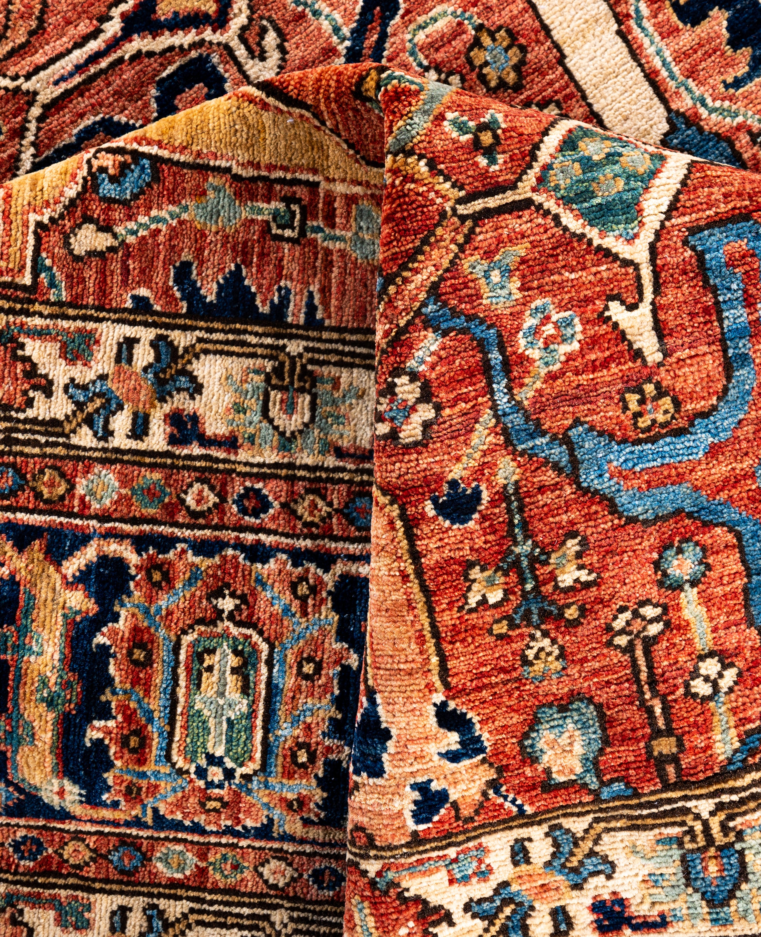 Serapi rugs are known for their bold, geometric designs and rich colors, often featuring a central medallion surrounded by intricate patterns. They typically use a warm, earthy color palette with deep reds, blues, ivory, and occasional greens. The designs emphasize large-scale motifs, including angular vines, leaves, and floral elements, giving the rugs a distinctive, almost architectural appearance. These rugs are hand-knotted and are prized for their durability and high-quality craftsmanship. Their unique aesthetic is attributed to a blend of traditional motifs with more refined, spacious compositions. They are highly sought after by collectors and interior designers for their elegance and timeless appeal.