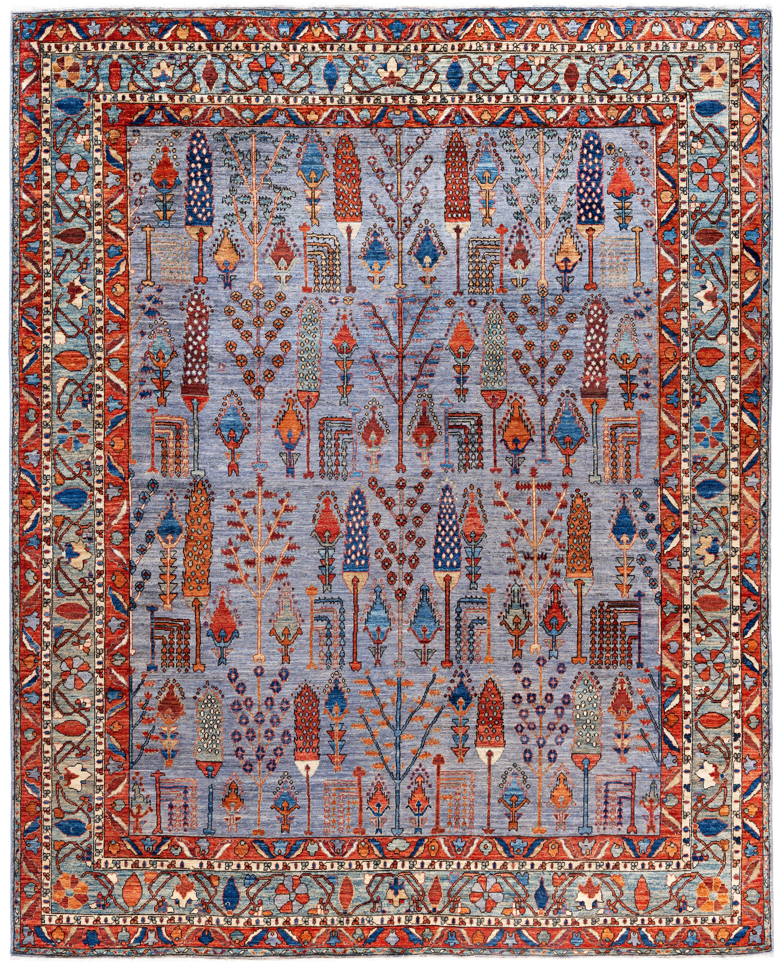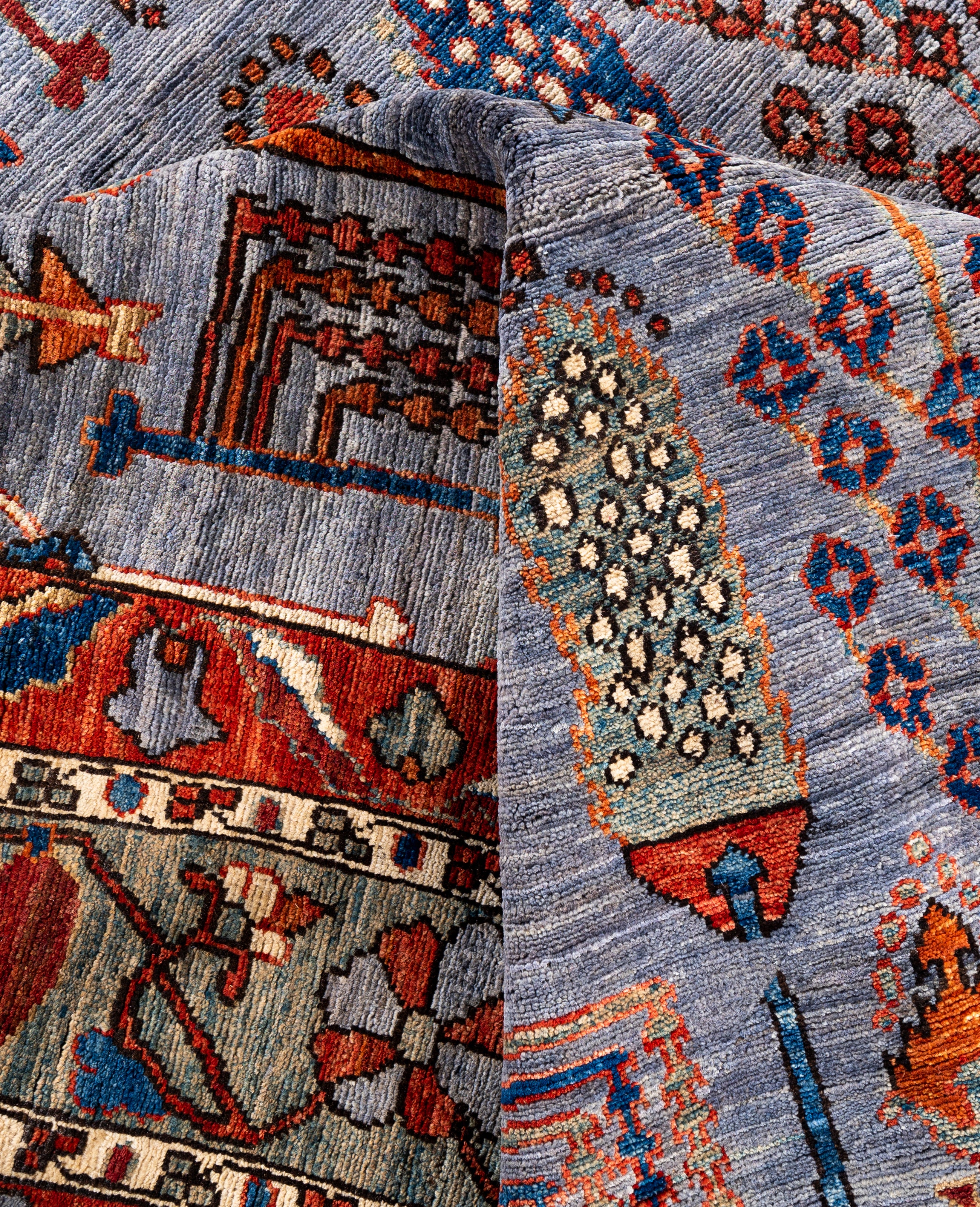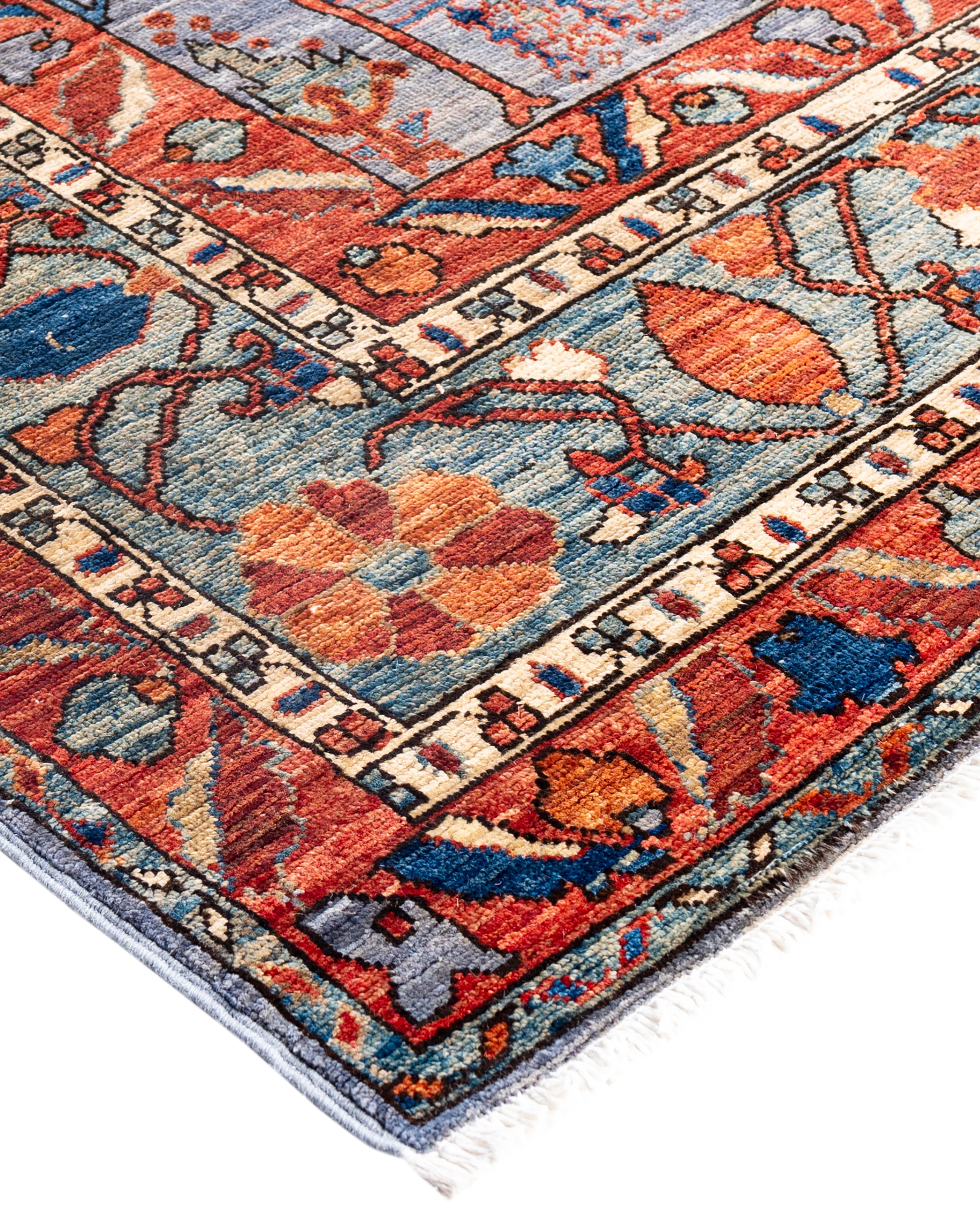 Serapi rugs are known for their bold, geometric designs and rich colors, often featuring a central medallion surrounded by intricate patterns. They typically use a warm, earthy color palette with deep reds, blues, ivory, and occasional greens. The designs emphasize large-scale motifs, including angular vines, leaves, and floral elements, giving the rugs a distinctive, almost architectural appearance. These rugs are hand-knotted and are prized for their durability and high-quality craftsmanship. Their unique aesthetic is attributed to a blend of traditional motifs with more refined, spacious compositions. They are highly sought after by collectors and interior designers for their elegance and timeless appeal.