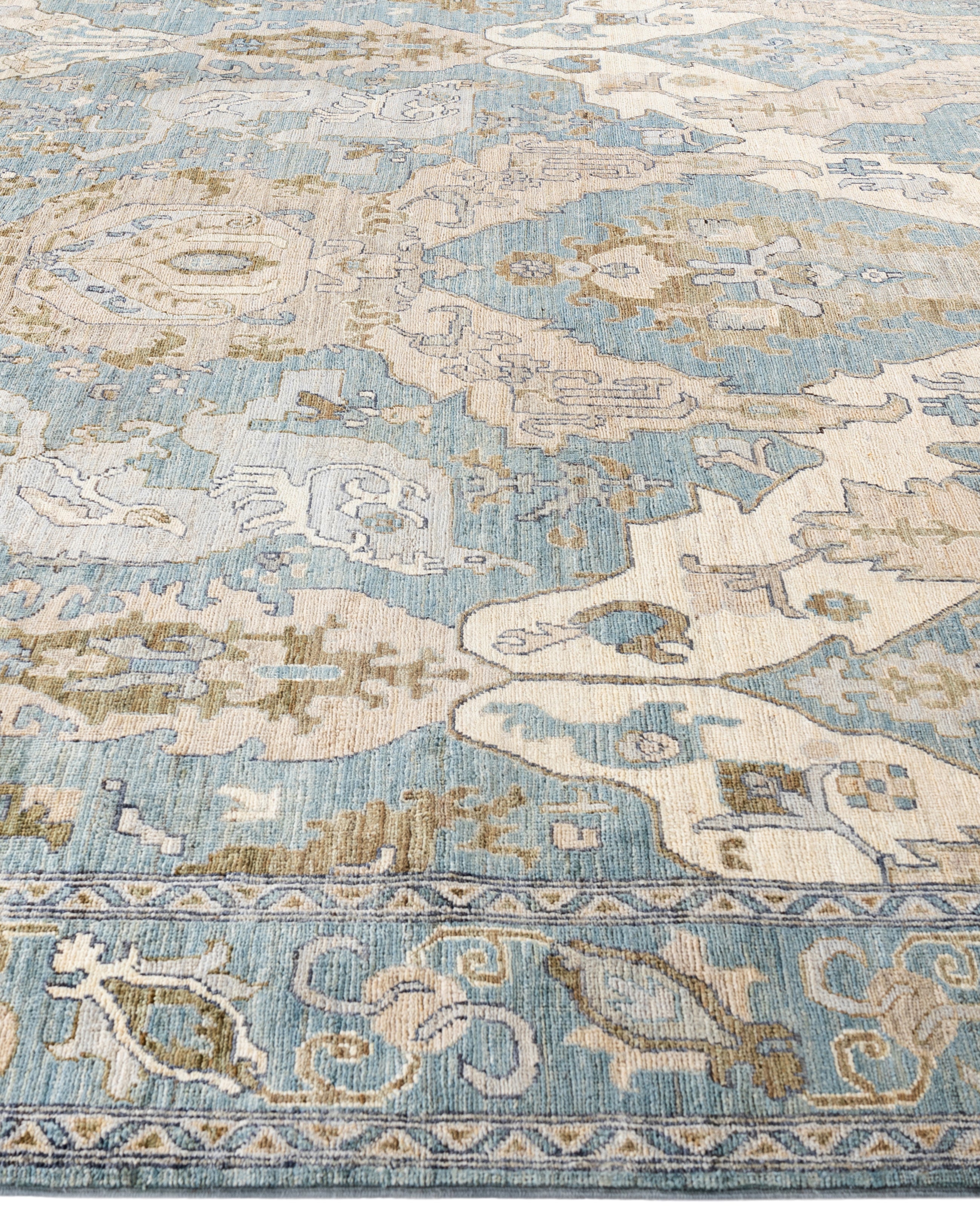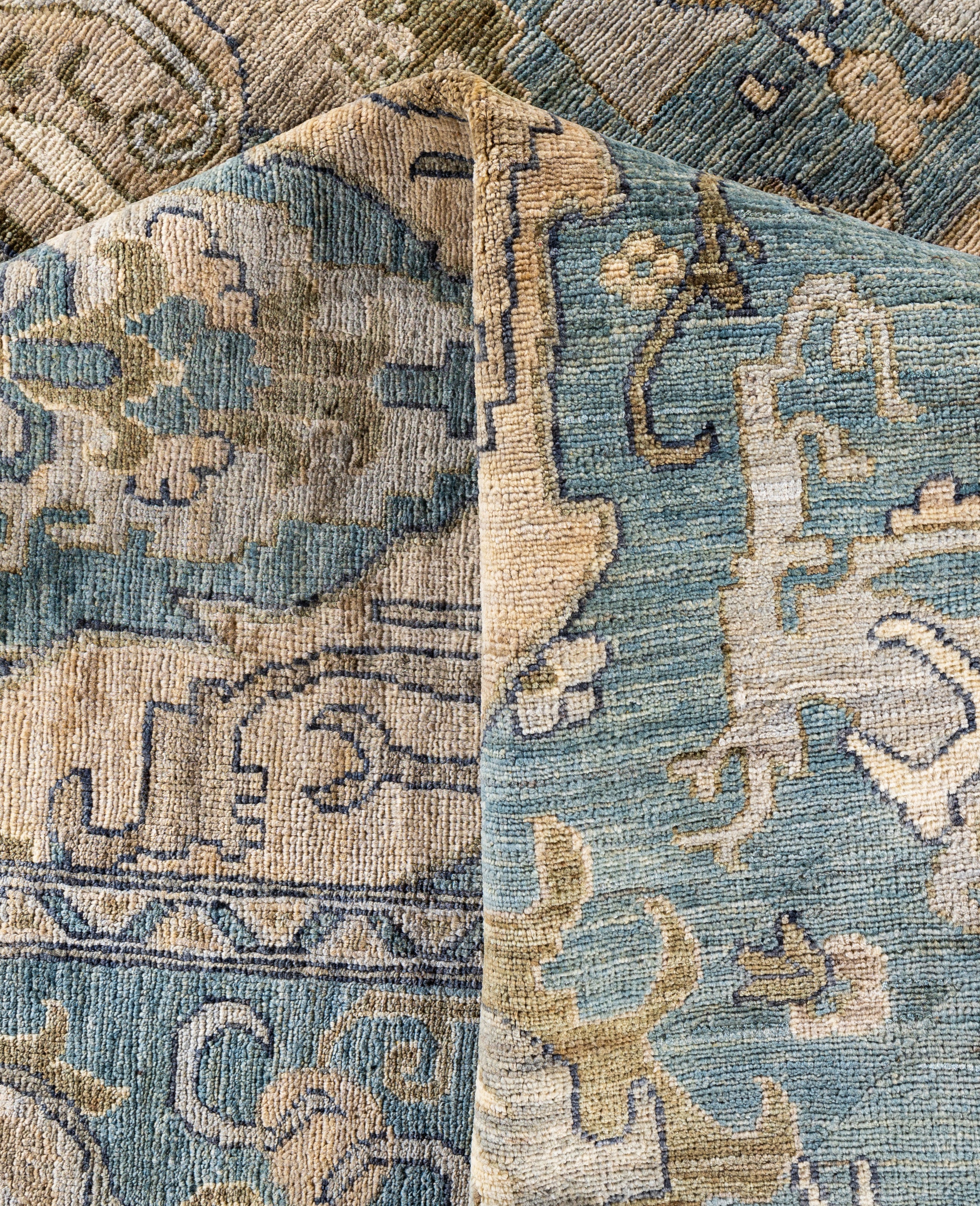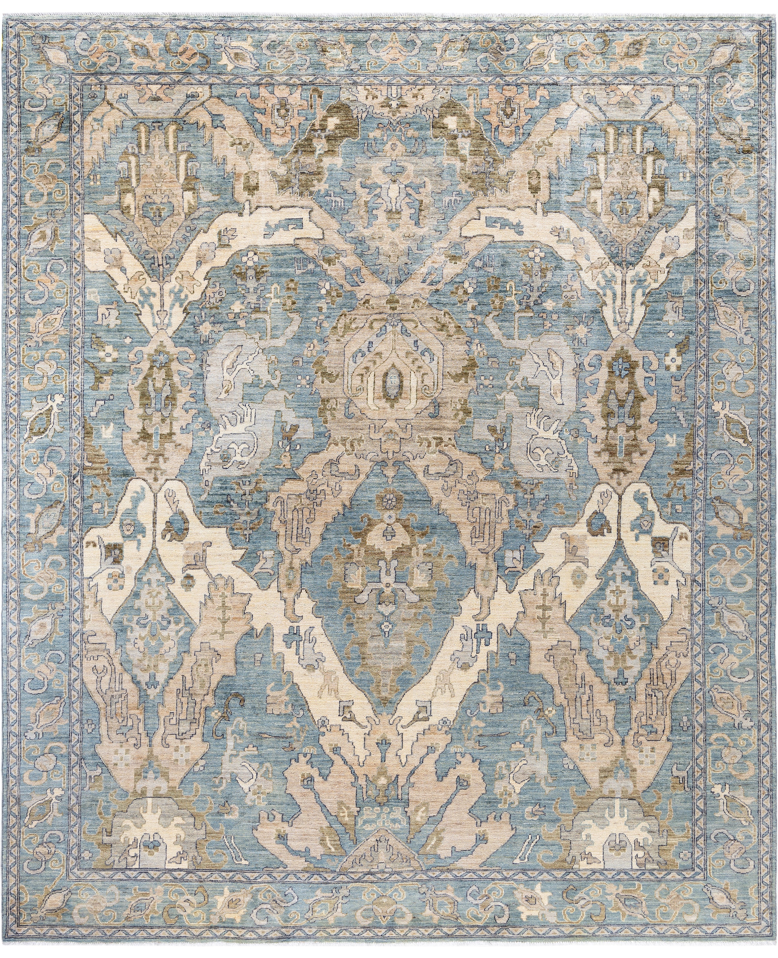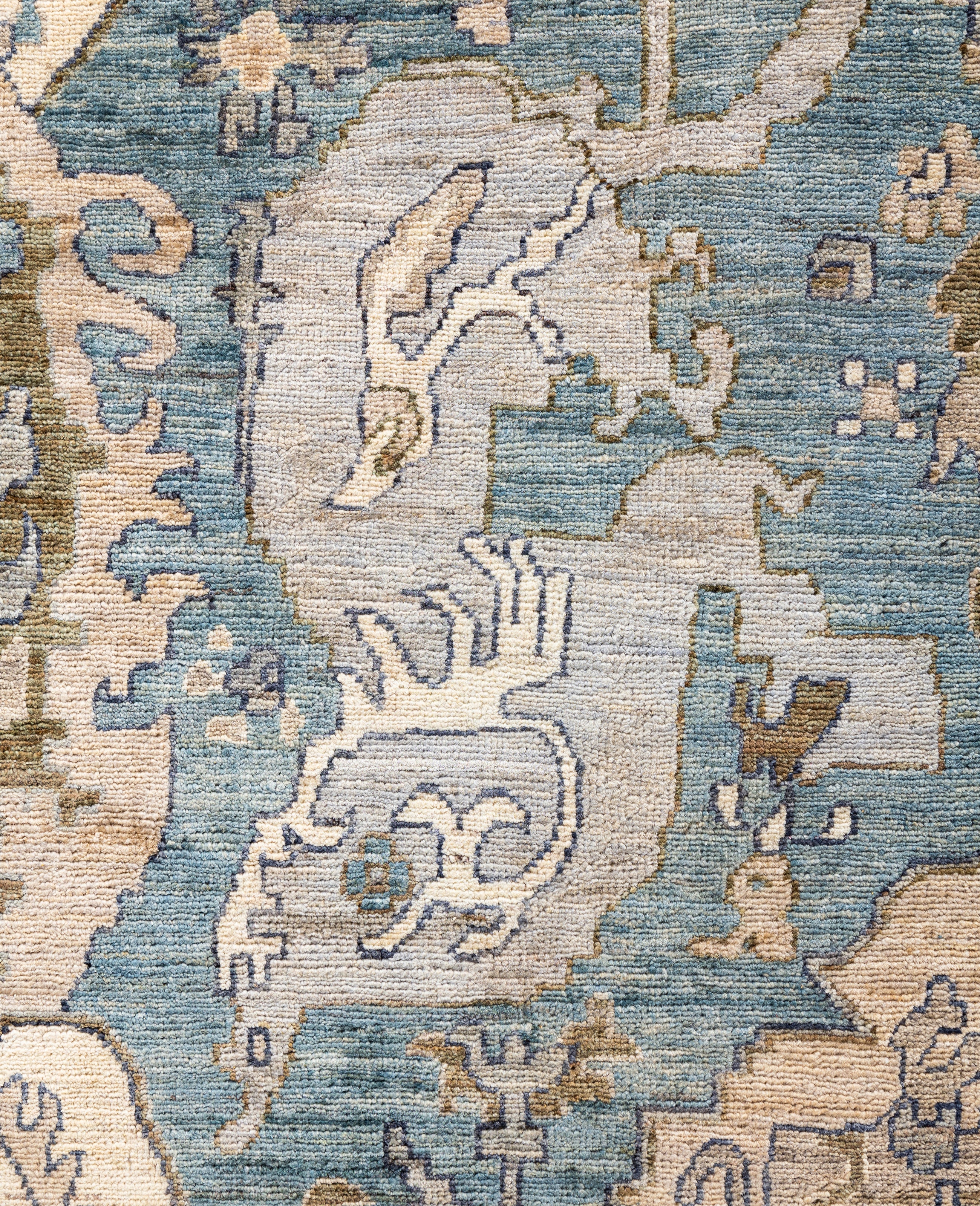 Serapi rugs are known for their bold, geometric designs and rich colors, often featuring a central medallion surrounded by intricate patterns. They typically use a warm, earthy color palette with deep reds, blues, ivory, and occasional greens. The designs emphasize large-scale motifs, including angular vines, leaves, and floral elements, giving the rugs a distinctive, almost architectural appearance. These rugs are hand-knotted and are prized for their durability and high-quality craftsmanship. Their unique aesthetic is attributed to a blend of traditional motifs with more refined, spacious compositions. They are highly sought after by collectors and interior designers for their elegance and timeless appeal.
