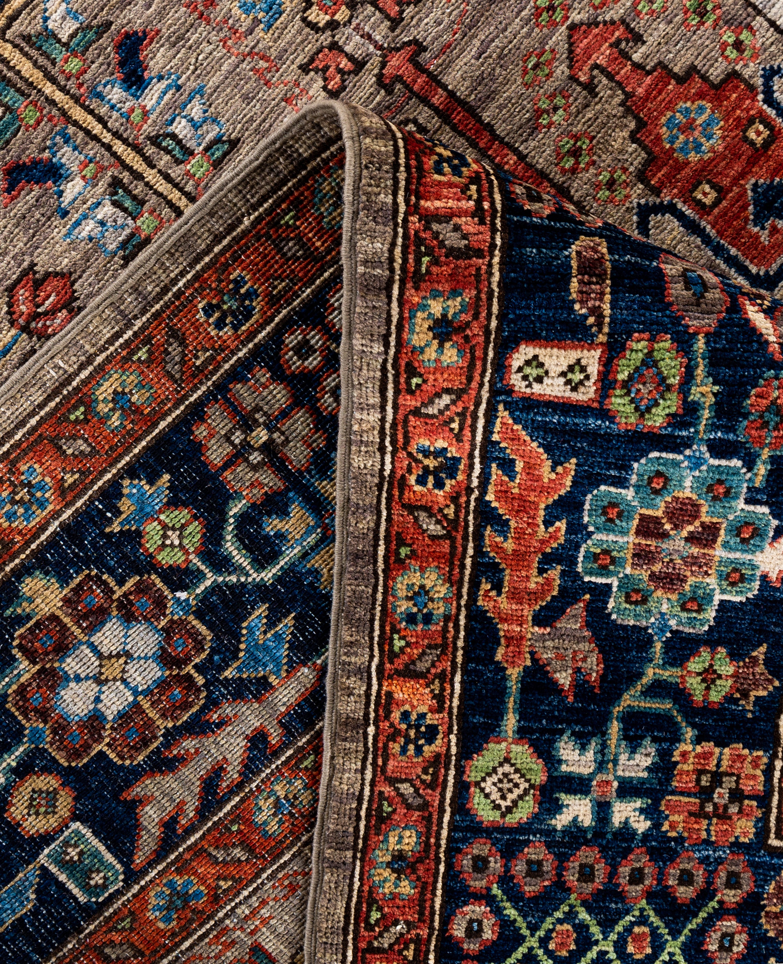 Serapi rugs are known for their bold, geometric designs and rich colors, often featuring a central medallion surrounded by intricate patterns. They typically use a warm, earthy color palette with deep reds, blues, ivory, and occasional greens. The designs emphasize large-scale motifs, including angular vines, leaves, and floral elements, giving the rugs a distinctive, almost architectural appearance. These rugs are hand-knotted and are prized for their durability and high-quality craftsmanship. Their unique aesthetic is attributed to a blend of traditional motifs with more refined, spacious compositions. They are highly sought after by collectors and interior designers for their elegance and timeless appeal.