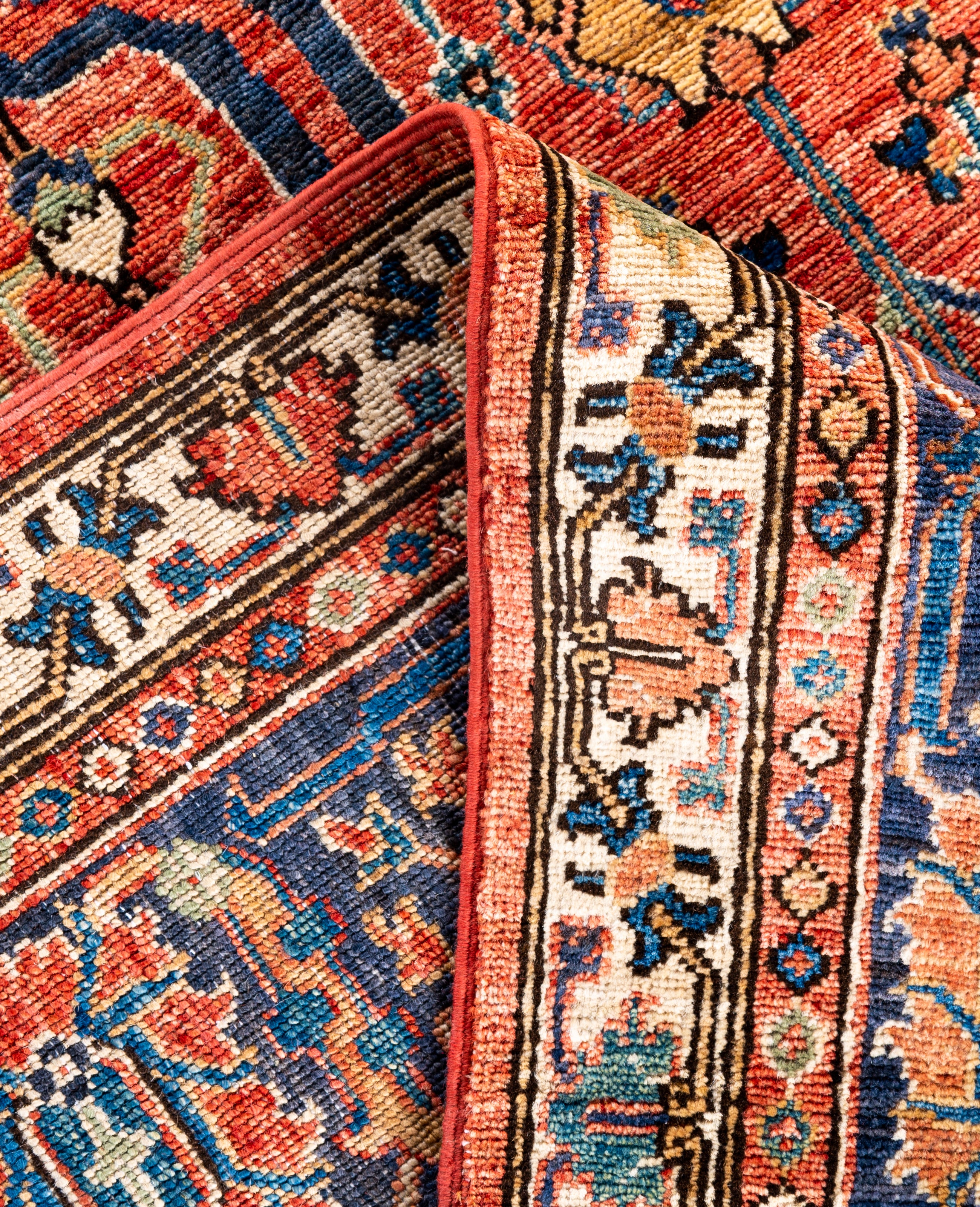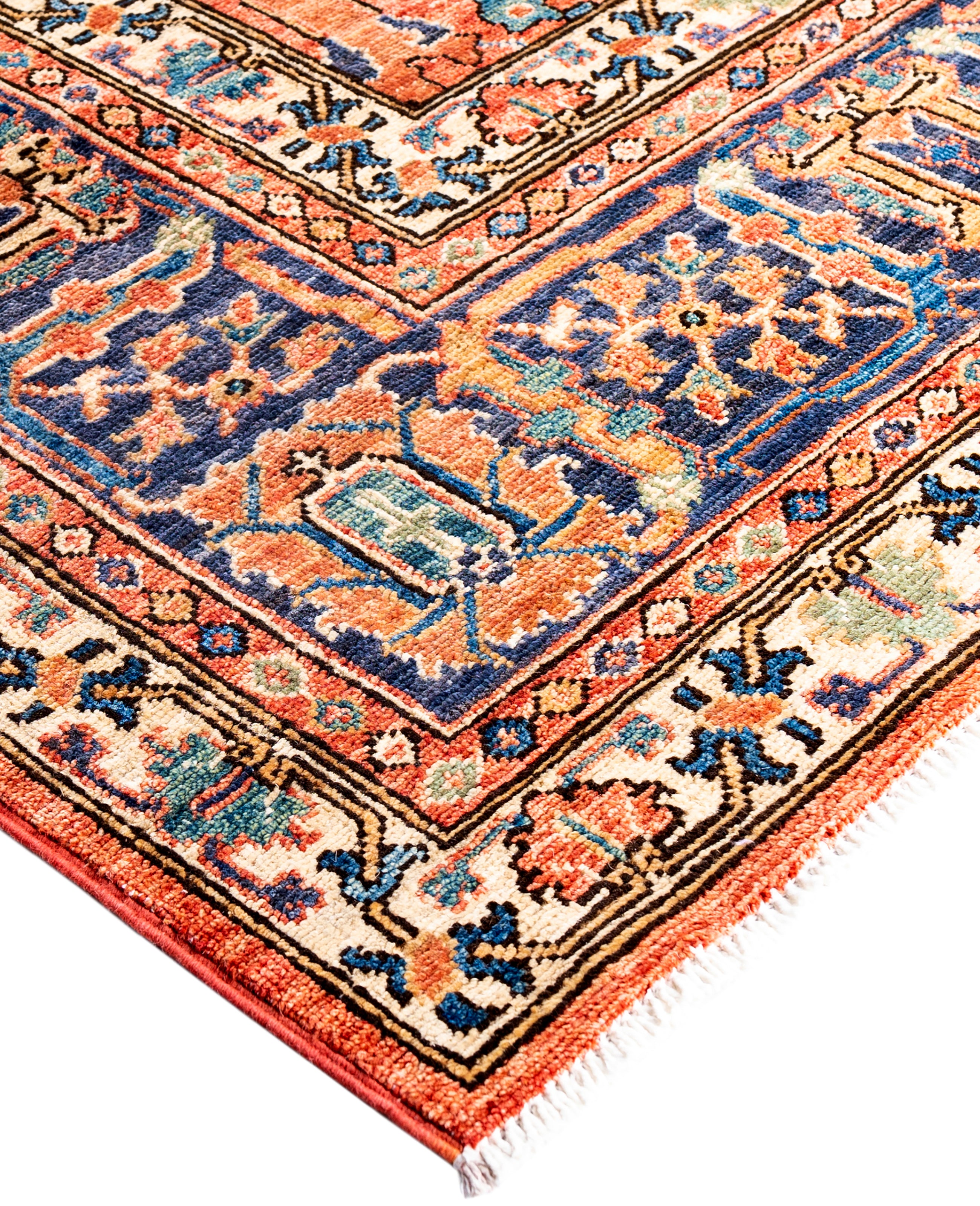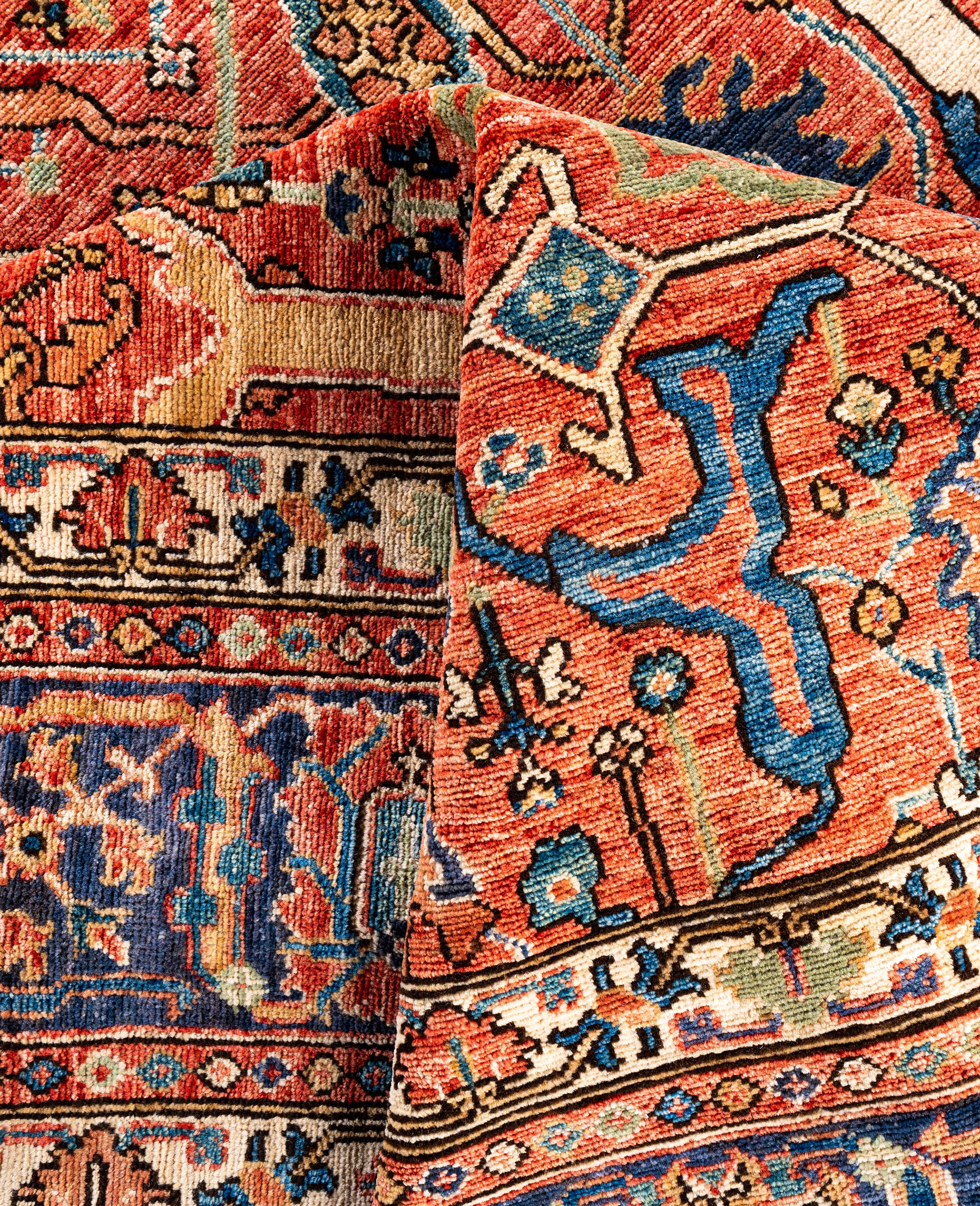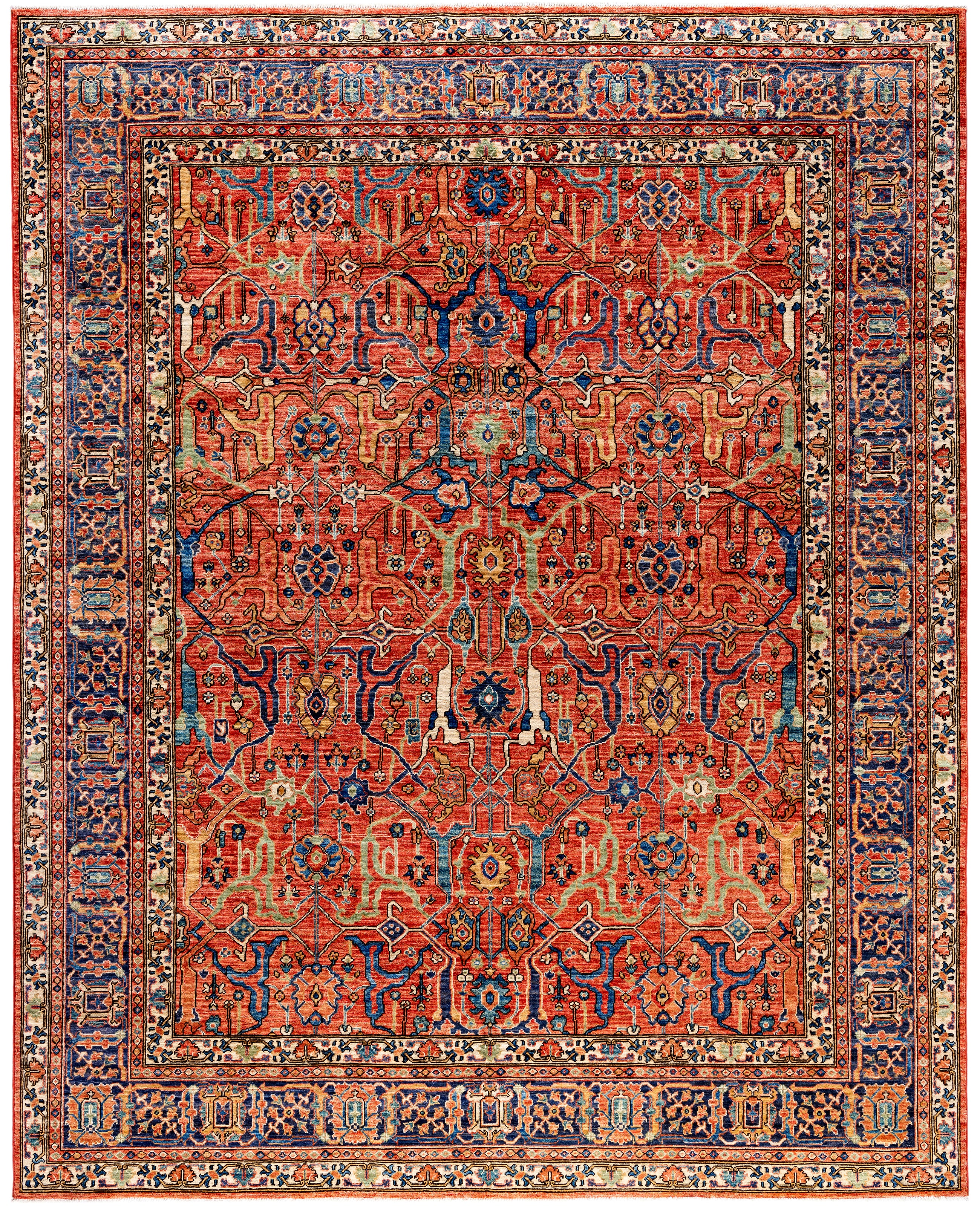 Serapi rugs are known for their bold, geometric designs and rich colors, often featuring a central medallion surrounded by intricate patterns. They typically use a warm, earthy color palette with deep reds, blues, ivory, and occasional greens. The designs emphasize large-scale motifs, including angular vines, leaves, and floral elements, giving the rugs a distinctive, almost architectural appearance. These rugs are hand-knotted and are prized for their durability and high-quality craftsmanship. Their unique aesthetic is attributed to a blend of traditional motifs with more refined, spacious compositions. They are highly sought after by collectors and interior designers for their elegance and timeless appeal.