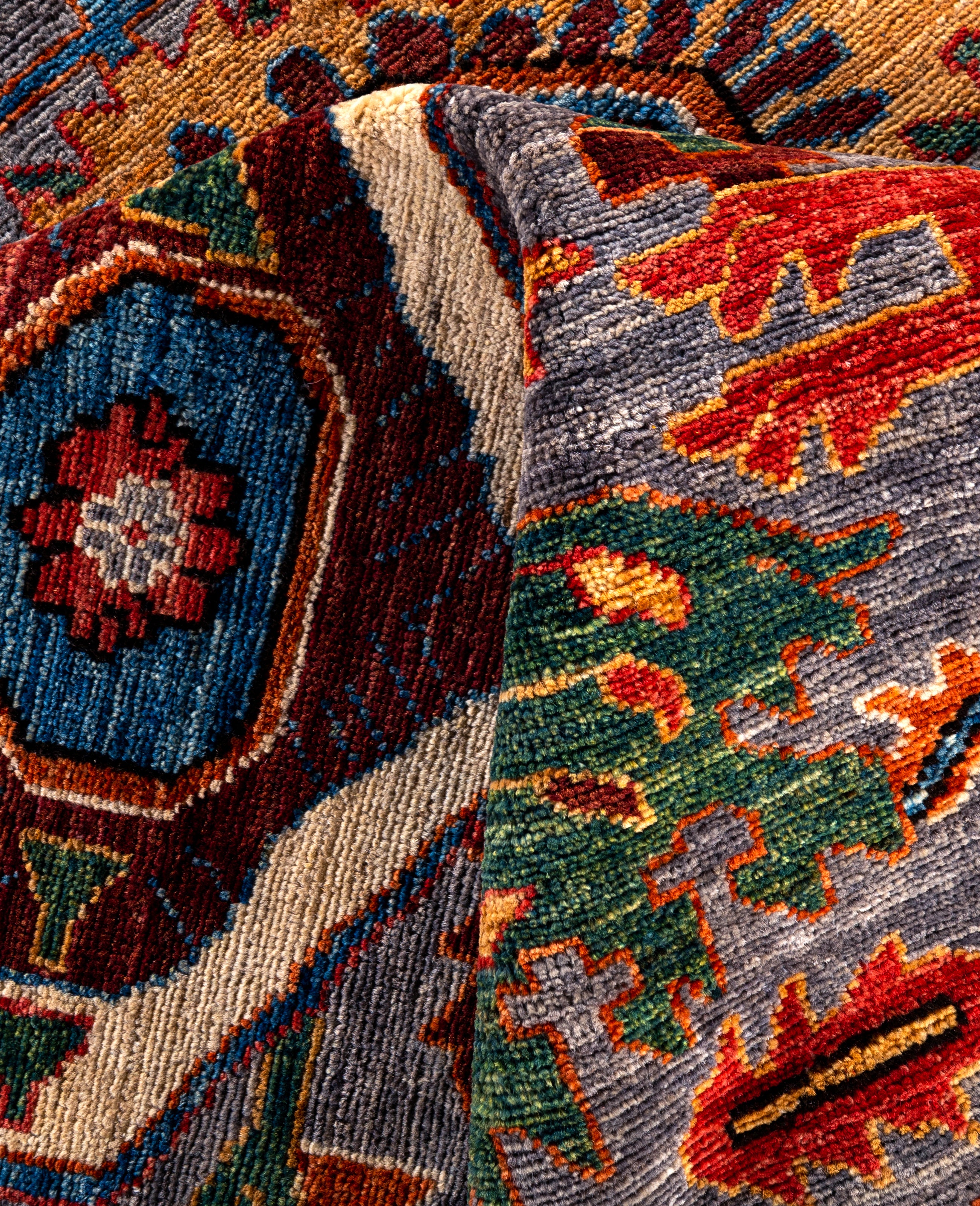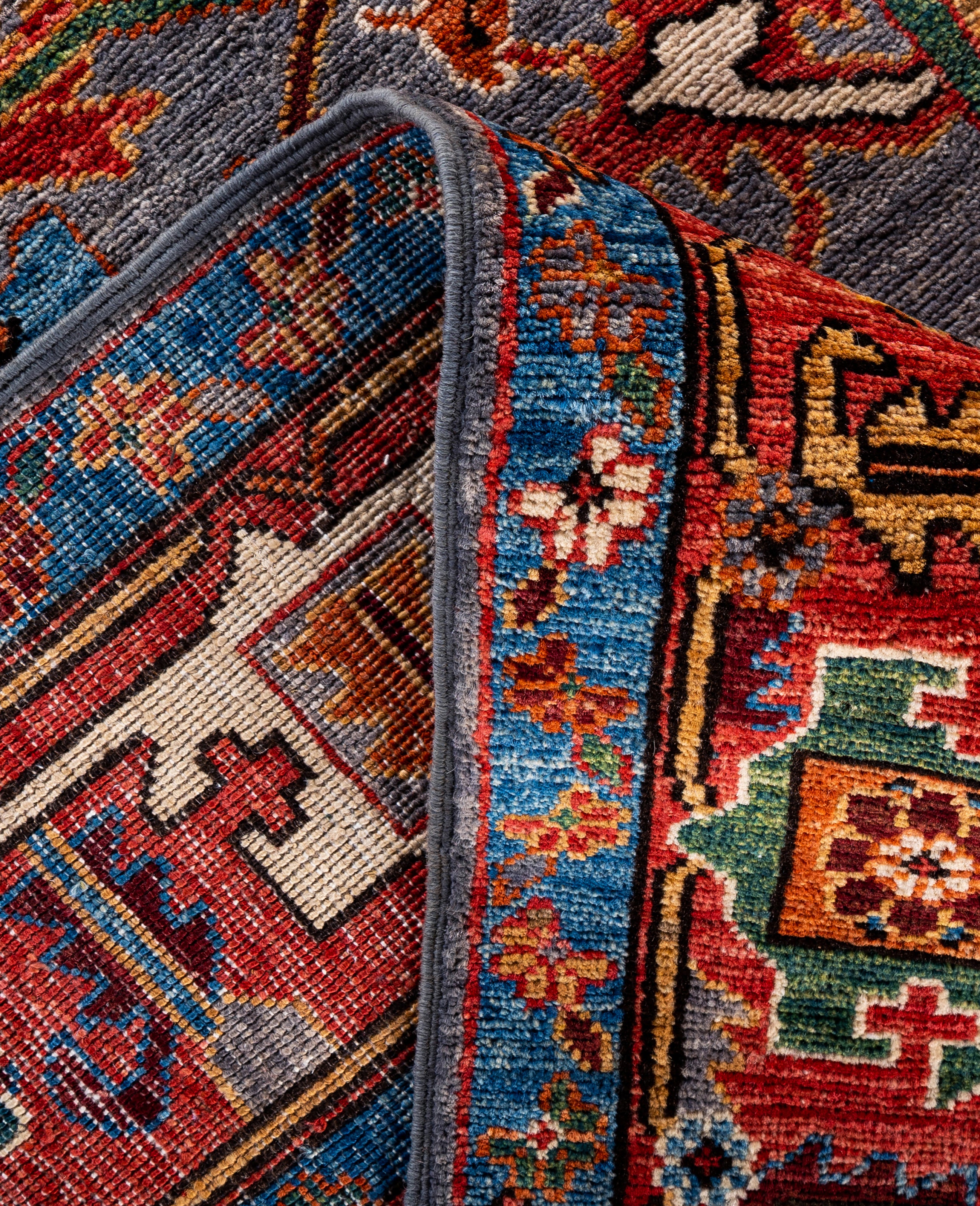 Serapi rugs are known for their bold, geometric designs and rich colors, often featuring a central medallion surrounded by intricate patterns. They typically use a warm, earthy color palette with deep reds, blues, ivory, and occasional greens. The designs emphasize large-scale motifs, including angular vines, leaves, and floral elements, giving the rugs a distinctive, almost architectural appearance. These rugs are hand-knotted and are prized for their durability and high-quality craftsmanship. Their unique aesthetic is attributed to a blend of traditional motifs with more refined, spacious compositions. They are highly sought after by collectors and interior designers for their elegance and timeless appeal.