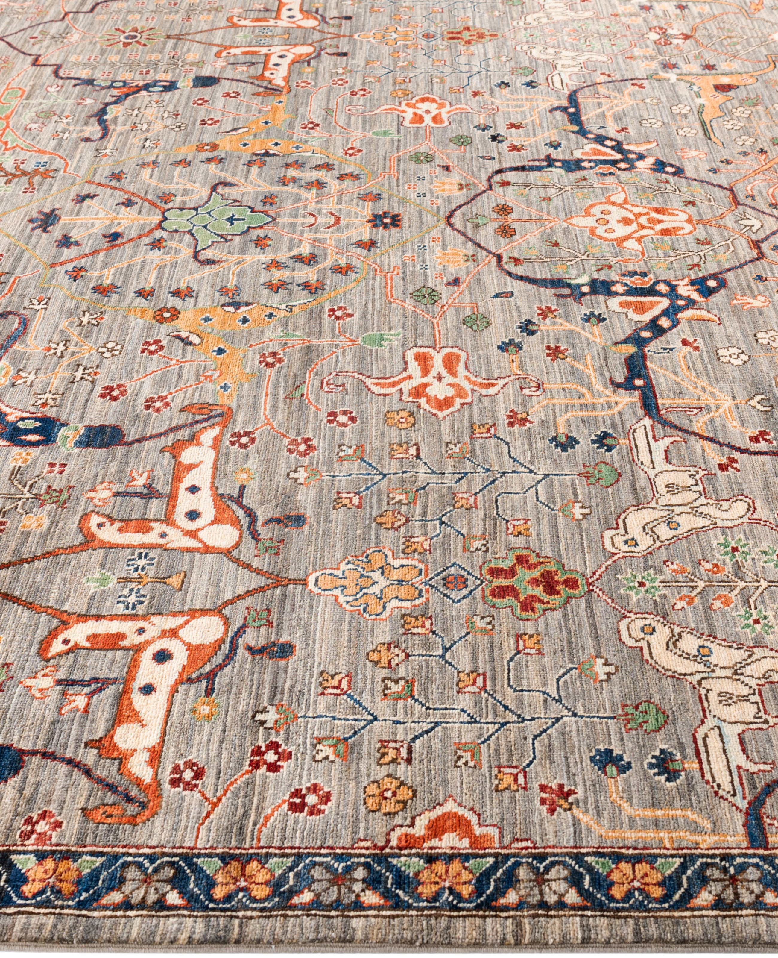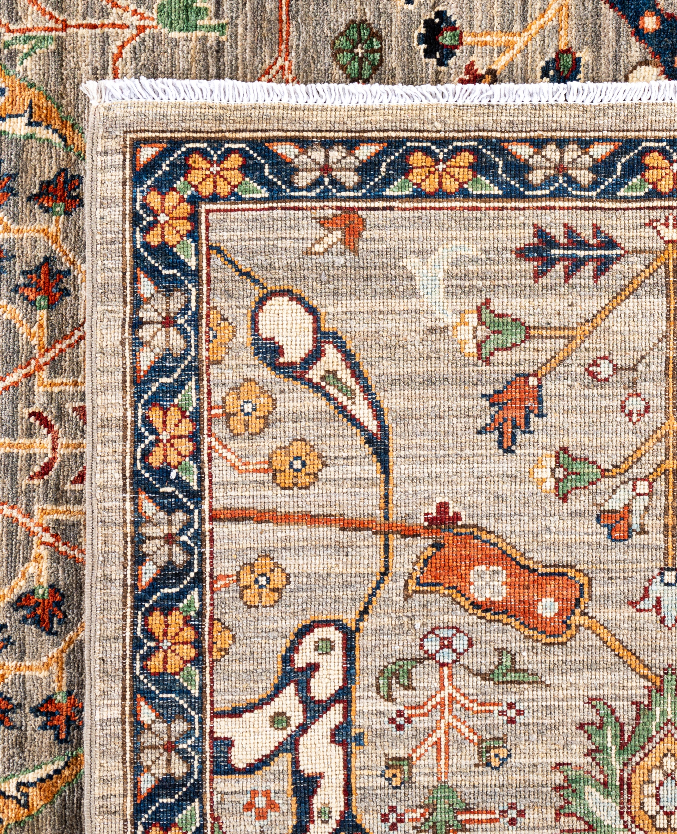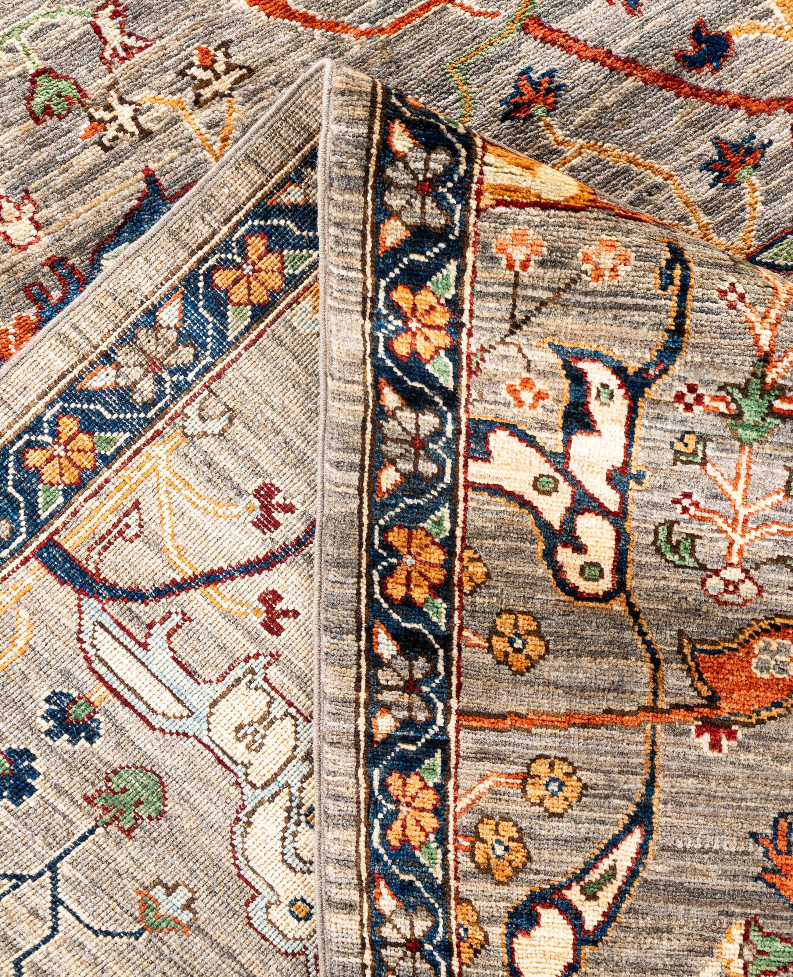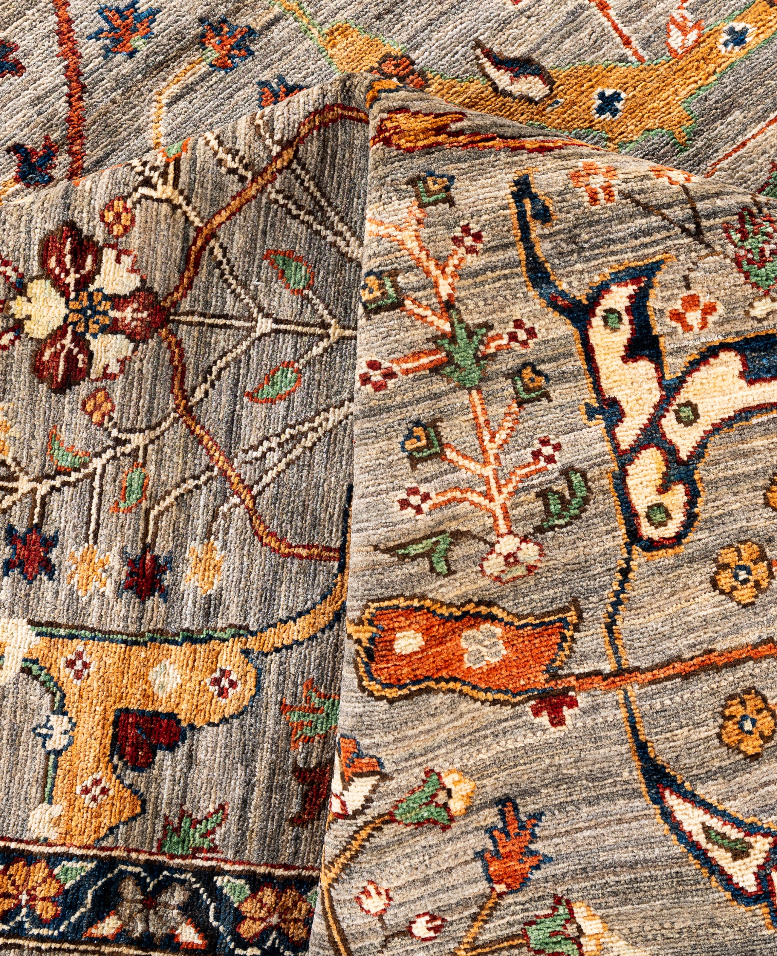 Serapi rugs are known for their bold, geometric designs and rich colors, often featuring a central medallion surrounded by intricate patterns. They typically use a warm, earthy color palette with deep reds, blues, ivory, and occasional greens. The designs emphasize large-scale motifs, including angular vines, leaves, and floral elements, giving the rugs a distinctive, almost architectural appearance. These rugs are hand-knotted and are prized for their durability and high-quality craftsmanship. Their unique aesthetic is attributed to a blend of traditional motifs with more refined, spacious compositions. They are highly sought after by collectors and interior designers for their elegance and timeless appeal.