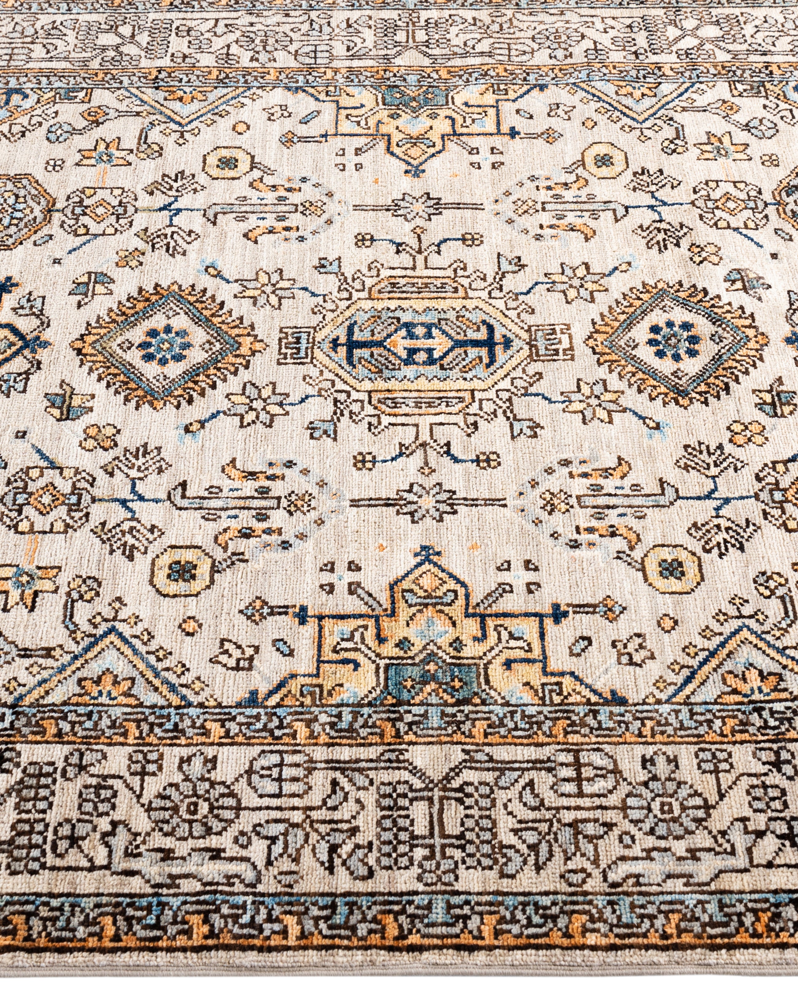 Serapi rugs are known for their bold, geometric designs and rich colors, often featuring a central medallion surrounded by intricate patterns. They typically use a warm, earthy color palette with deep reds, blues, ivory, and occasional greens. The designs emphasize large-scale motifs, including angular vines, leaves, and floral elements, giving the rugs a distinctive, almost architectural appearance. These rugs are hand-knotted and are prized for their durability and high-quality craftsmanship. Their unique aesthetic is attributed to a blend of traditional motifs with more refined, spacious compositions. They are highly sought after by collectors and interior designers for their elegance and timeless appeal.