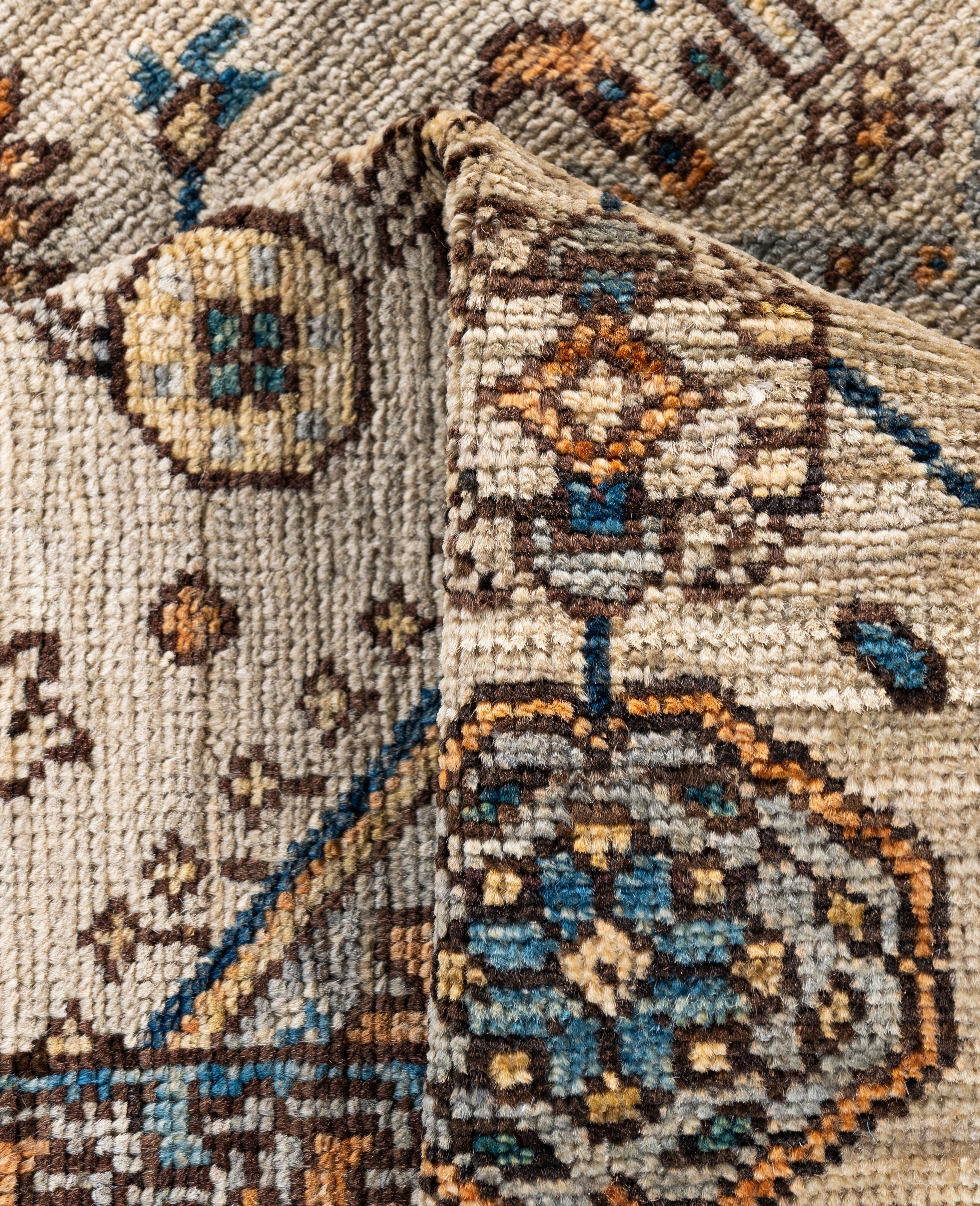 Serapi rugs are known for their bold, geometric designs and rich colors, often featuring a central medallion surrounded by intricate patterns. They typically use a warm, earthy color palette with deep reds, blues, ivory, and occasional greens. The designs emphasize large-scale motifs, including angular vines, leaves, and floral elements, giving the rugs a distinctive, almost architectural appearance. These rugs are hand-knotted and are prized for their durability and high-quality craftsmanship. Their unique aesthetic is attributed to a blend of traditional motifs with more refined, spacious compositions. They are highly sought after by collectors and interior designers for their elegance and timeless appeal.