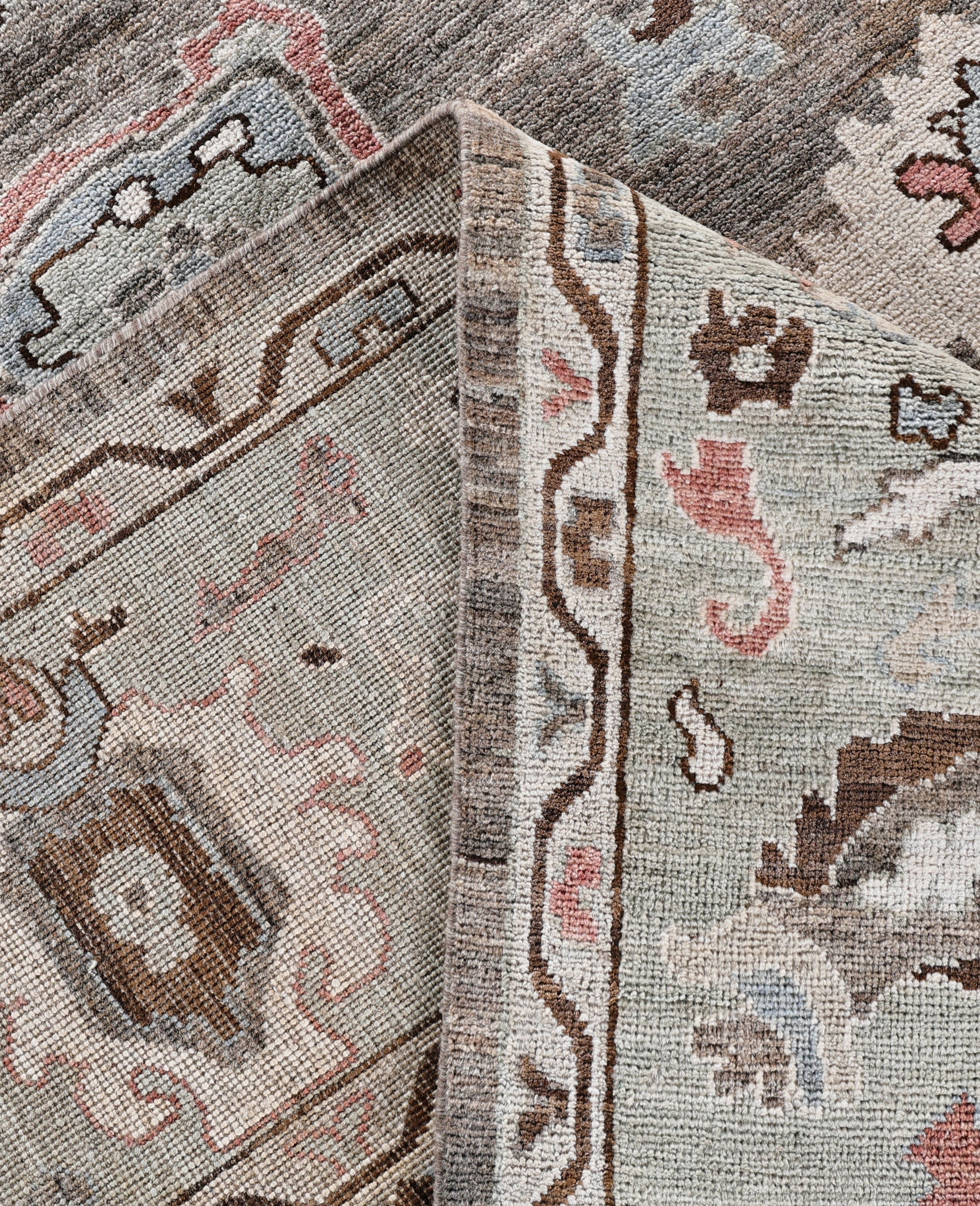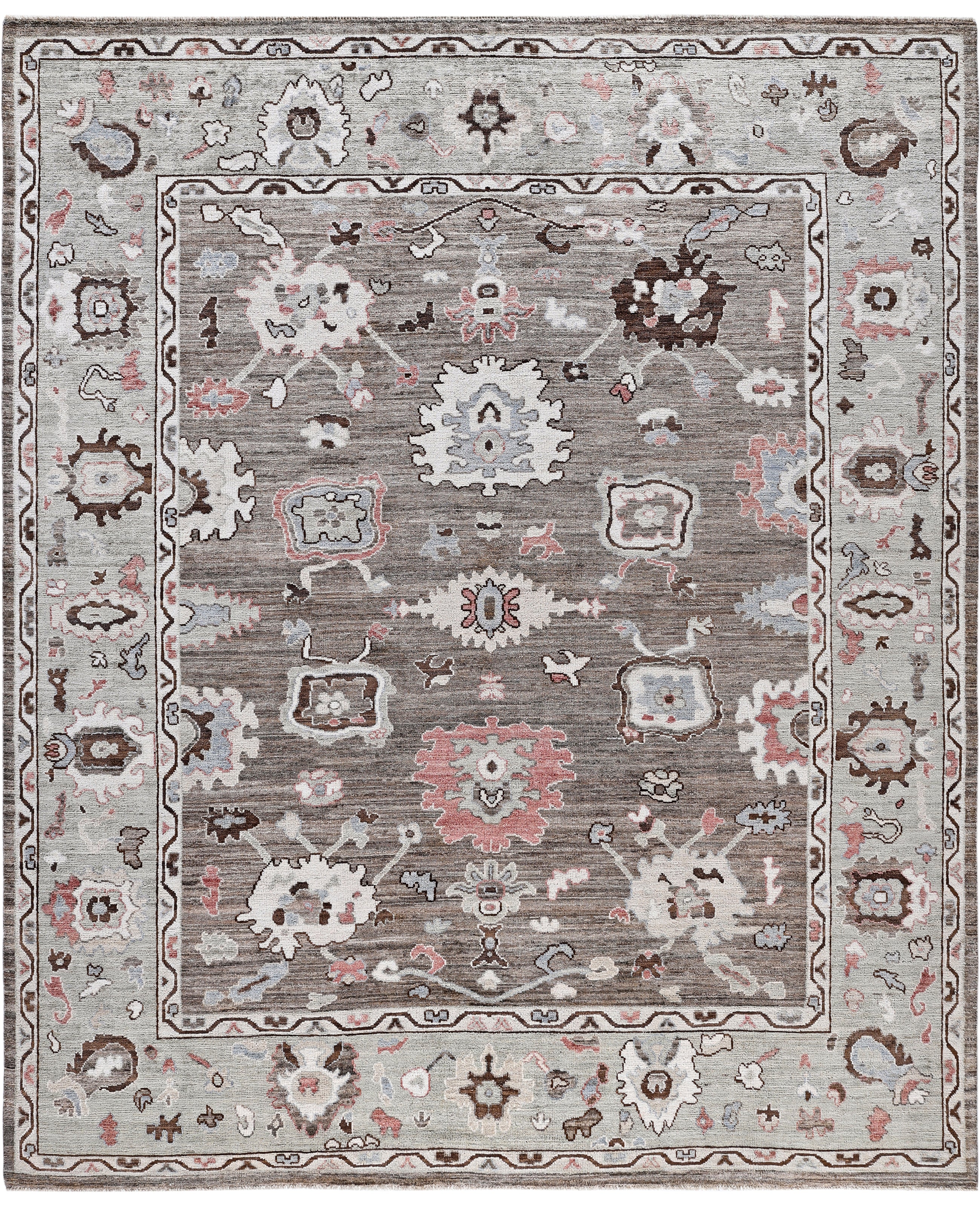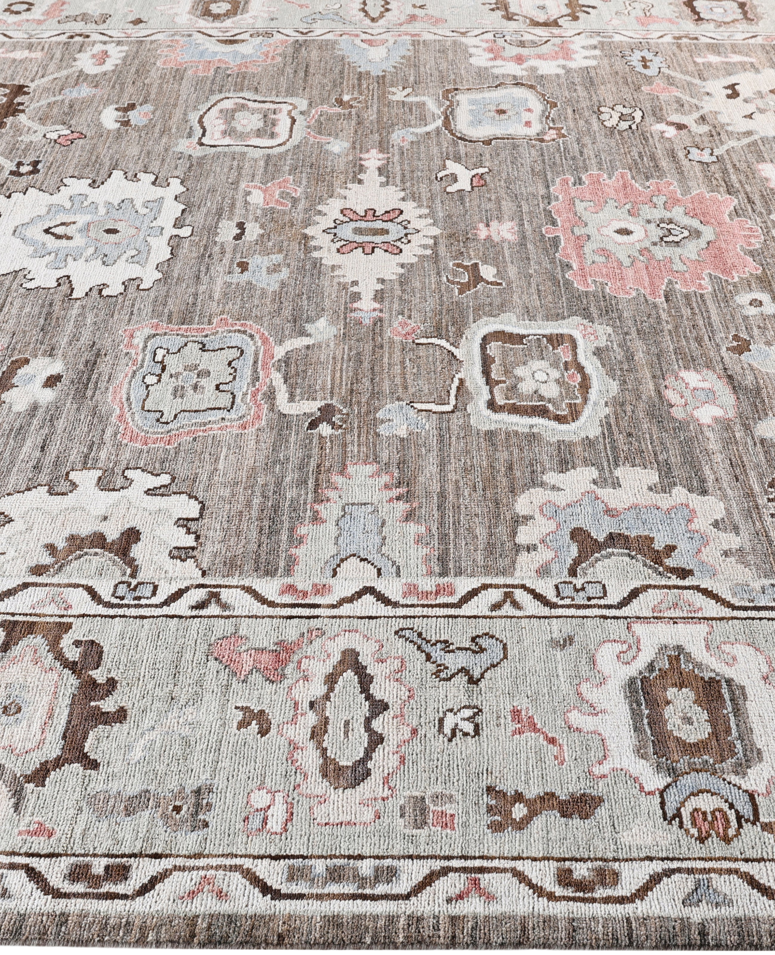Oushak rugs are known for their soft, muted color palettes and large-scale, flowing designs. They often feature soft tones like beige, cream, gold, and light blue, with motifs that include palmettes, vines, and geometric shapes. These rugs are distinguished by their loose, open patterns, giving them an airy and elegant feel. Originating from the town of Oushak, they emphasize simplicity and a more relaxed aesthetic compared to other ornate designs. Hand-knotted using high-quality wool, Oushak rugs are celebrated for their luxurious texture and durability. Their timeless, understated beauty makes them popular in both traditional and contemporary interiors.