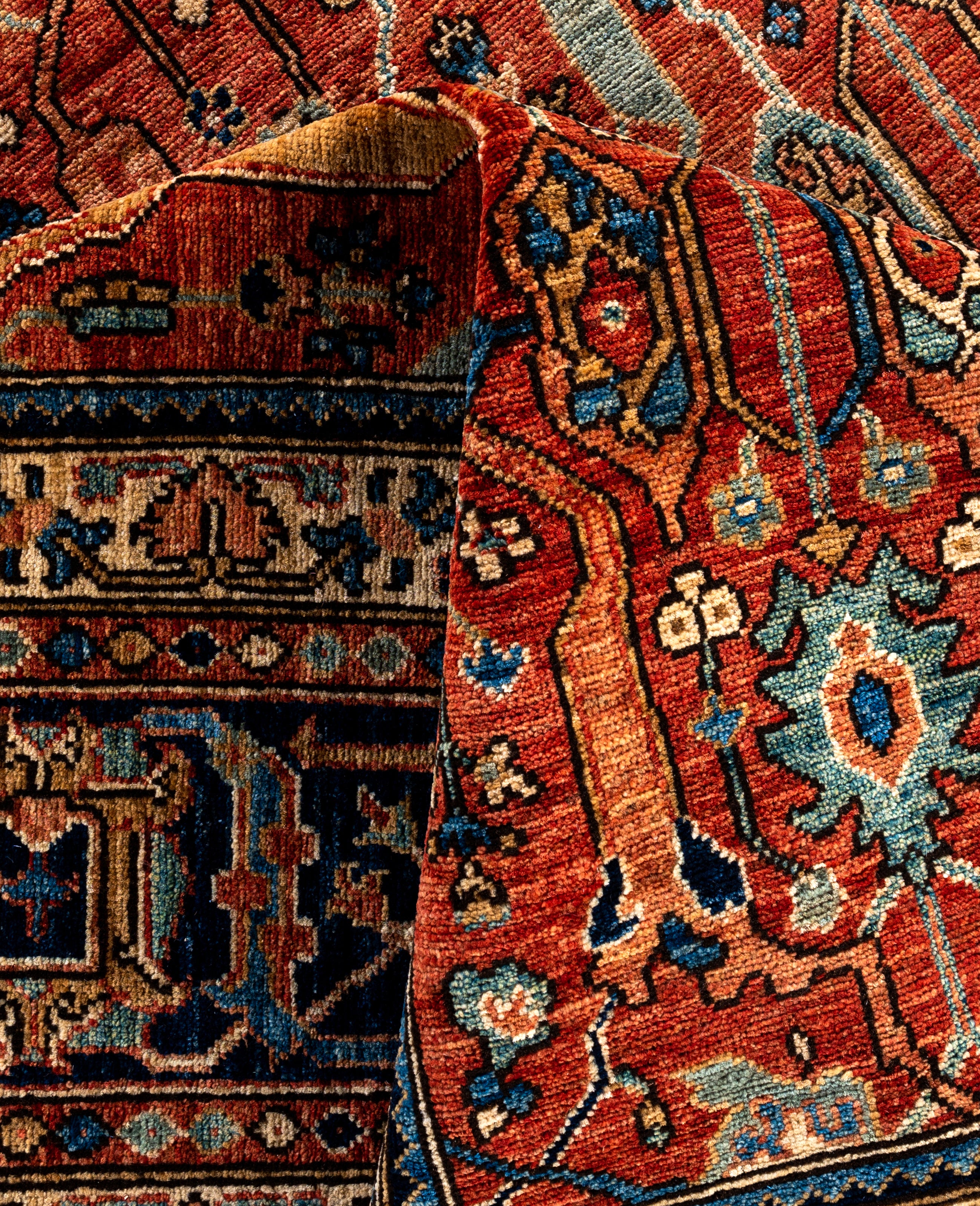 Serapi rugs are known for their bold, geometric designs and rich colors, often featuring a central medallion surrounded by intricate patterns. They typically use a warm, earthy color palette with deep reds, blues, ivory, and occasional greens. The designs emphasize large-scale motifs, including angular vines, leaves, and floral elements, giving the rugs a distinctive, almost architectural appearance. These rugs are hand-knotted and are prized for their durability and high-quality craftsmanship. Their unique aesthetic is attributed to a blend of traditional motifs with more refined, spacious compositions. They are highly sought after by collectors and interior designers for their elegance and timeless appeal.