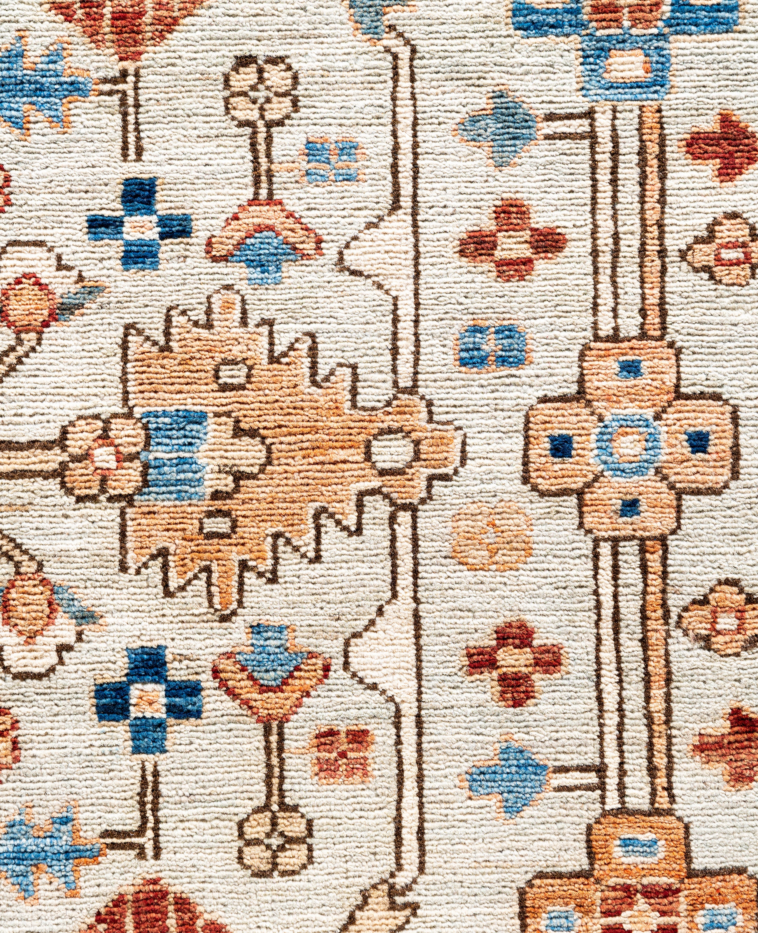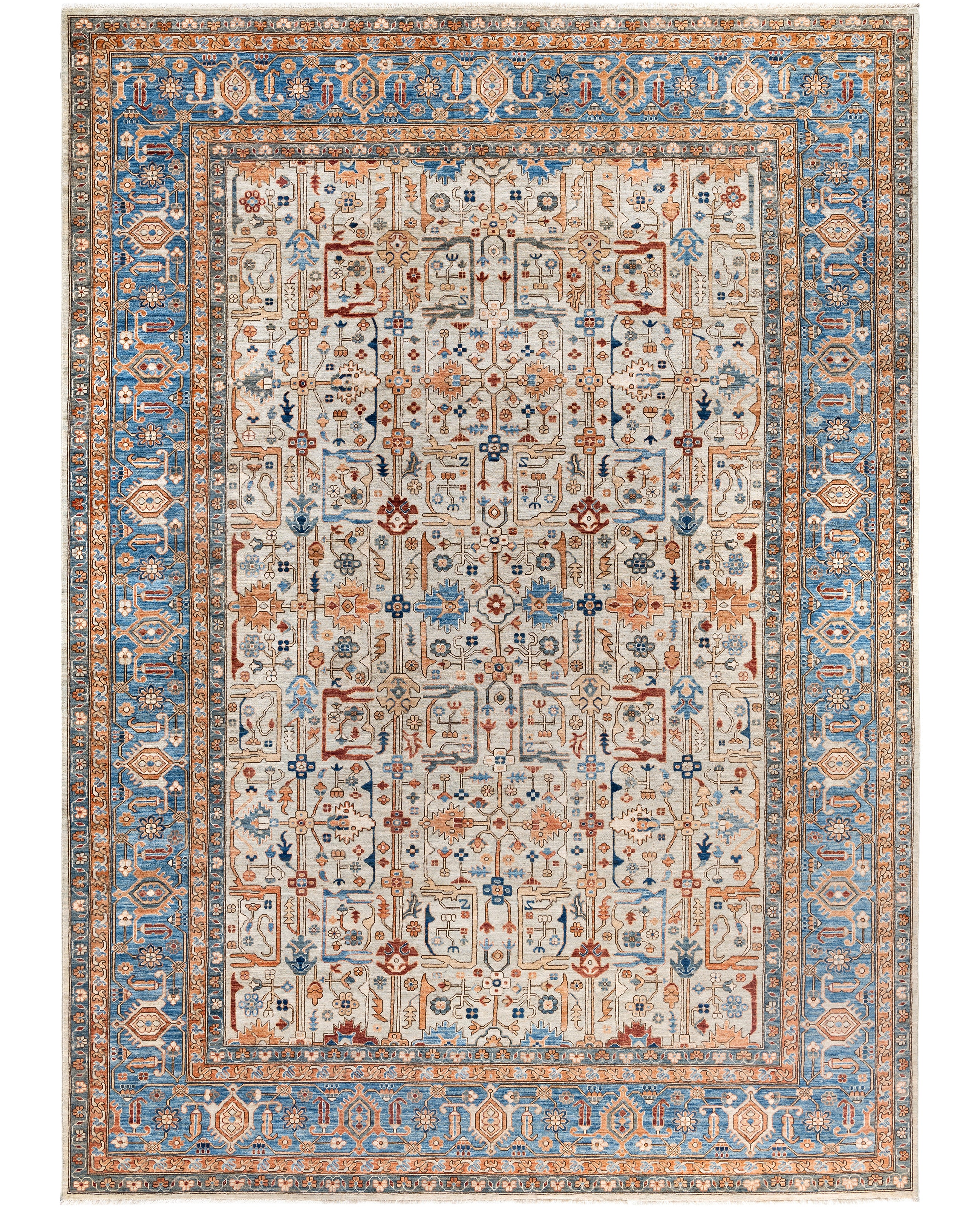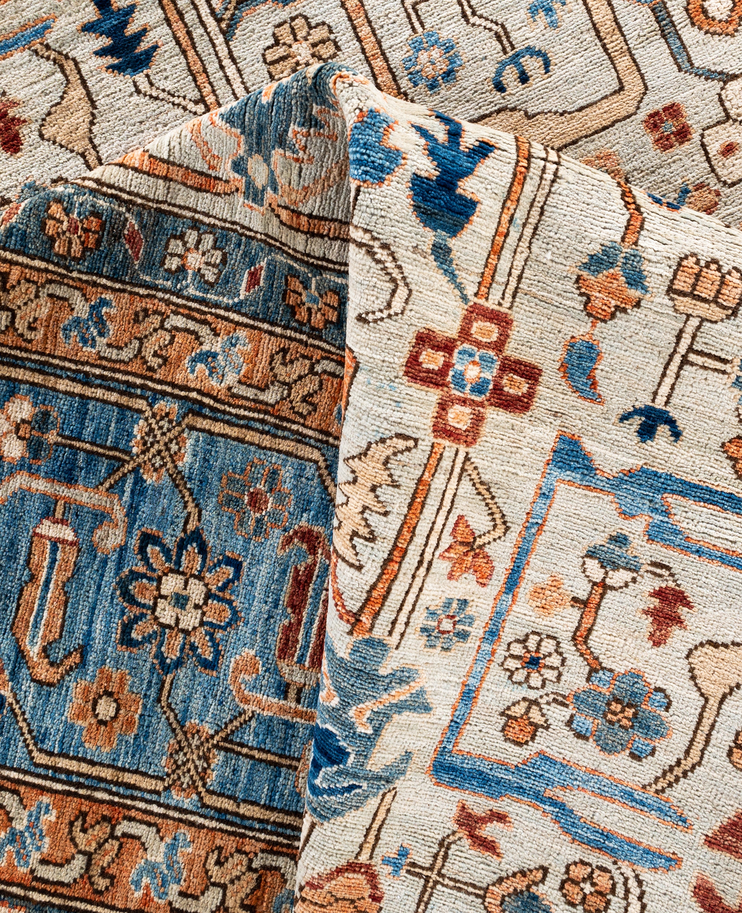 Serapi rugs are known for their bold, geometric designs and rich colors, often featuring a central medallion surrounded by intricate patterns. They typically use a warm, earthy color palette with deep reds, blues, ivory, and occasional greens. The designs emphasize large-scale motifs, including angular vines, leaves, and floral elements, giving the rugs a distinctive, almost architectural appearance. These rugs are hand-knotted and are prized for their durability and high-quality craftsmanship. Their unique aesthetic is attributed to a blend of traditional motifs with more refined, spacious compositions. They are highly sought after by collectors and interior designers for their elegance and timeless appeal.