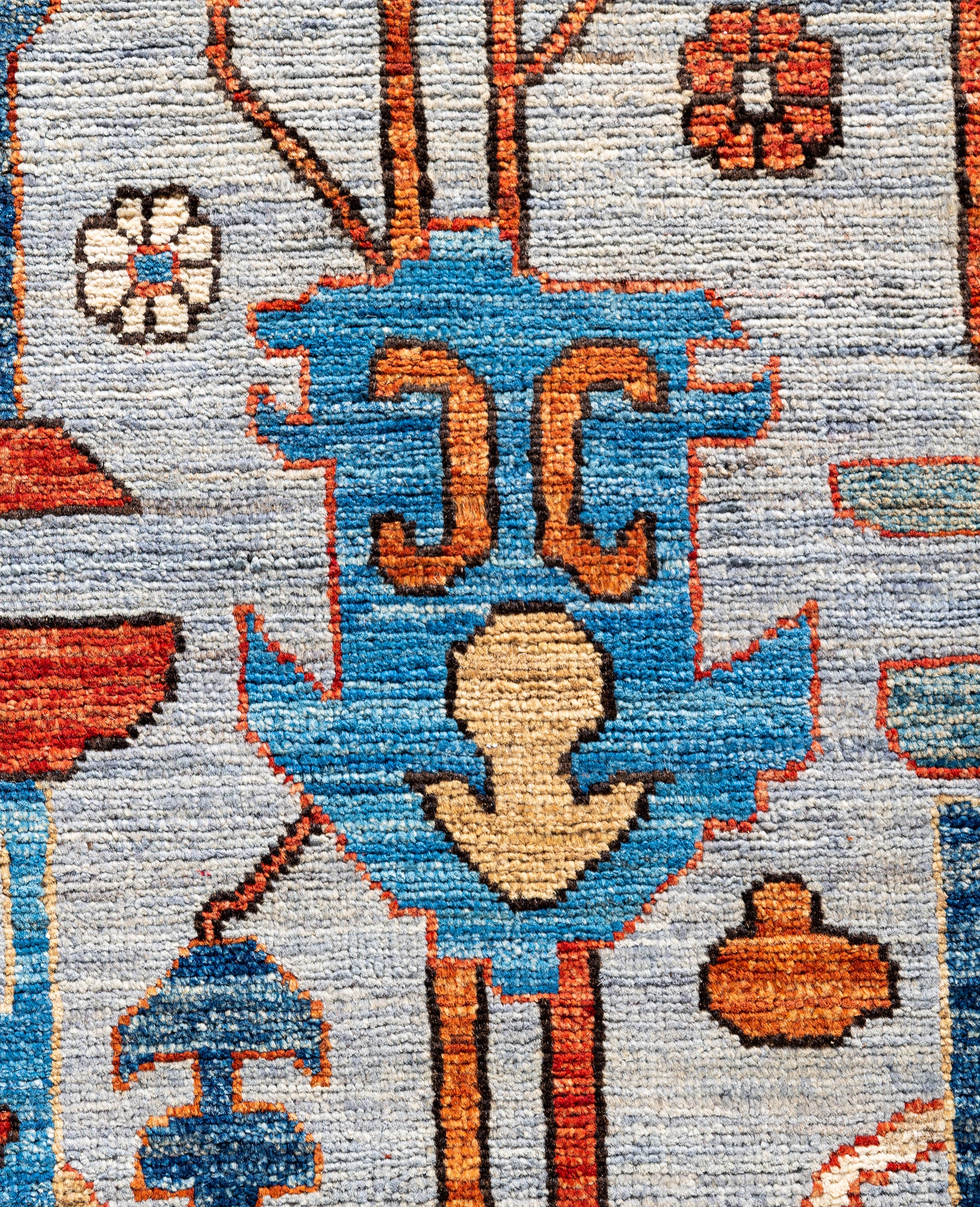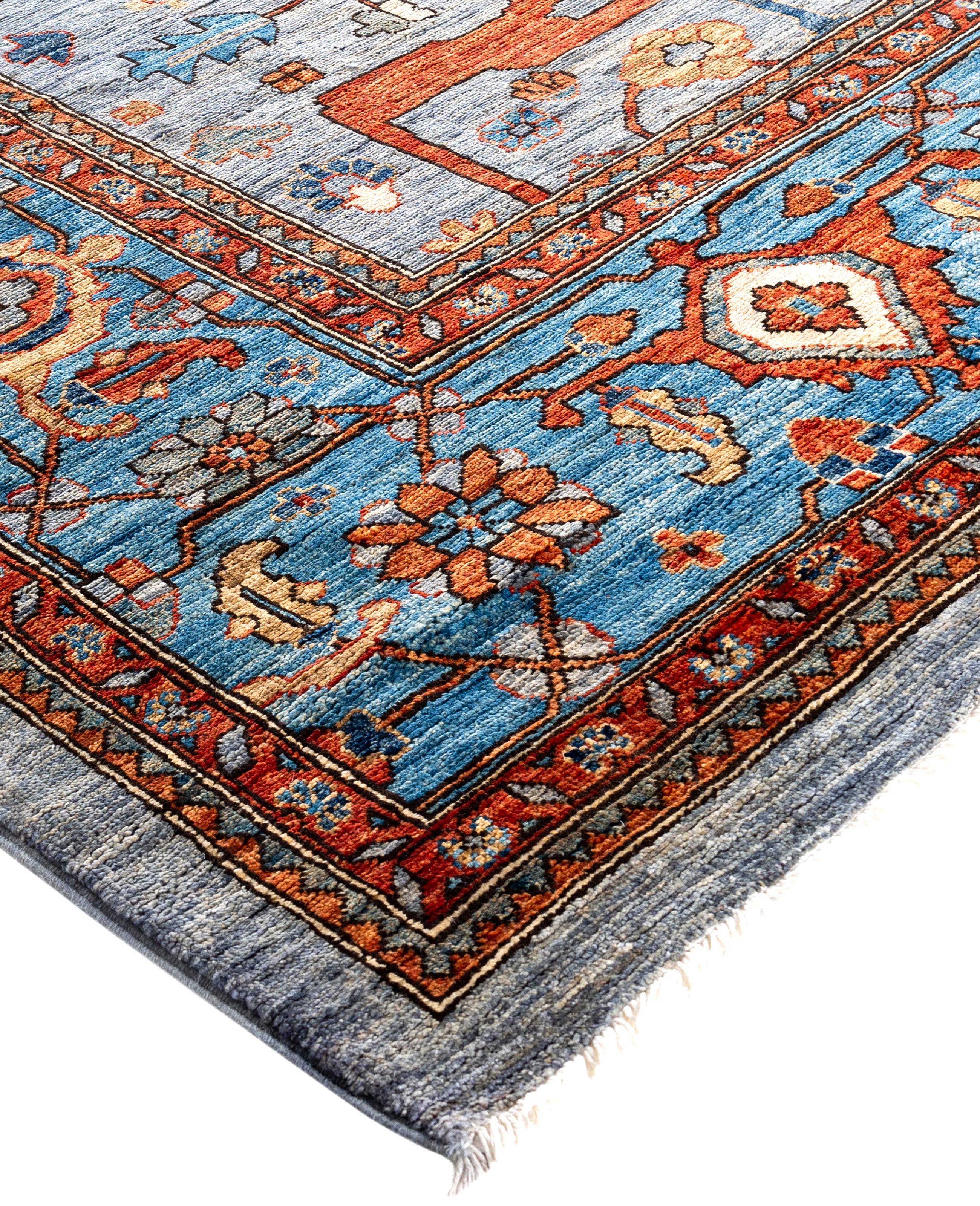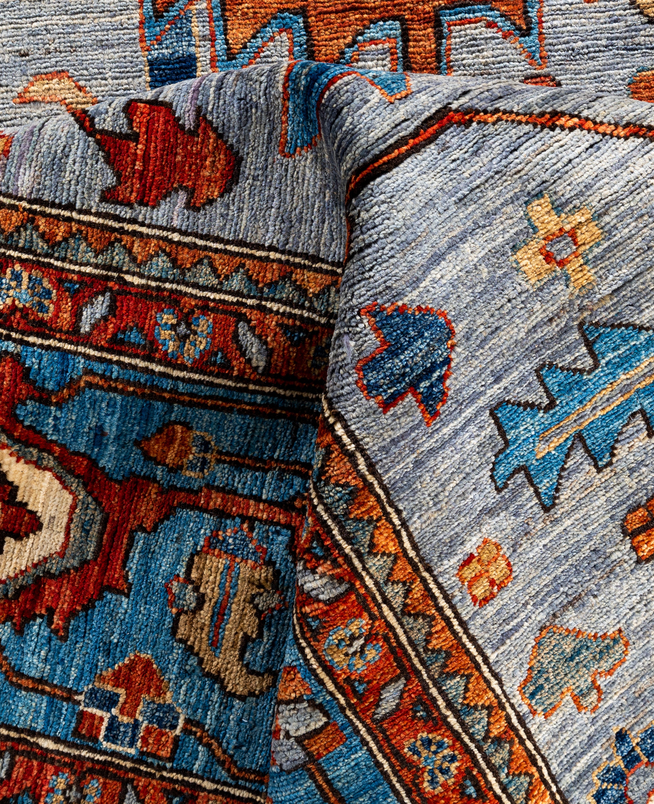 Serapi rugs are known for their bold, geometric designs and rich colors, often featuring a central medallion surrounded by intricate patterns. They typically use a warm, earthy color palette with deep reds, blues, ivory, and occasional greens. The designs emphasize large-scale motifs, including angular vines, leaves, and floral elements, giving the rugs a distinctive, almost architectural appearance. These rugs are hand-knotted and are prized for their durability and high-quality craftsmanship. Their unique aesthetic is attributed to a blend of traditional motifs with more refined, spacious compositions. They are highly sought after by collectors and interior designers for their elegance and timeless appeal.