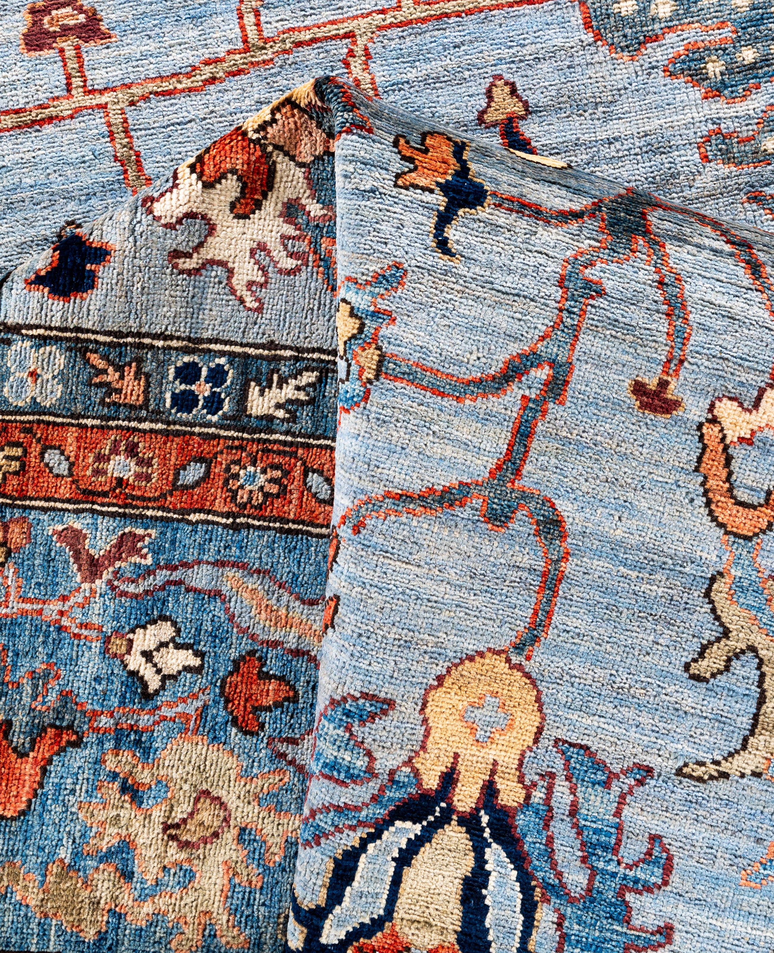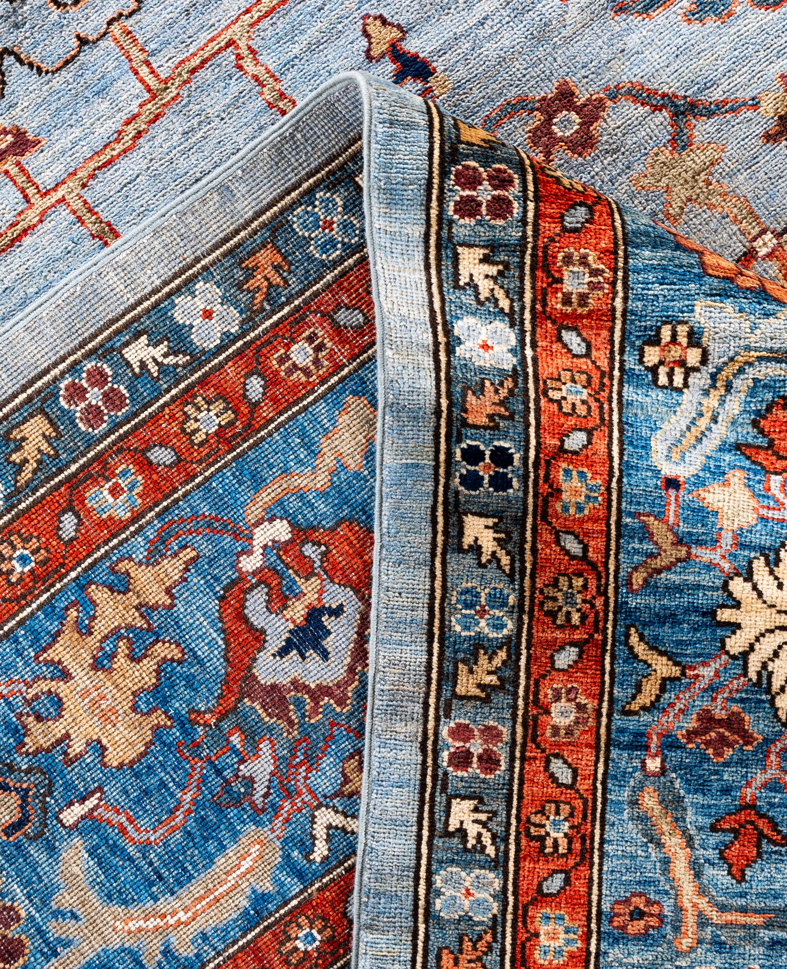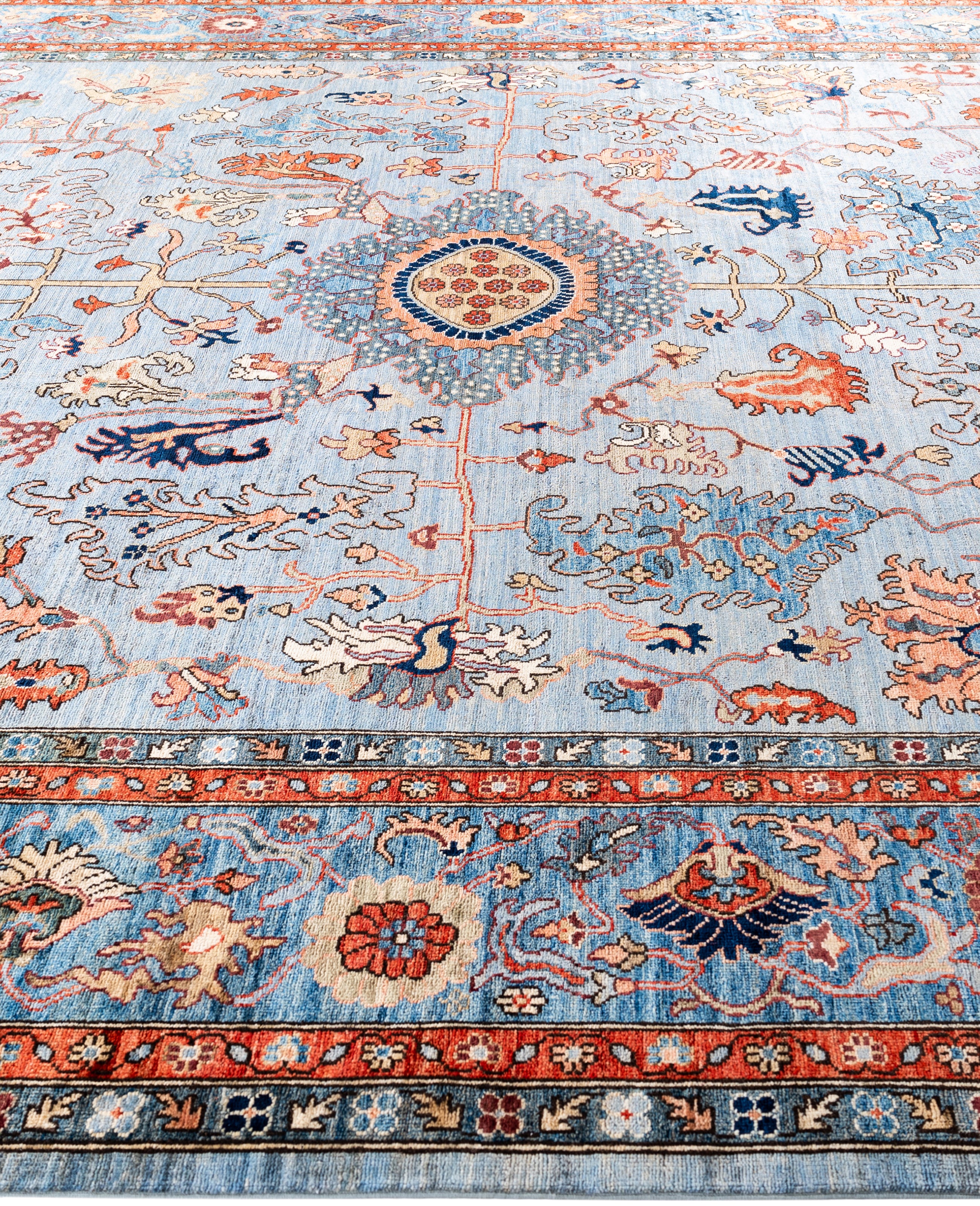 Serapi rugs are known for their bold, geometric designs and rich colors, often featuring a central medallion surrounded by intricate patterns. They typically use a warm, earthy color palette with deep reds, blues, ivory, and occasional greens. The designs emphasize large-scale motifs, including angular vines, leaves, and floral elements, giving the rugs a distinctive, almost architectural appearance. These rugs are hand-knotted and are prized for their durability and high-quality craftsmanship. Their unique aesthetic is attributed to a blend of traditional motifs with more refined, spacious compositions. They are highly sought after by collectors and interior designers for their elegance and timeless appeal.