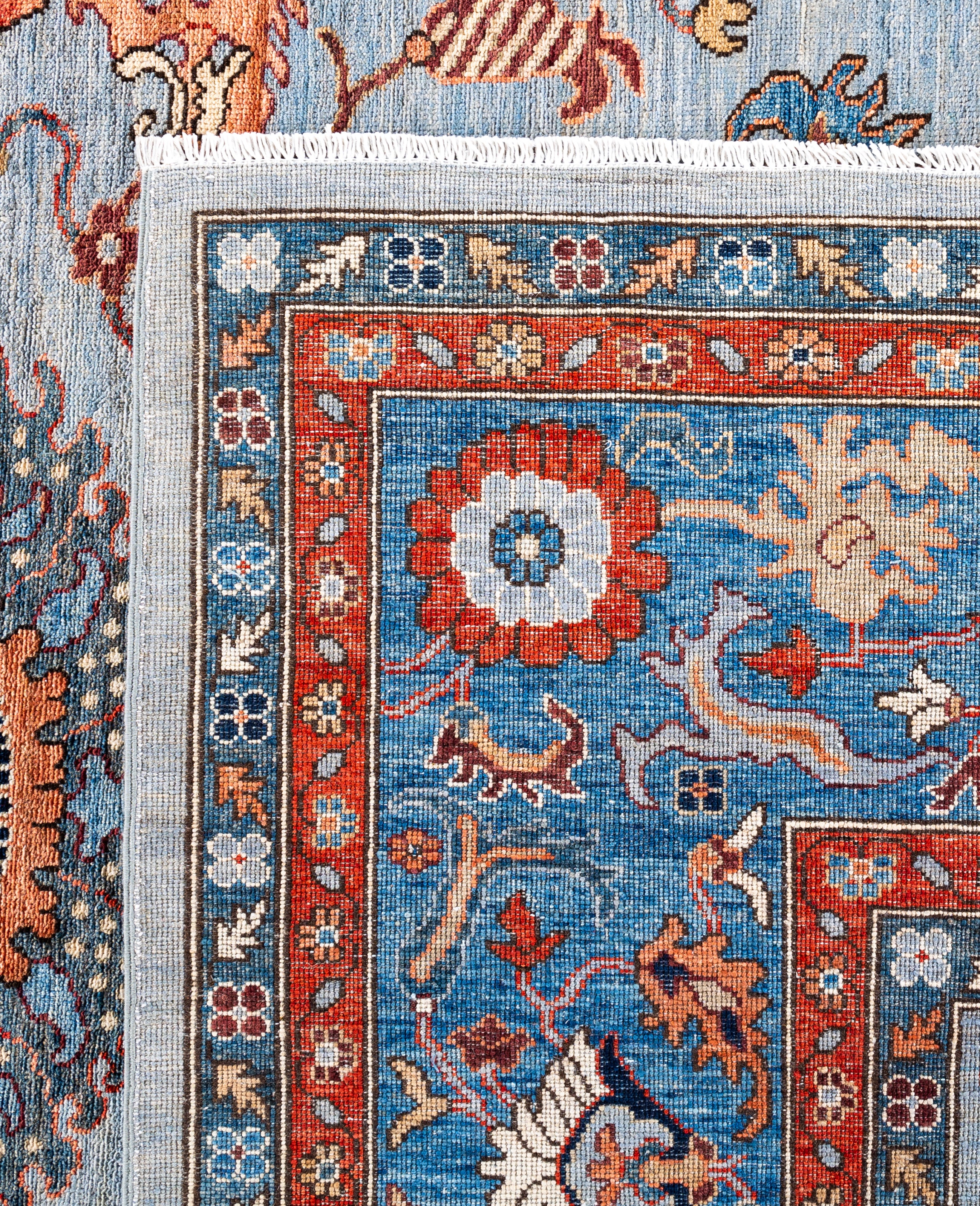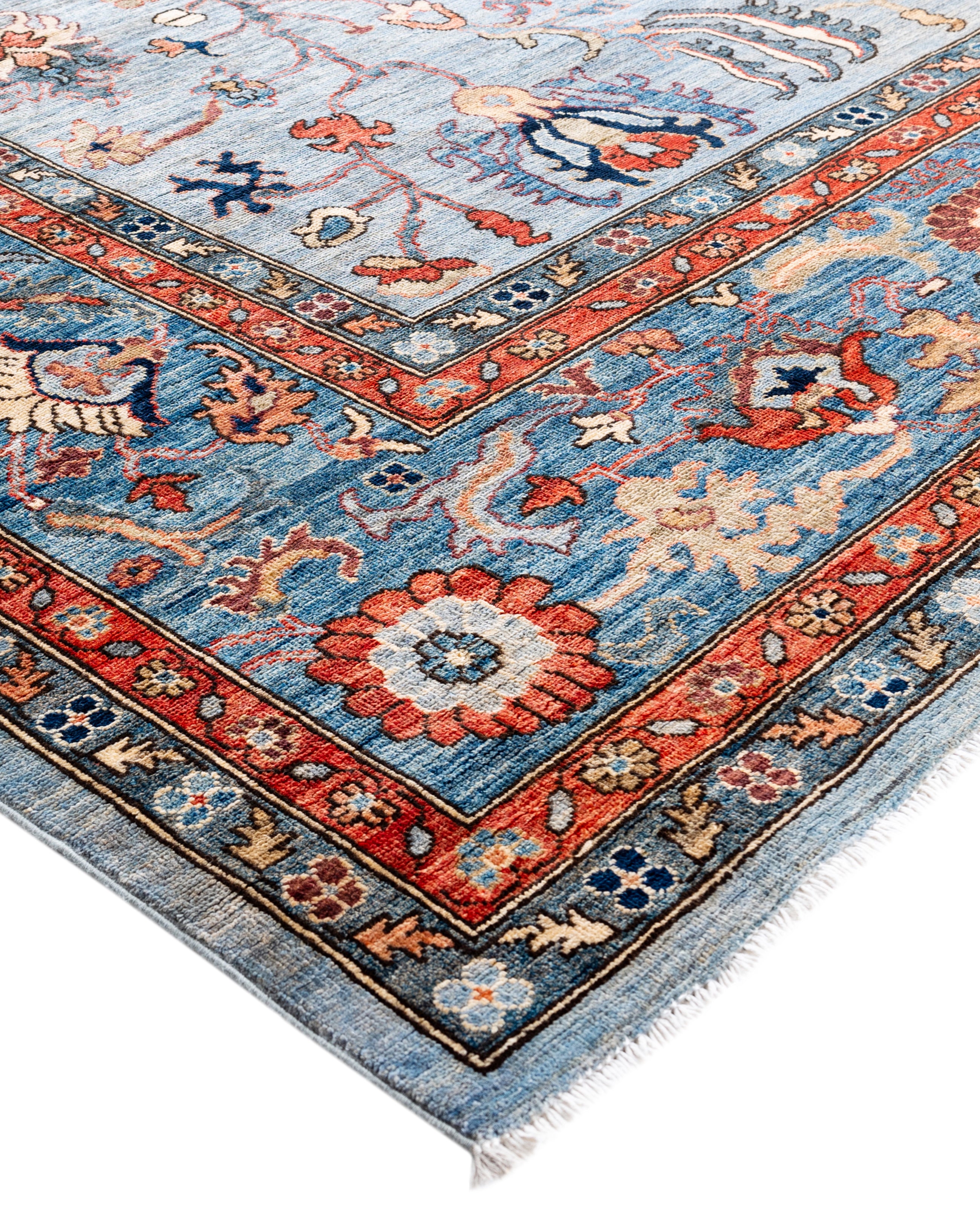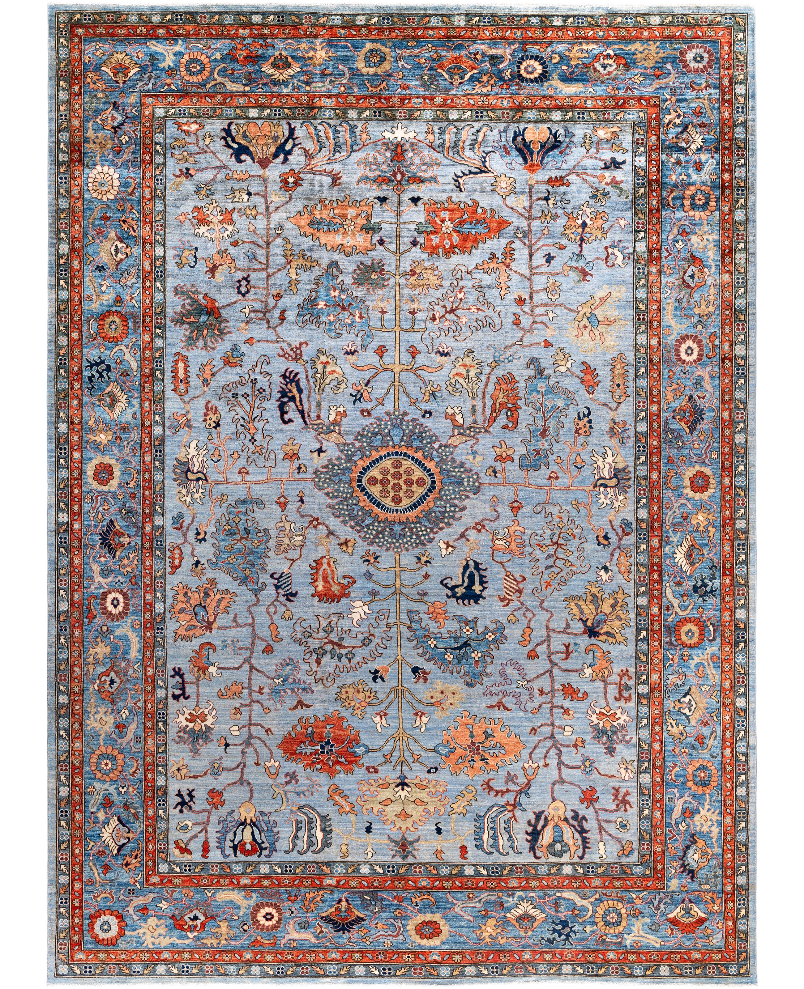 Serapi rugs are known for their bold, geometric designs and rich colors, often featuring a central medallion surrounded by intricate patterns. They typically use a warm, earthy color palette with deep reds, blues, ivory, and occasional greens. The designs emphasize large-scale motifs, including angular vines, leaves, and floral elements, giving the rugs a distinctive, almost architectural appearance. These rugs are hand-knotted and are prized for their durability and high-quality craftsmanship. Their unique aesthetic is attributed to a blend of traditional motifs with more refined, spacious compositions. They are highly sought after by collectors and interior designers for their elegance and timeless appeal.