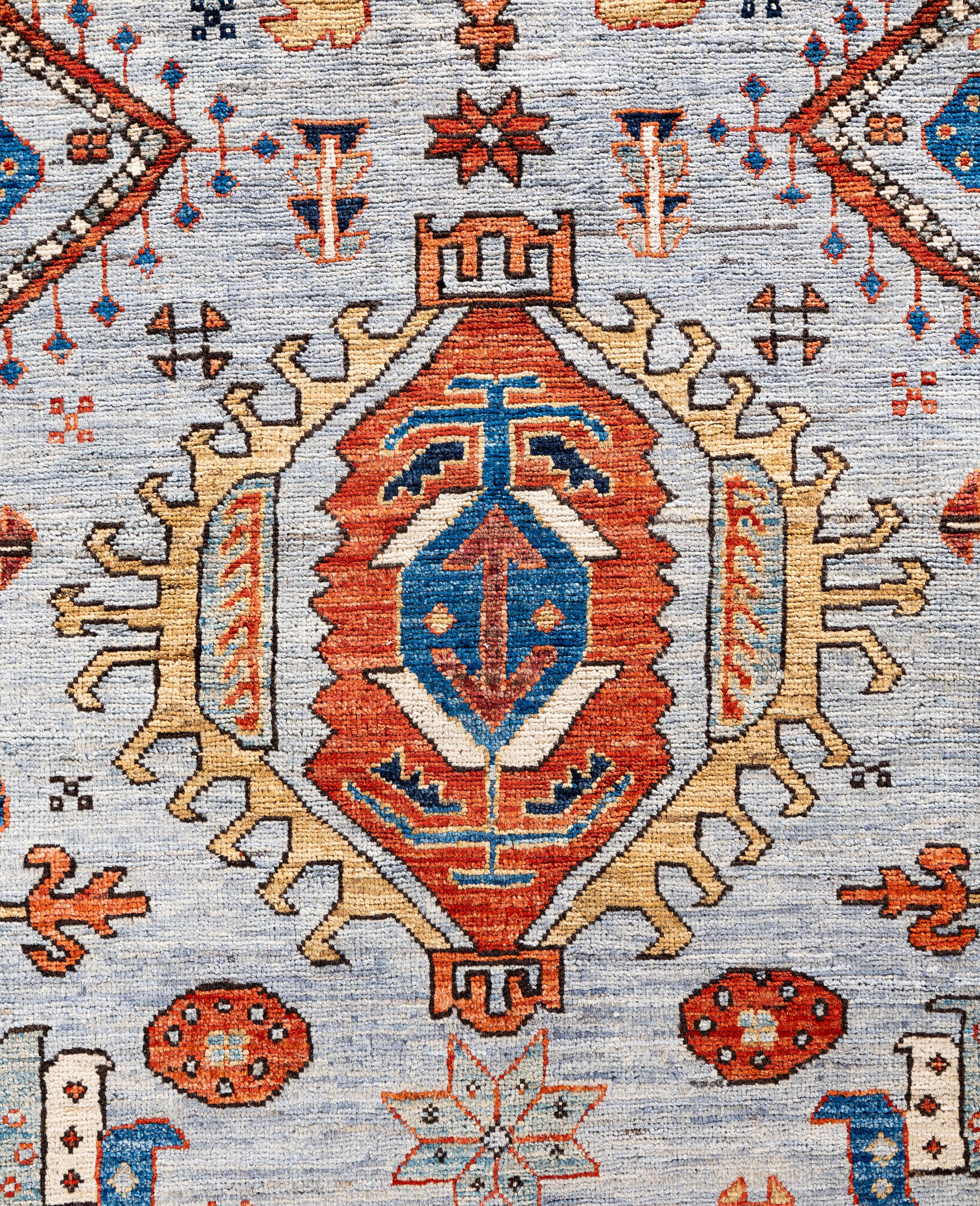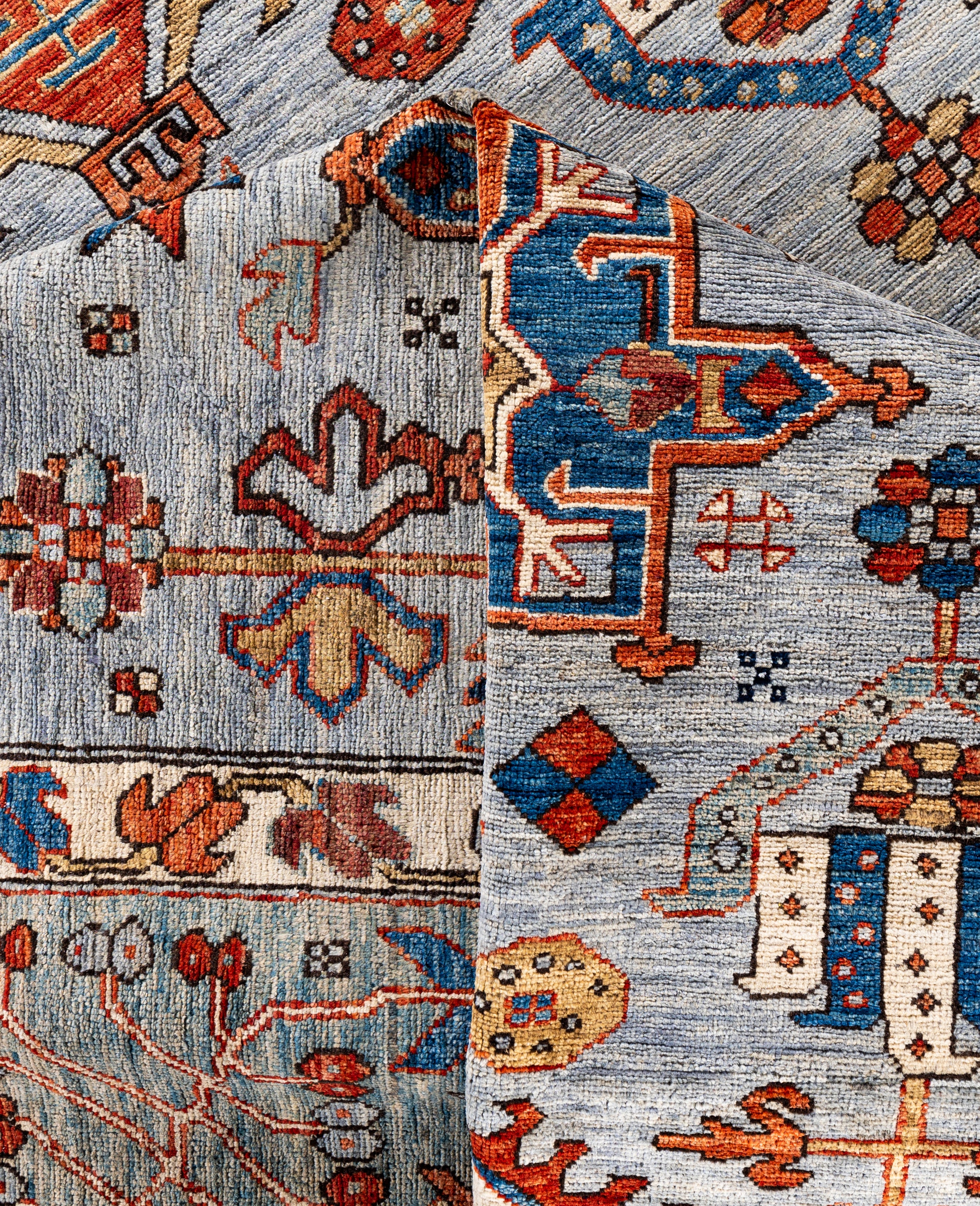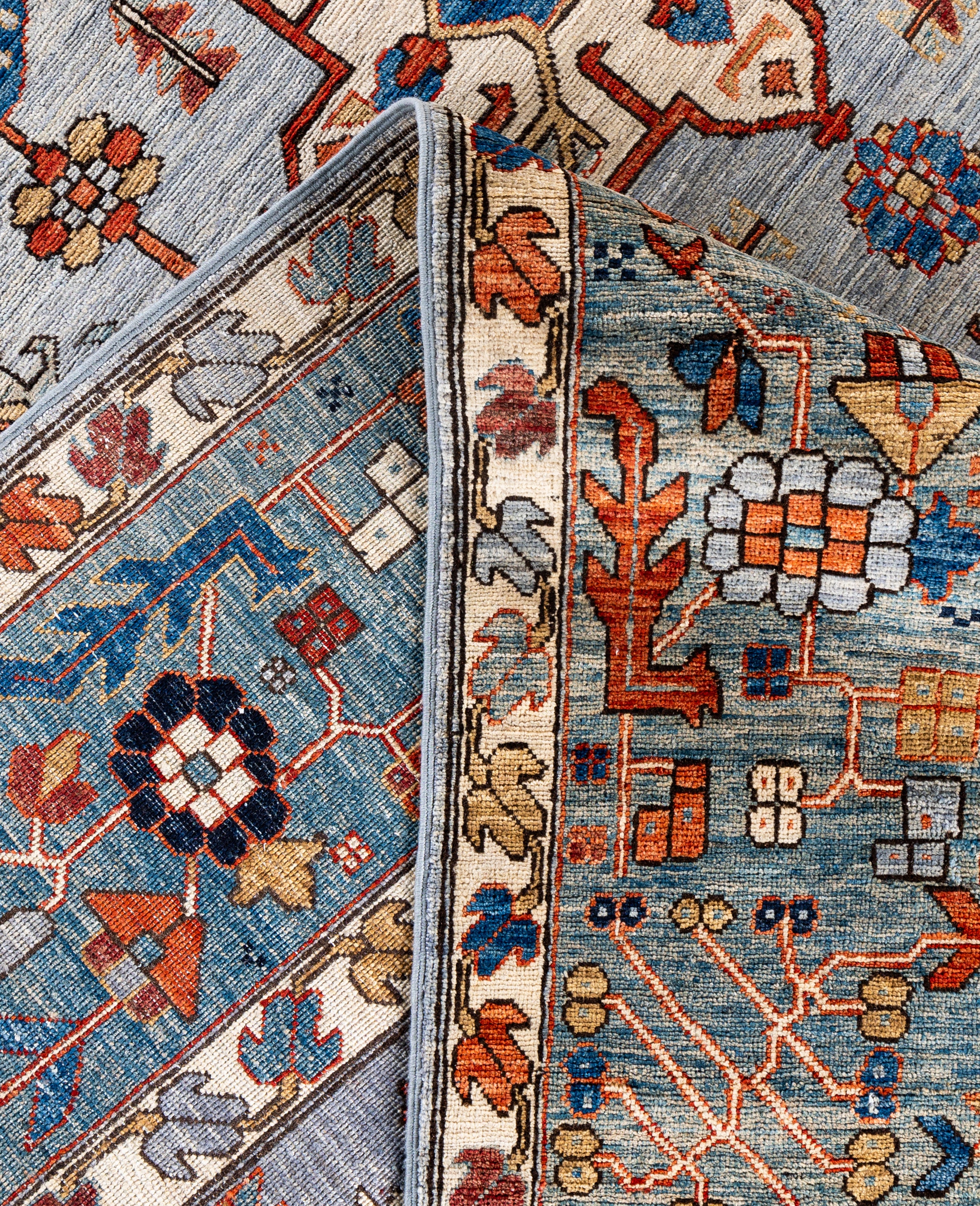 Serapi rugs are known for their bold, geometric designs and rich colors, often featuring a central medallion surrounded by intricate patterns. They typically use a warm, earthy color palette with deep reds, blues, ivory, and occasional greens. The designs emphasize large-scale motifs, including angular vines, leaves, and floral elements, giving the rugs a distinctive, almost architectural appearance. These rugs are hand-knotted and are prized for their durability and high-quality craftsmanship. Their unique aesthetic is attributed to a blend of traditional motifs with more refined, spacious compositions. They are highly sought after by collectors and interior designers for their elegance and timeless appeal.