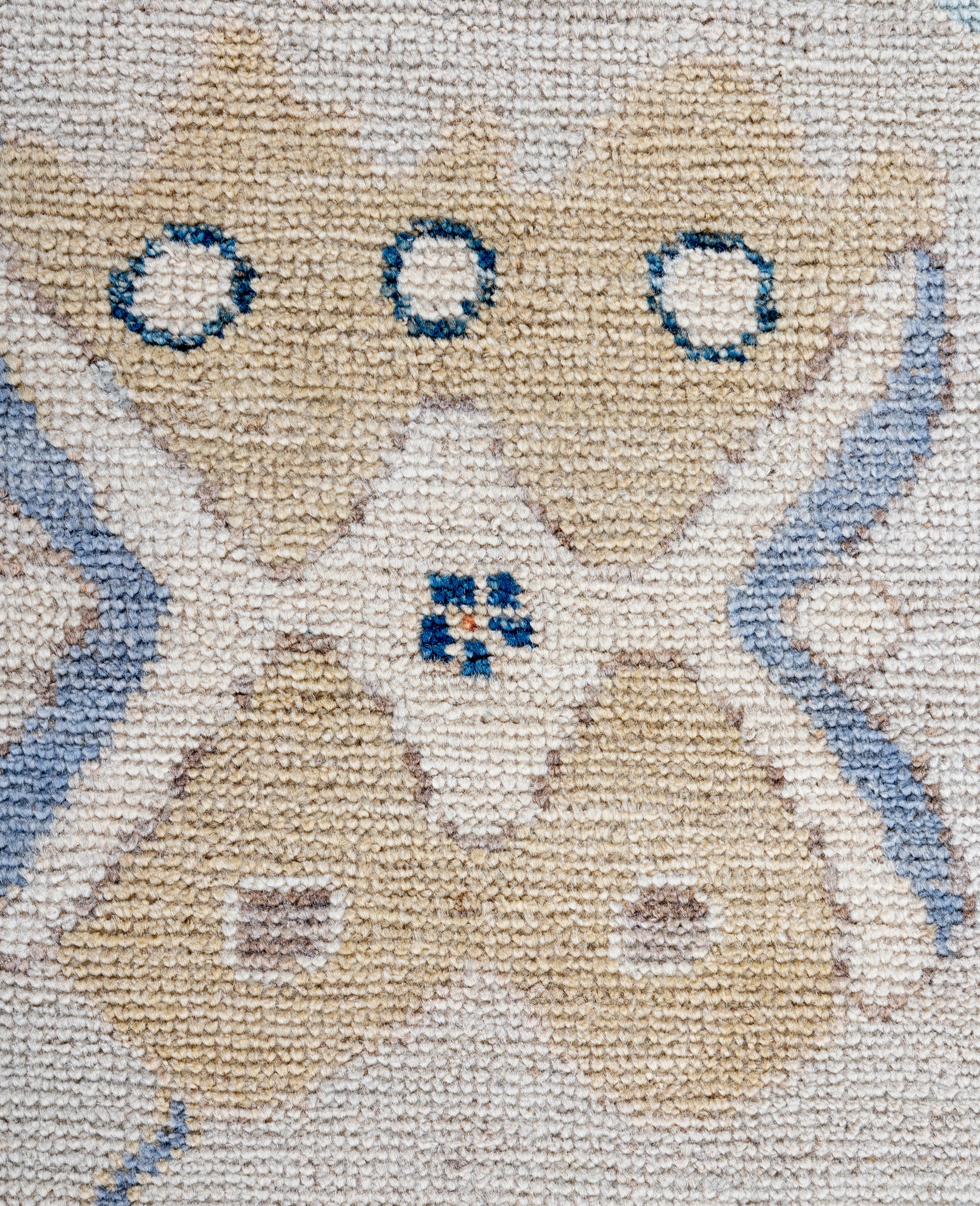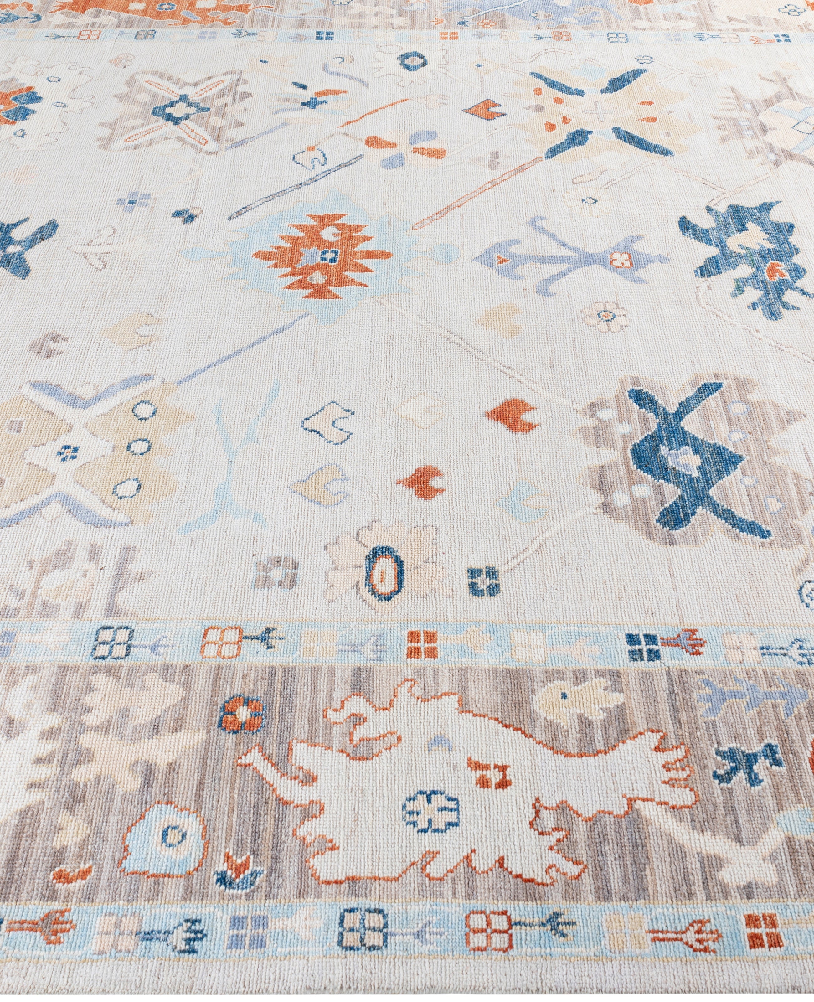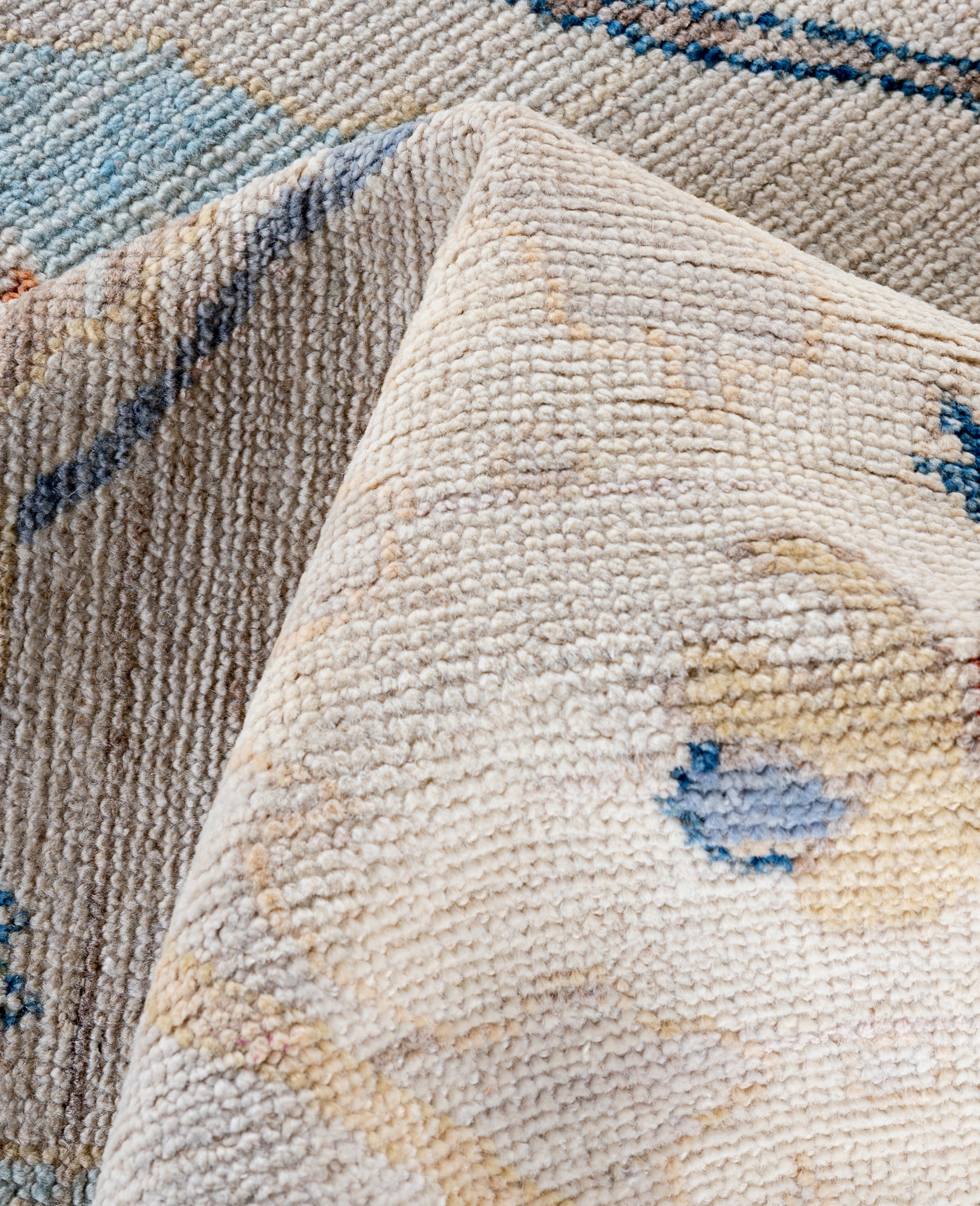 Oushak rugs are known for their soft, muted color palettes and large-scale, flowing designs. They often feature soft tones like beige, cream, gold, and light blue, with motifs that include palmettes, vines, and geometric shapes. These rugs are distinguished by their loose, open patterns, giving them an airy and elegant feel. Originating from the town of Oushak, they emphasize simplicity and a more relaxed aesthetic compared to other ornate designs. Hand-knotted using high-quality wool, Oushak rugs are celebrated for their luxurious texture and durability. Their timeless, understated beauty makes them popular in both traditional and contemporary interiors.